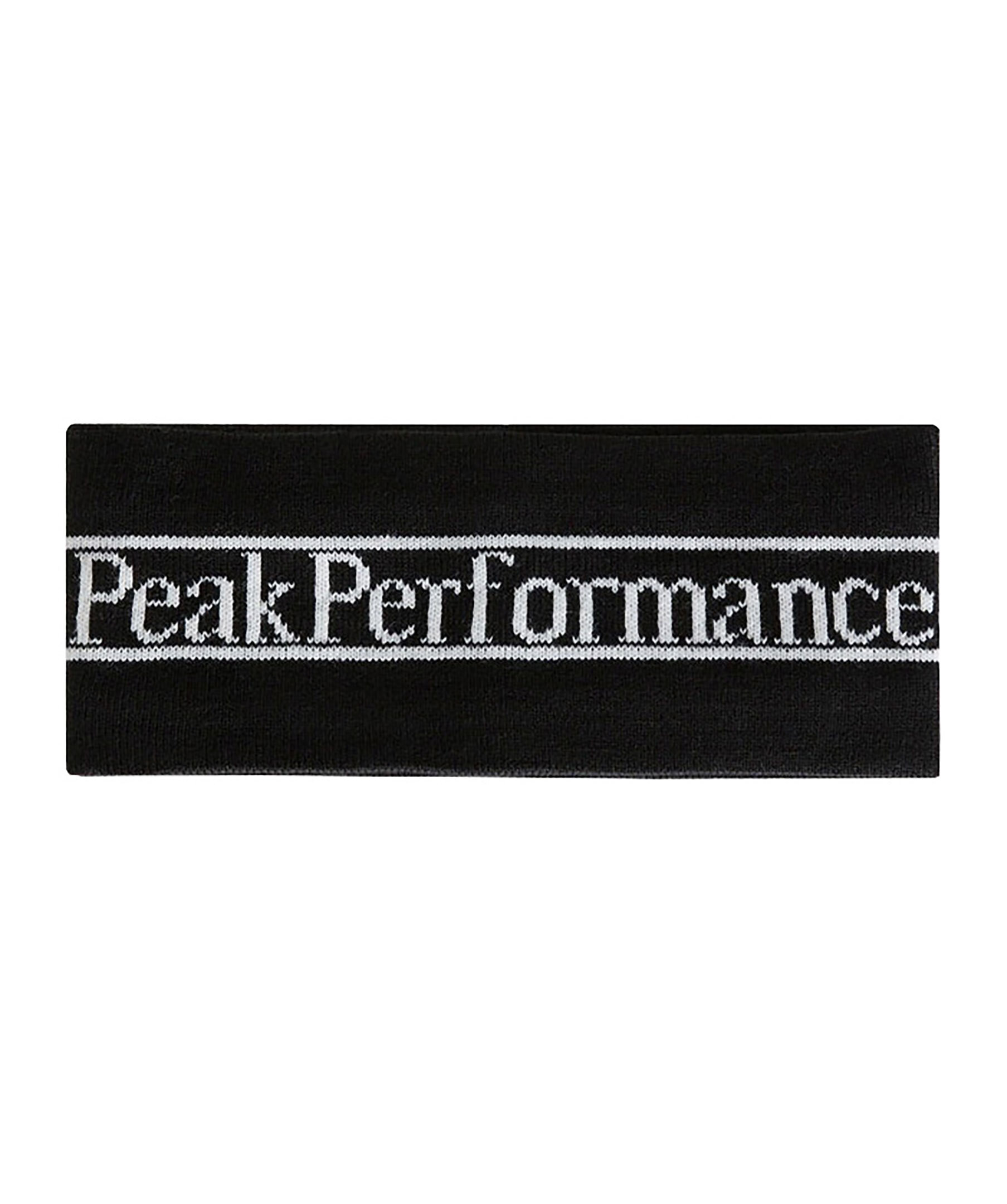 Svart, stickat pannband från Peak Performance. Två vita stretck och stor instickad vit logotyp i mitten på mössan.