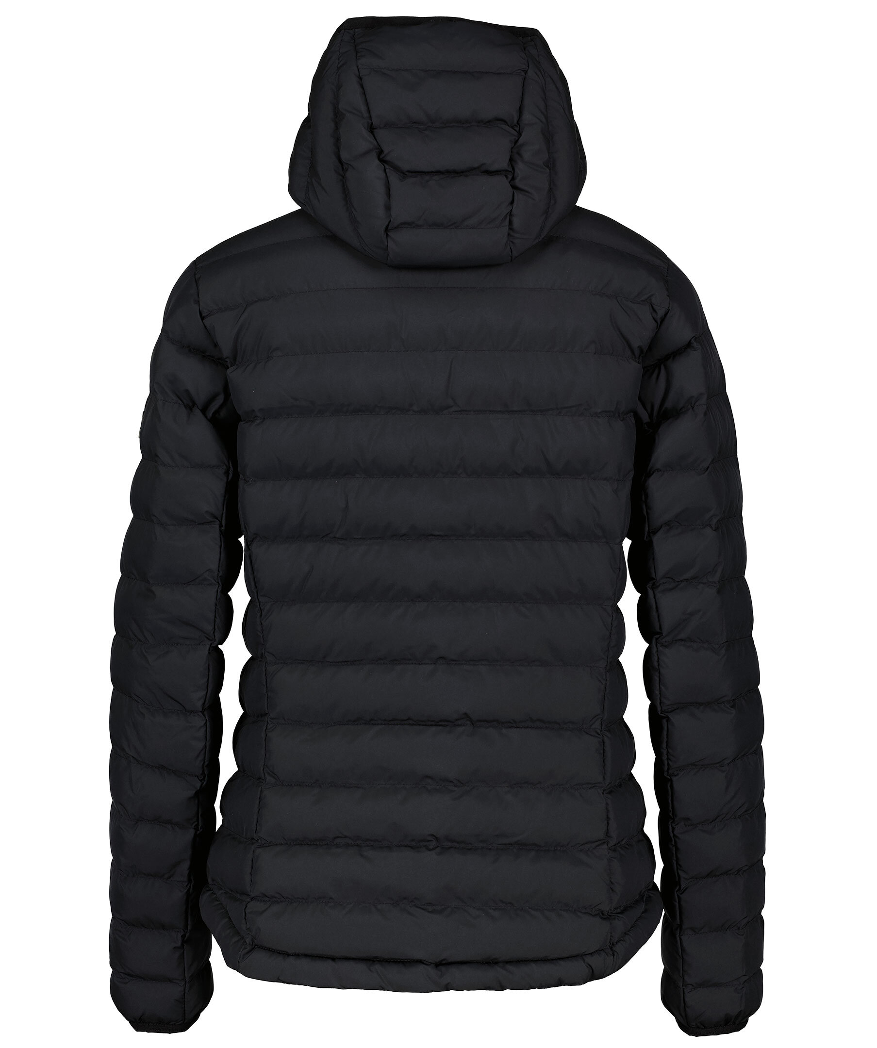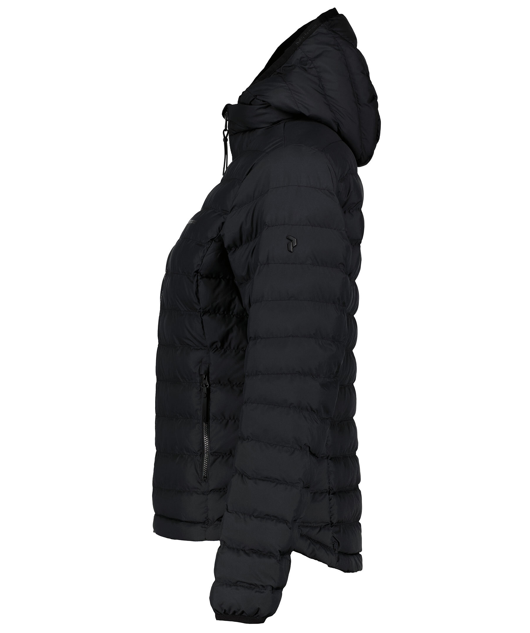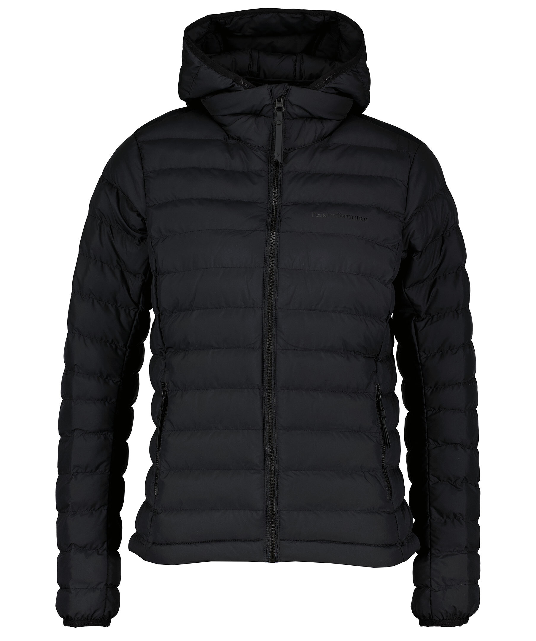 Kort, svart jacka med avtagbar luva i vattenavstötande återvunnen polyester från Peak Performance. Jackan stängs med dragkedja och har två framfickor som också stängs med dragkedjor. Diskret logga på bröstet, dragsko vid plaggslut och små, elastiska muddar i ärmar och luva. Luvan är fäst med dragkedja och kan tas av.