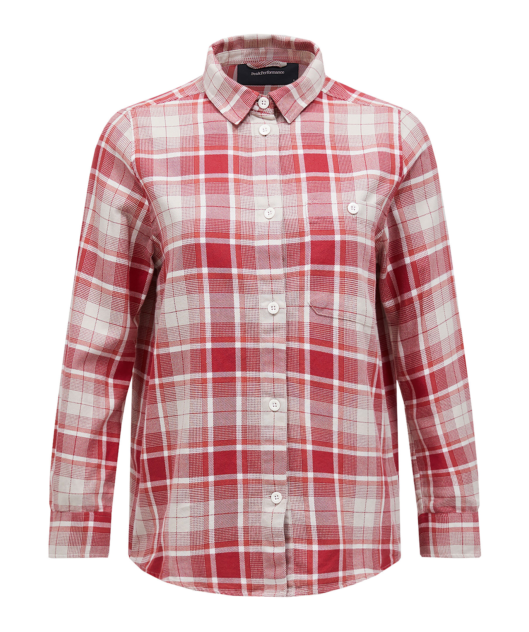 Flanellskjorta från Peak Performance i en beige samt röd rutigt mönster. Tillverkad av 100% bomull som har borstats på båda sidor och känns otroligt mjuk. Något avslappnad passform, rundade sidor. Formad nederkant. Stängs med vita knappar. En bröstficka med knäppning. Ärmslut med knäppta slitsar.