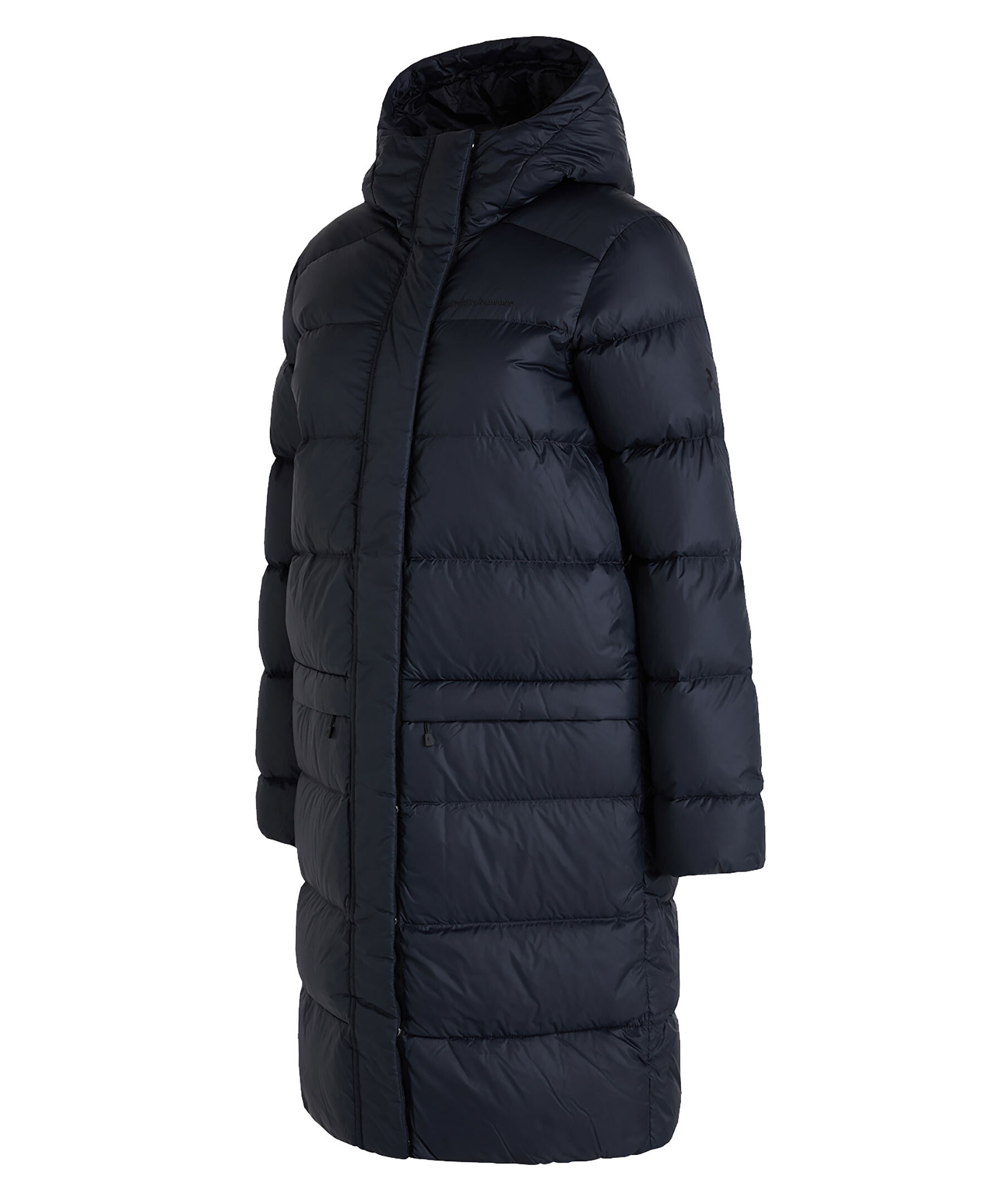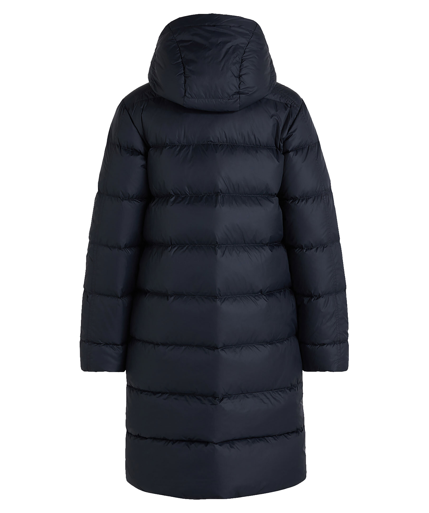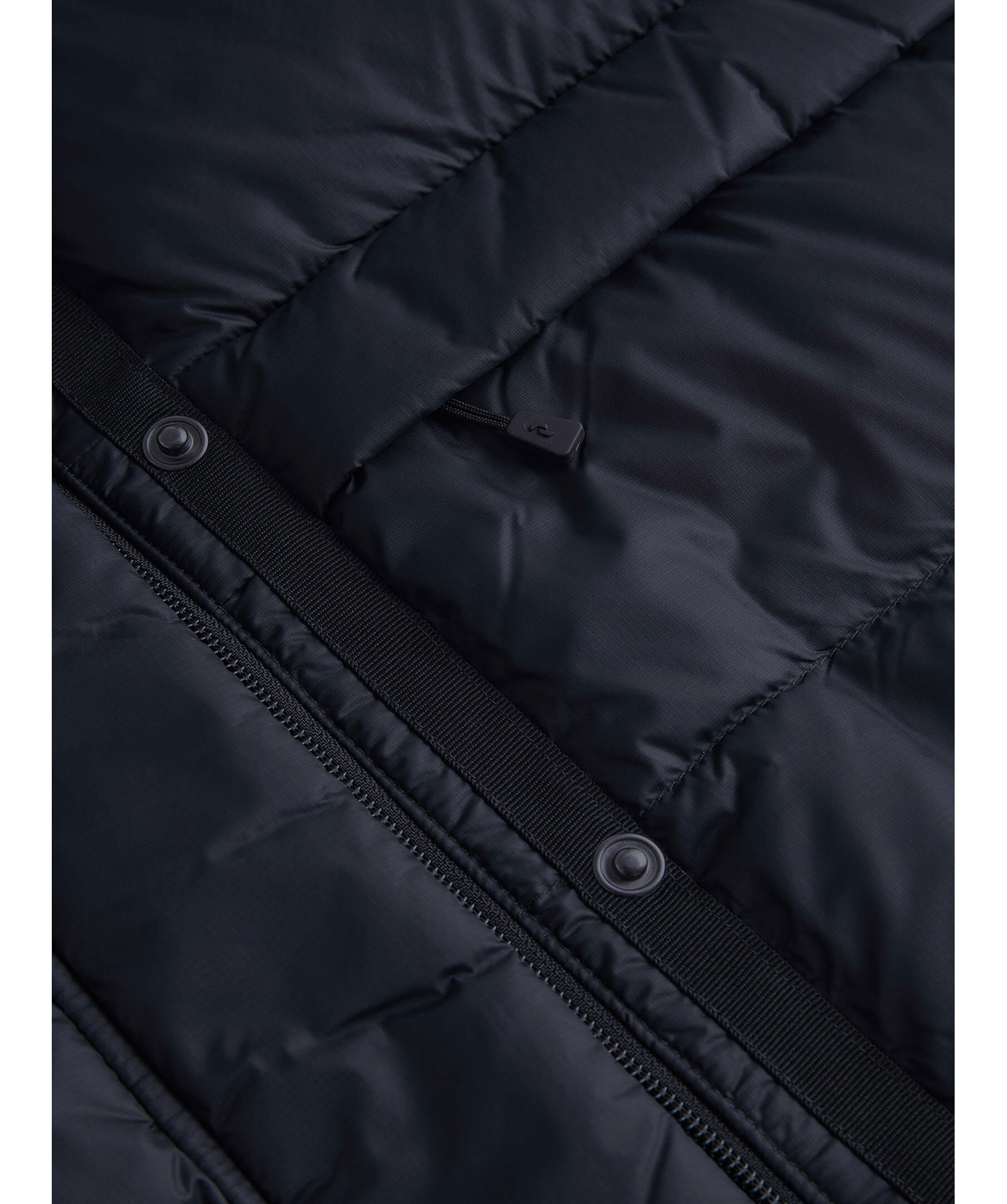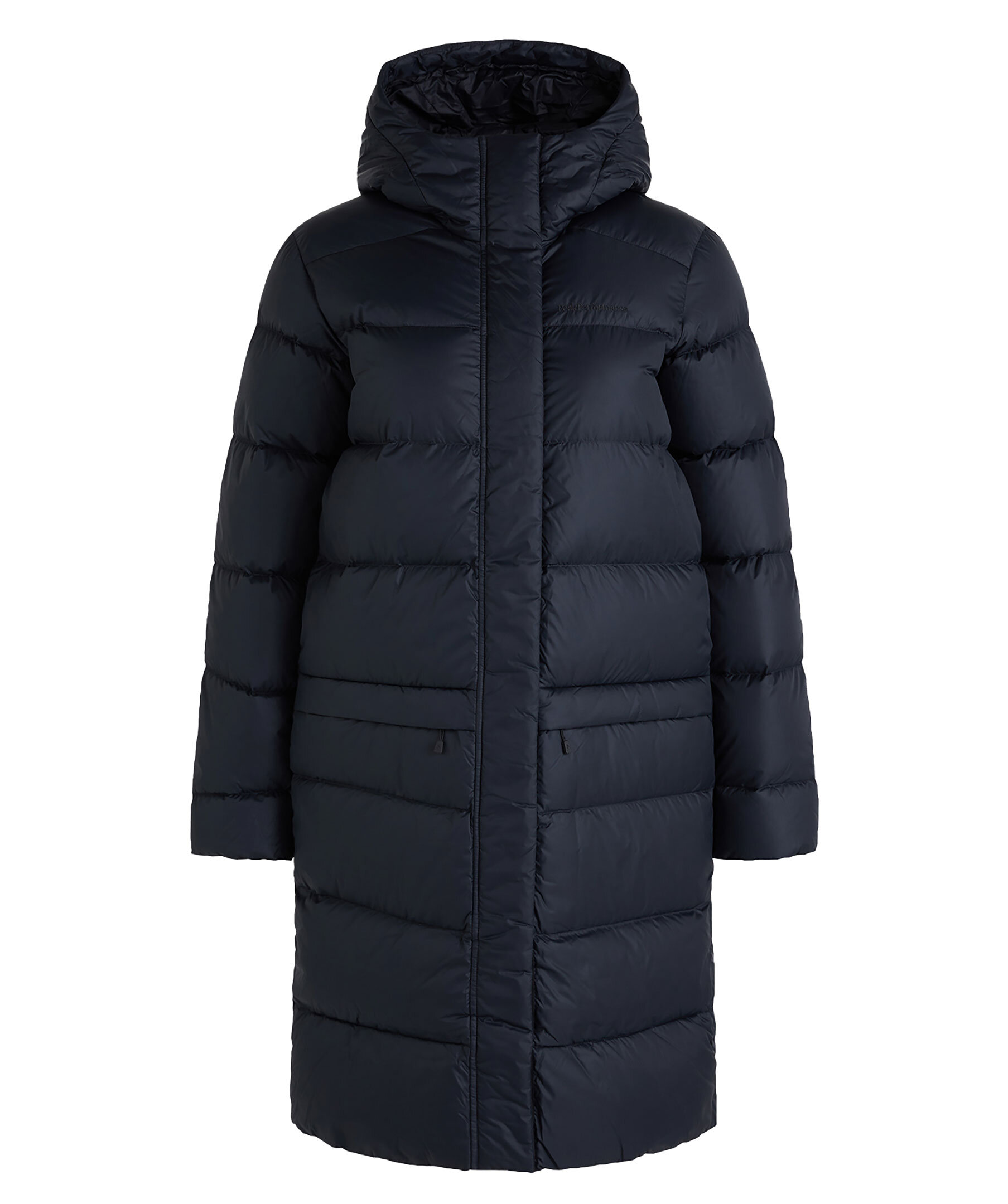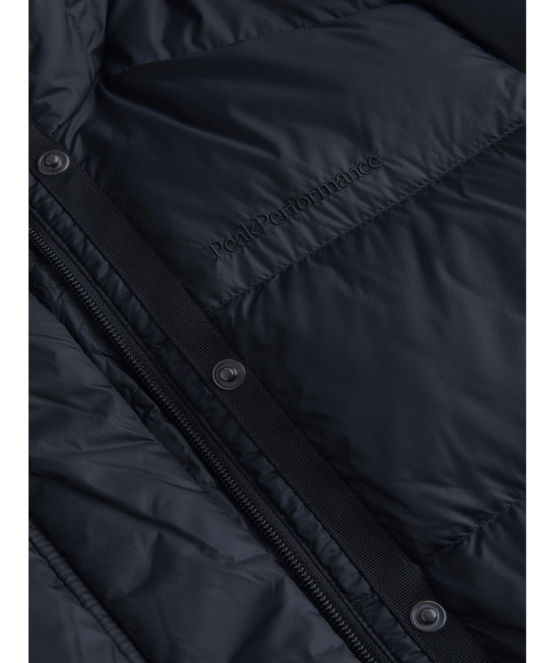 Svart dunkappa från Peak Performance. Tillverkad av återvunnen polyamid och försedd med en otroligt värmande 90/10-vaddering med ankdun/fjäder av högsta kvalitet och 700 fill power. Elastiska ärmslut med tumhål, fickor med dragkedjor och justerbar luva. Hellång YKK Coil 2-vägsdragkedja fram, fleecefodrat hakskydd och stormsprund. Fast huva elastisk dragsko på insidan, handfickor med dragkedja och innerficka med dragkedja. Yttre upphängningsögla i nacken, Peak Performance-brodyr på bröstet och P-logotyp brodyr på ärmen.