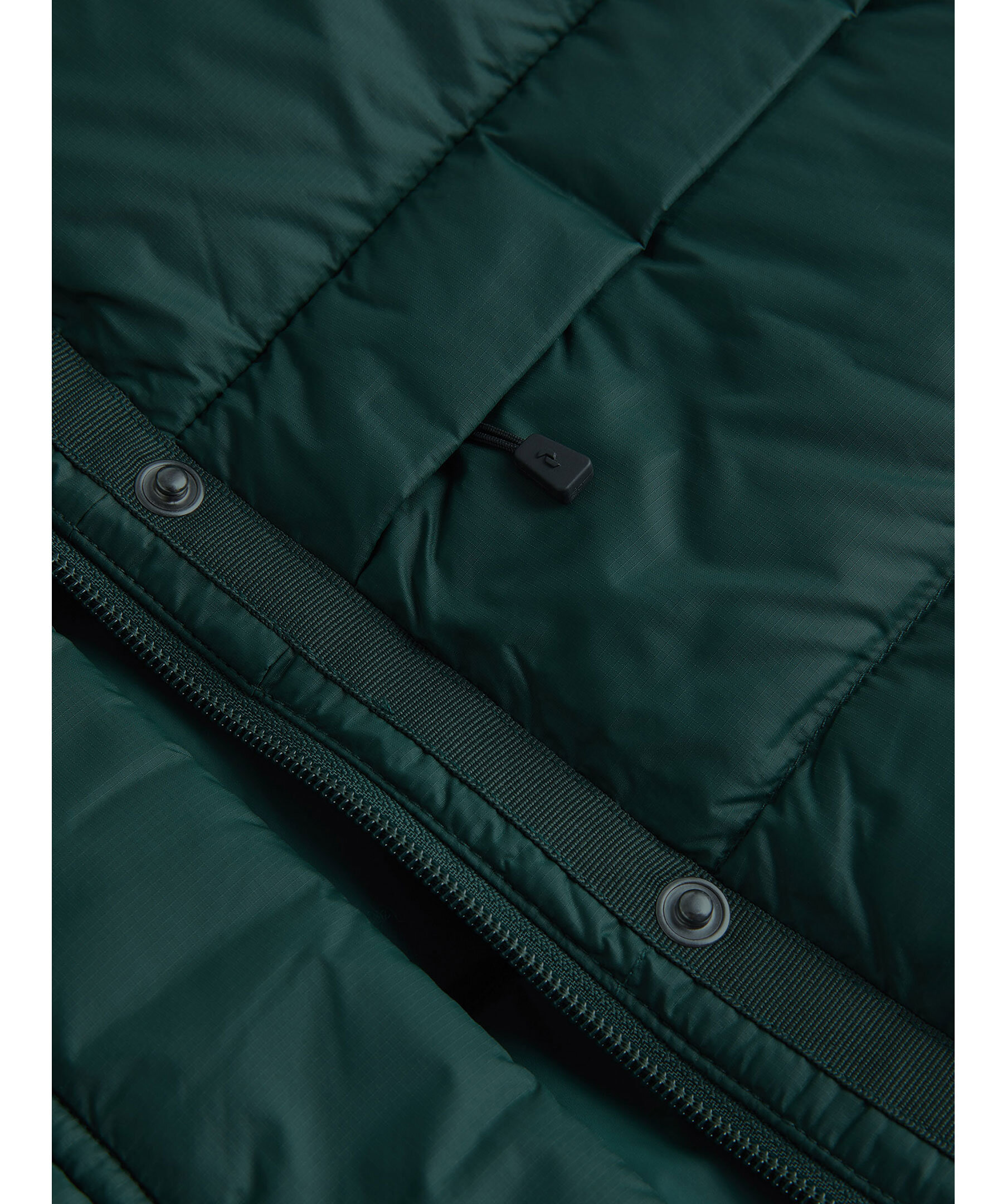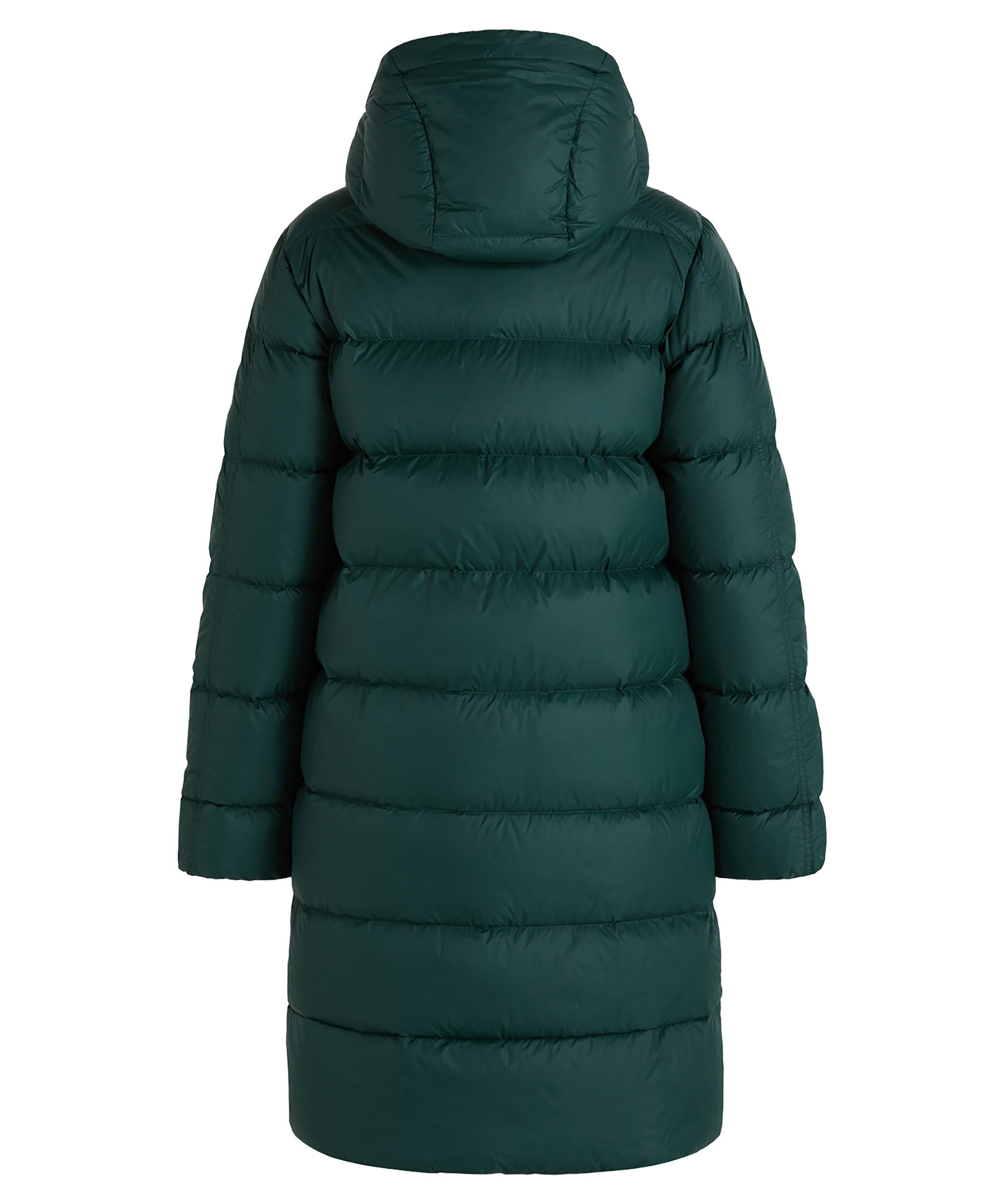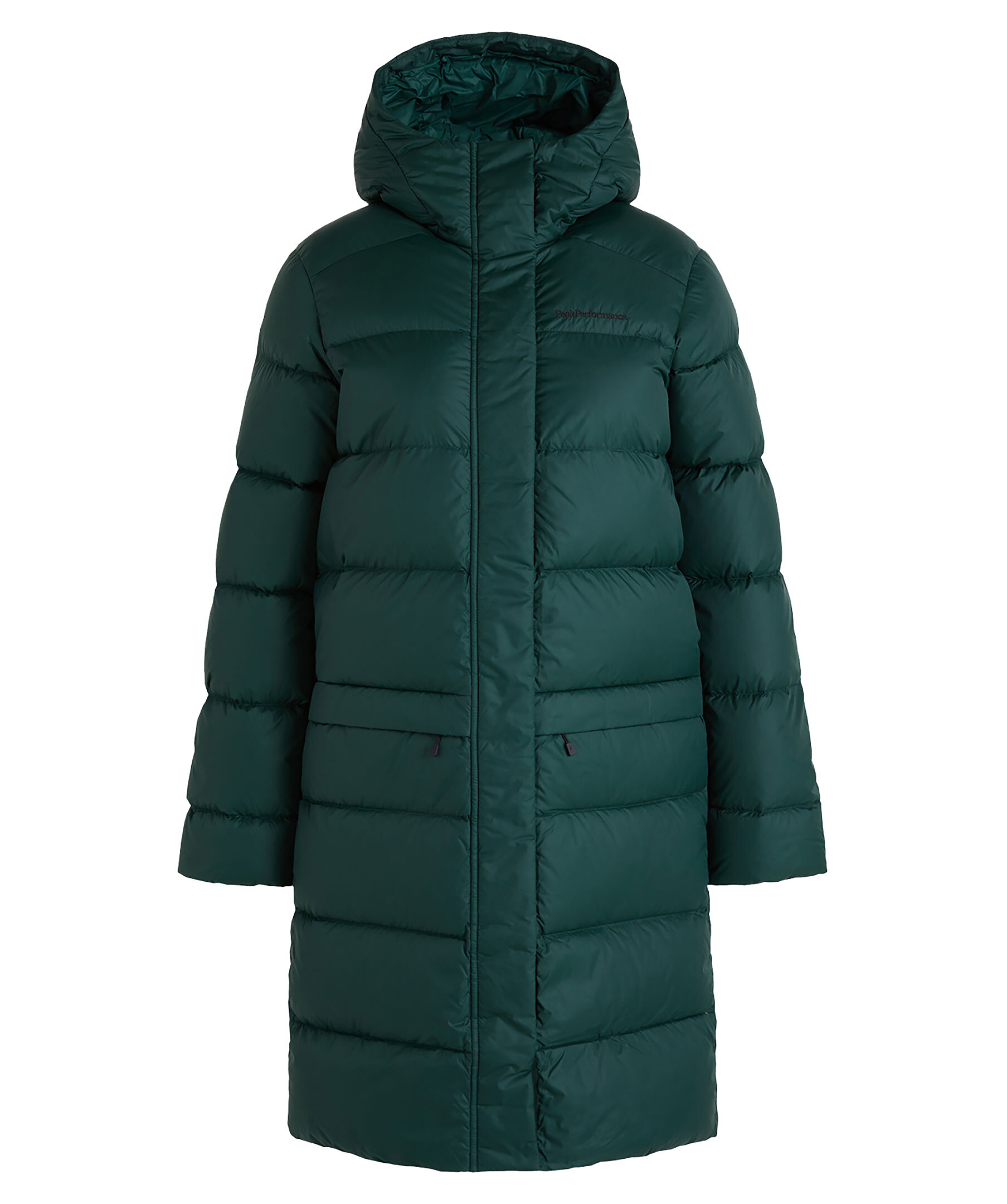 Mörkgrön dunkappa från Peak Performance. Tillverkad av återvunnen polyamid och försedd med en otroligt värmande 90/10-vaddering med ankdun/fjäder av högsta kvalitet och 700 fill power. Elastiska ärmslut med tumhål, fickor med dragkedjor och justerbar luva. Hellång YKK Coil 2-vägsdragkedja fram, fleecefodrat hakskydd och stormsprund. Fast huva elastisk dragsko på insidan, handfickor med dragkedja och innerficka med dragkedja. Yttre upphängningsögla i nacken, Peak Performance-brodyr på bröstet och P-logotyp brodyr på ärmen.