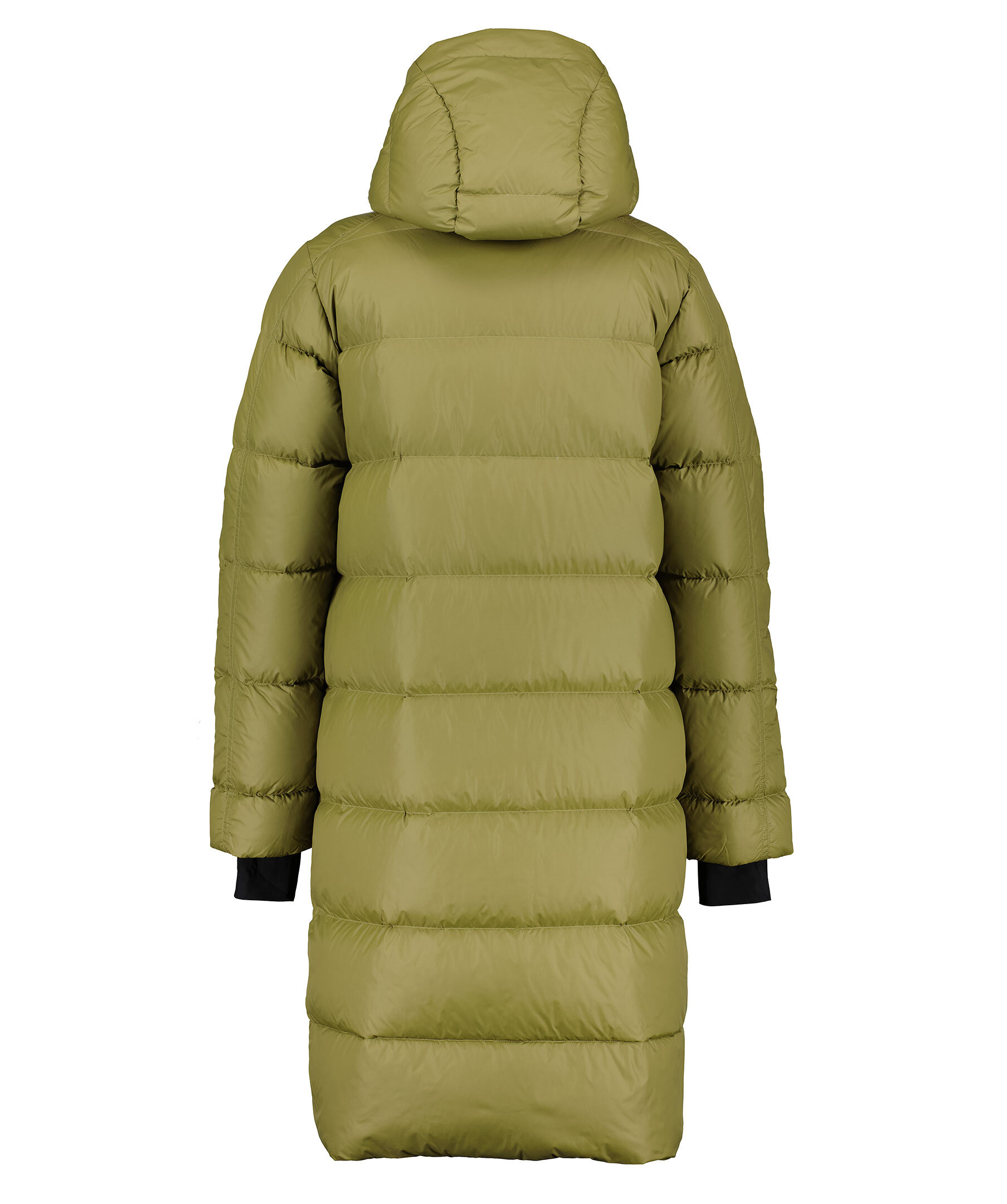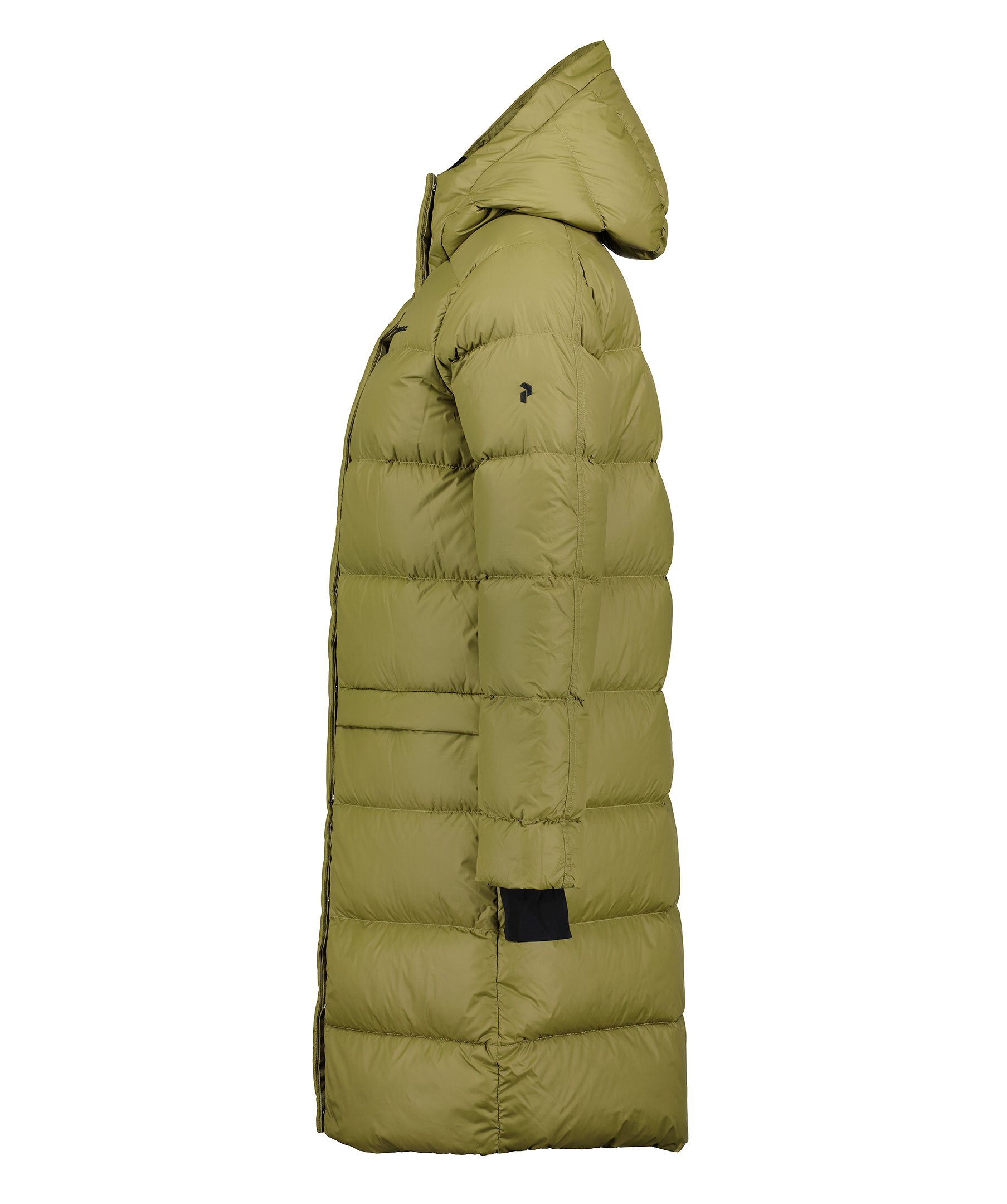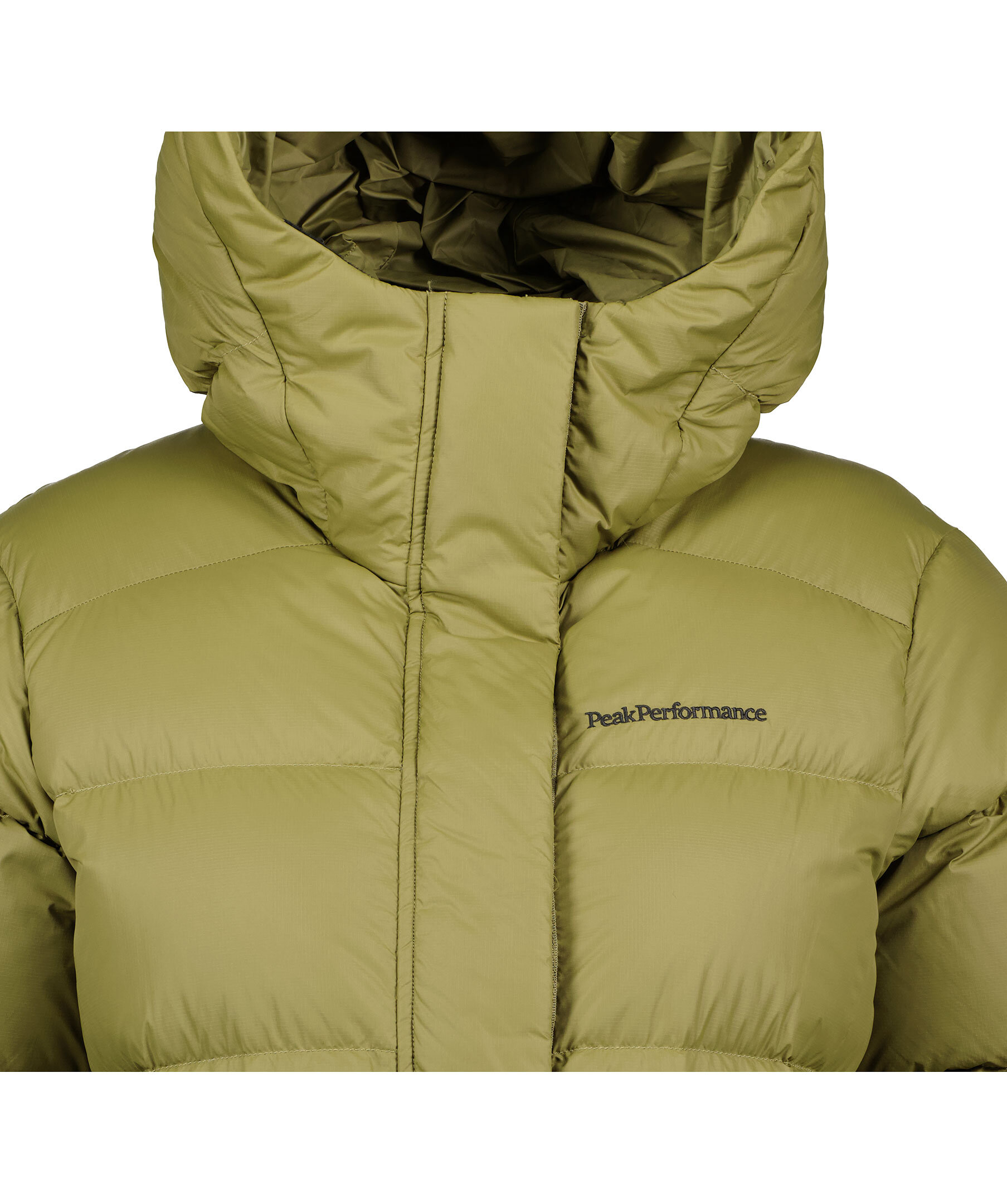 Grön dunkappa från Peak Performance. Tillverkad av återvunnen polyamid och försedd med en otroligt värmande 90/10-vaddering med ankdun/fjäder av högsta kvalitet och 700 fill power. Elastiska ärmslut med tumhål, fickor med dragkedjor och justerbar luva. Hellång YKK Coil 2-vägsdragkedja fram, fleecefodrat hakskydd och stormsprund. Fast huva elastisk dragsko på insidan, handfickor med dragkedja och innerficka med dragkedja. Yttre upphängningsögla i nacken, Peak Performance-brodyr på bröstet och P-logotyp brodyr på ärmen.