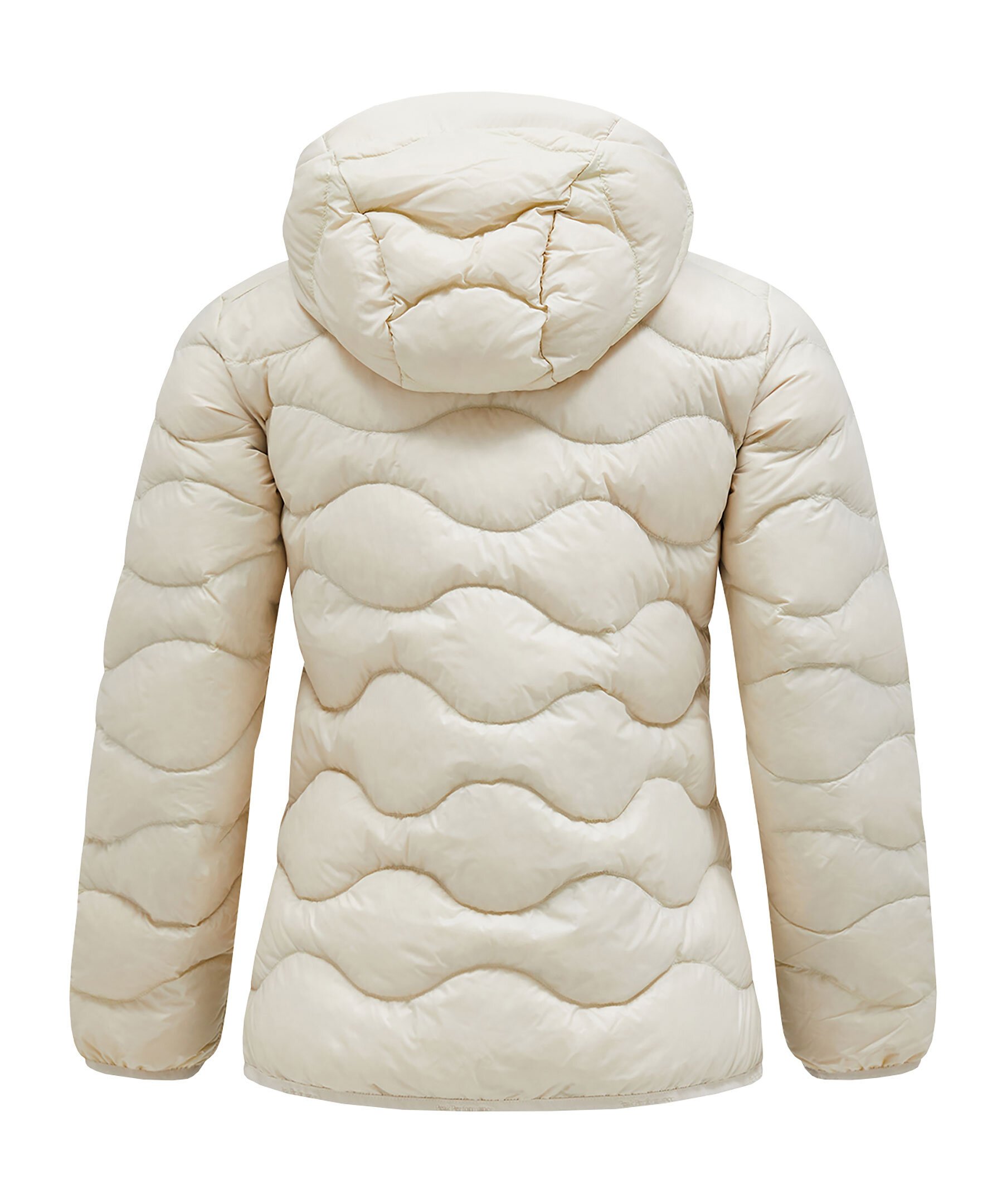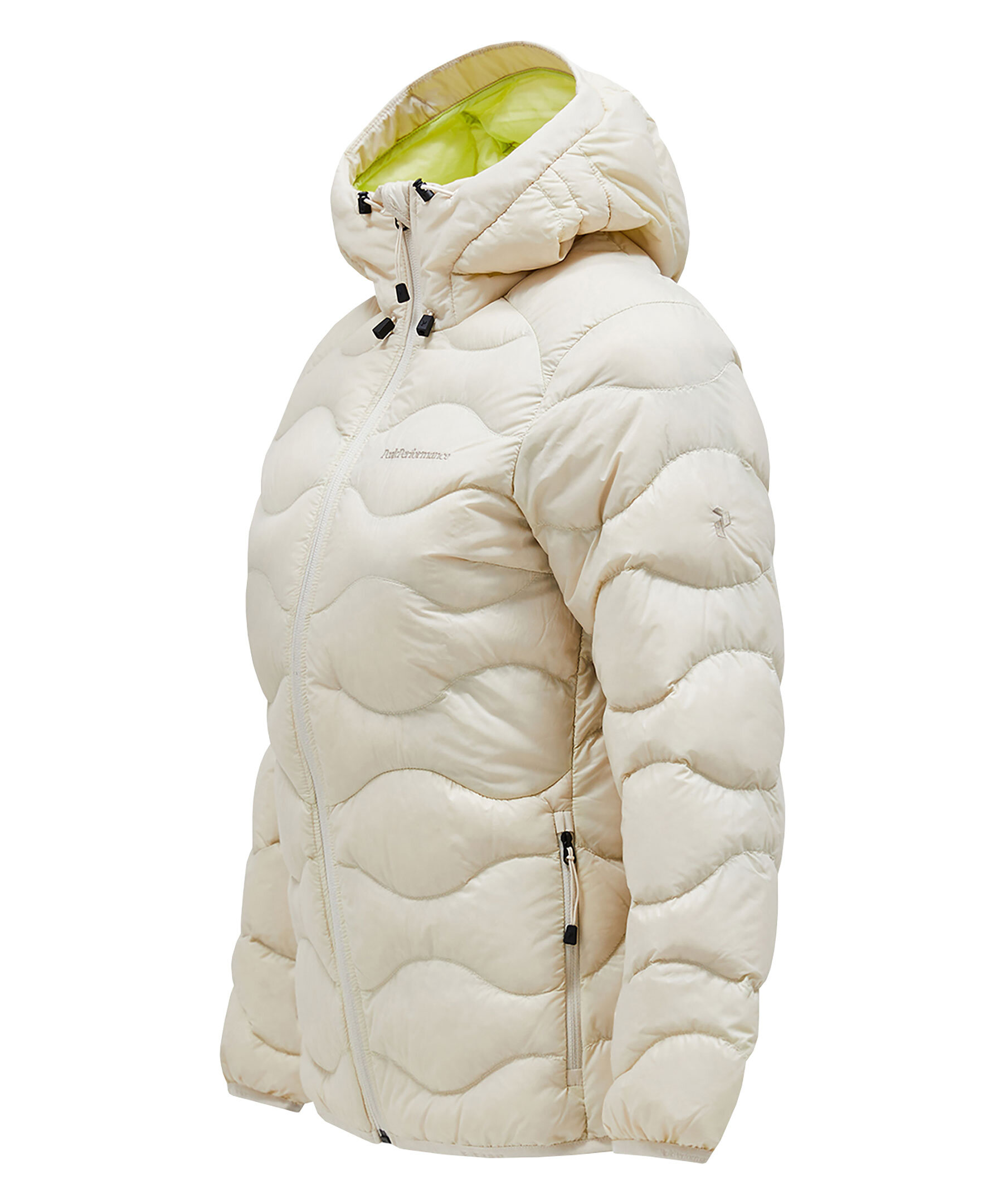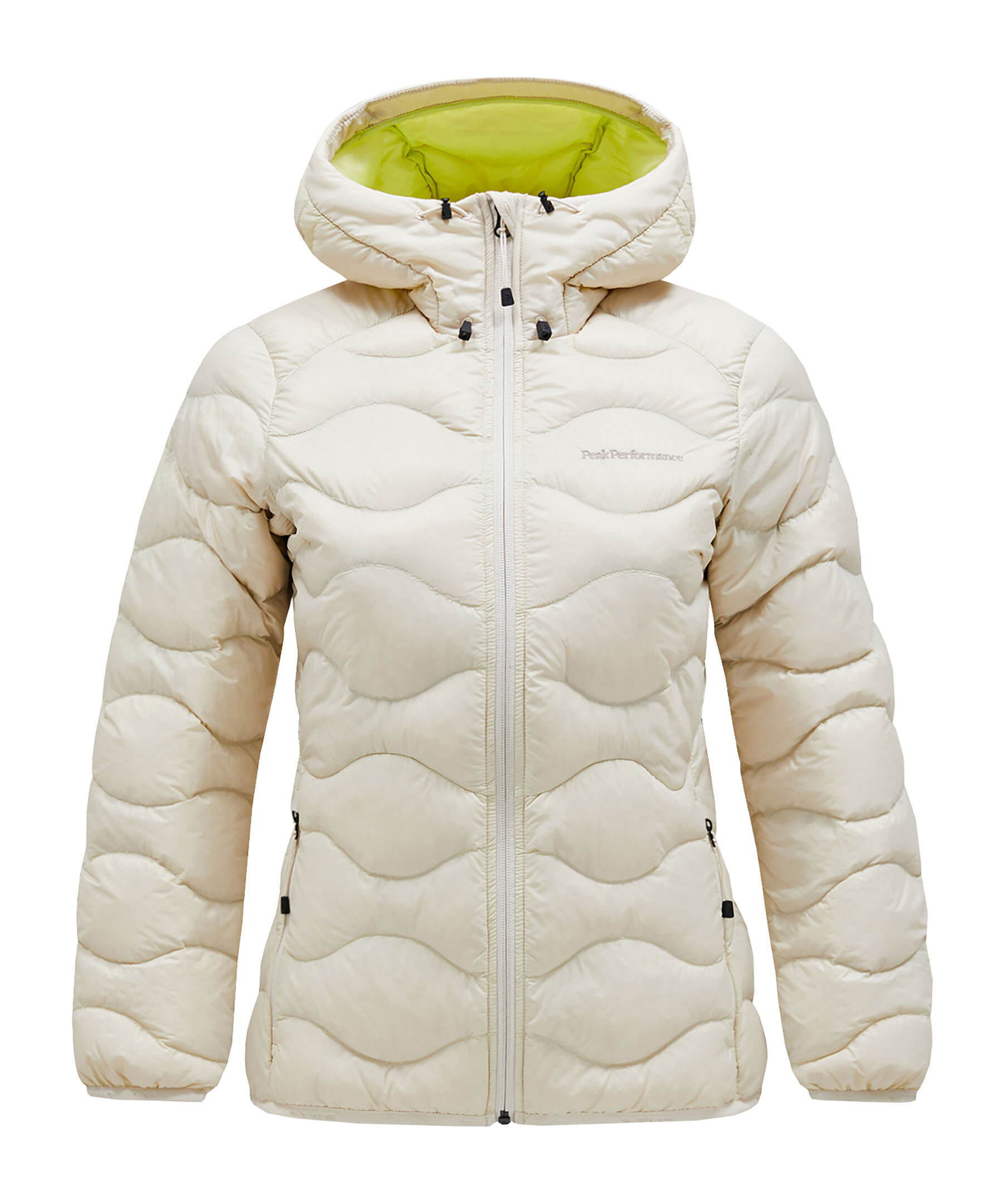 Quiltad sandfärgad jacka från Peak Performance med deras Helium mönster. Tillverkad i återvunnen polyamid som är helt PFC-fr. Har ett vind- och vattenavvisande skal tillsammans med högkvalitativ 90/10-dunvaddering. Logotyp på vänster sida av bröstet. Två sidfickor som stängs med dragkedja. Jackan stängs även med dragkedja i mitten av plagget. Huva där insidan är i en grön neon-nyans. Tvåvägs justerbar huva (höjd och bredd). Elastisk bindning i nederkant och ärmslut. Yttre upphängningsögla i nacken.