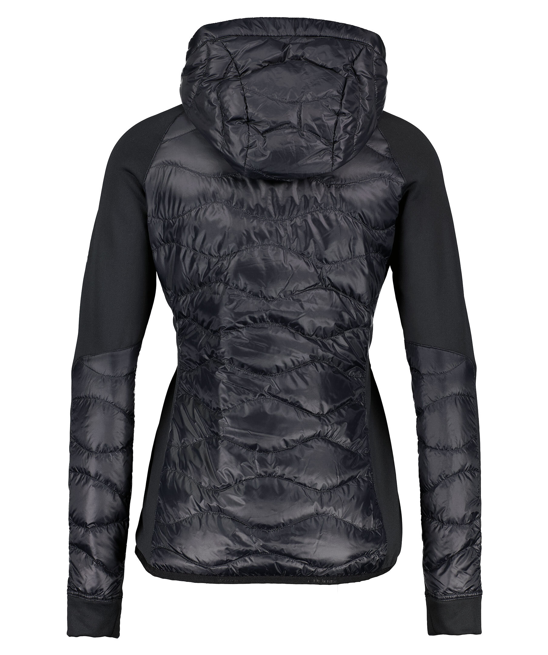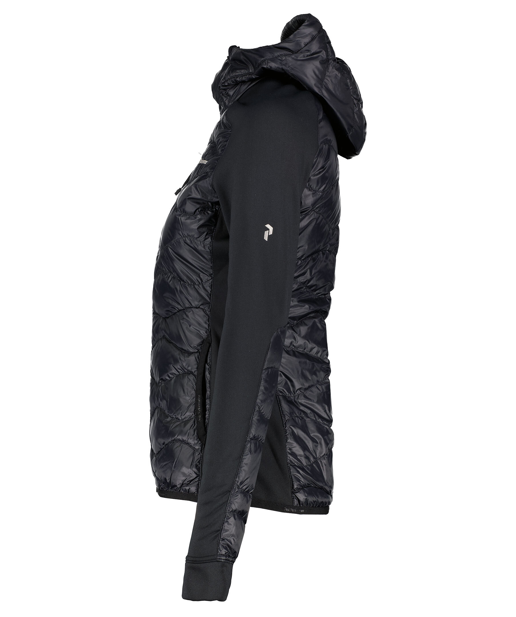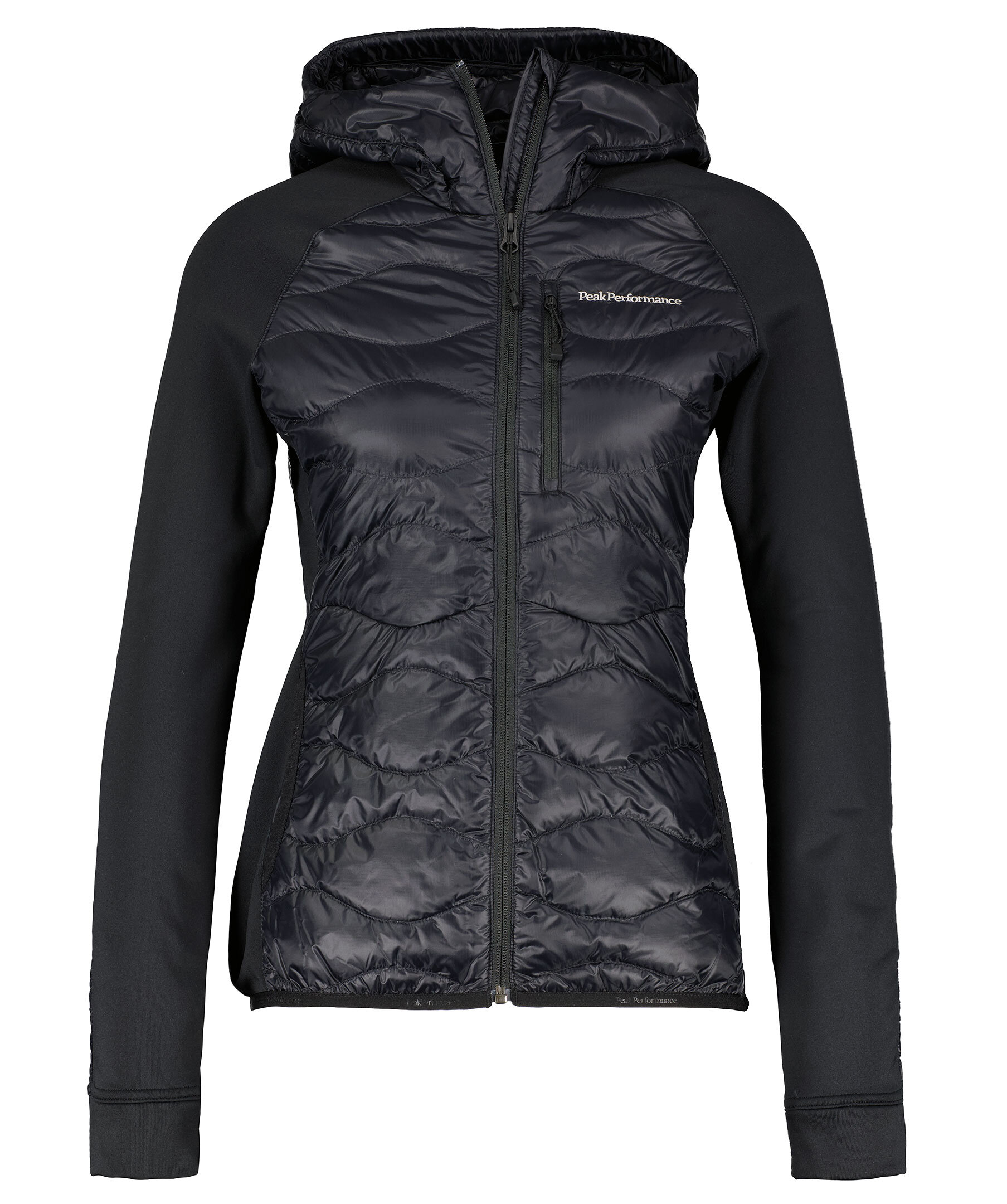 Svart hybridjacka från Peak Performance. Paneler i dun på jackans framsida, ryggen och ärmarna. Stängs framtill med dragkedja. Bröstficka som stängs med dragkedja, två fickor i sidan. Broderad logotyp på vänster ärm och bröst. Smal resår med logotyp i jackslut.