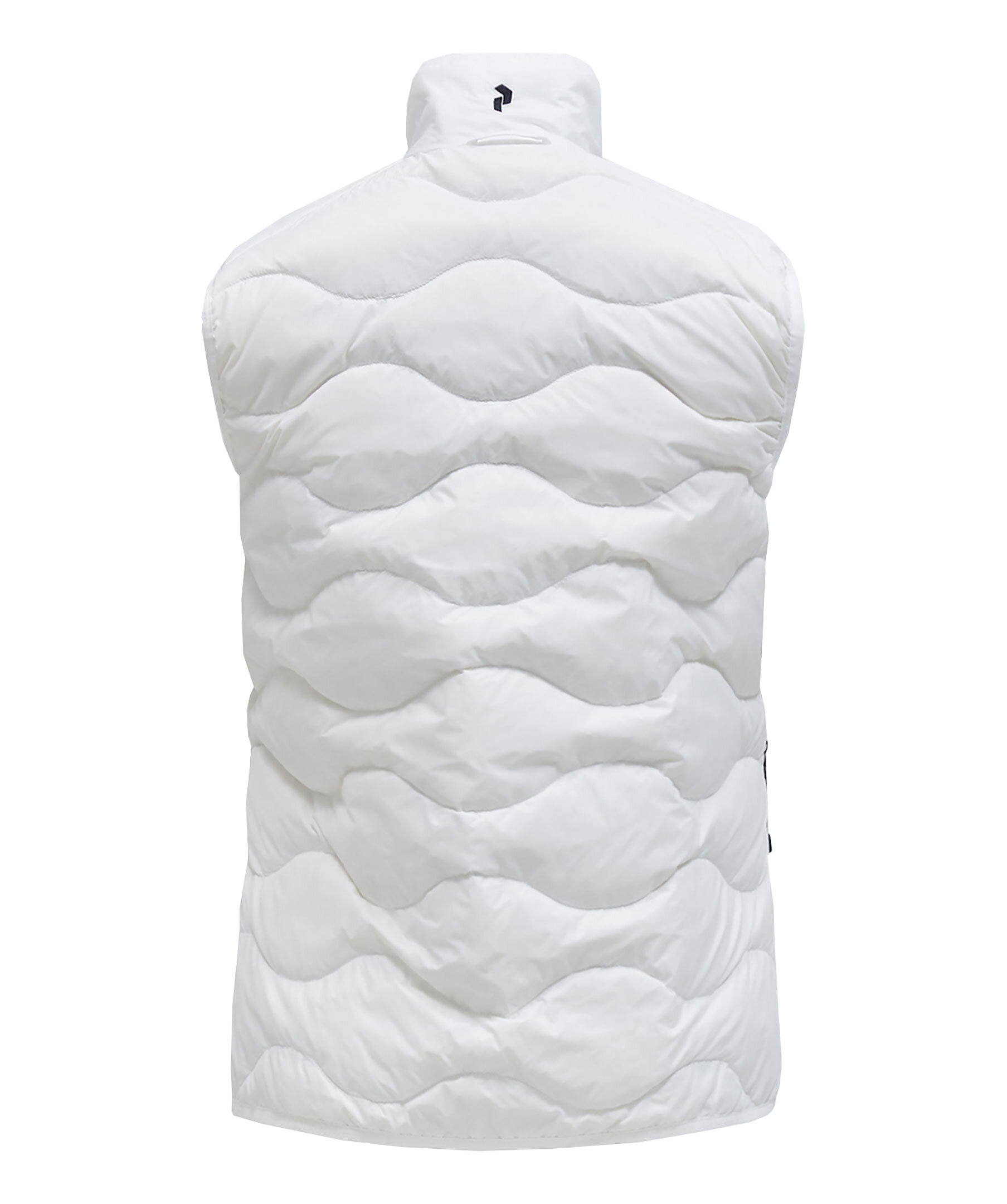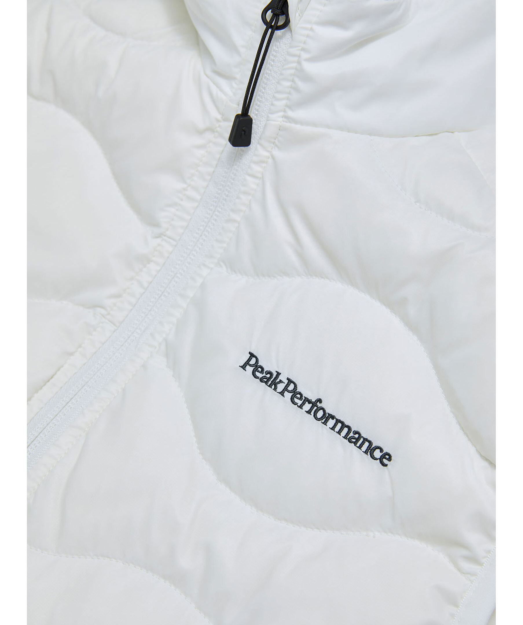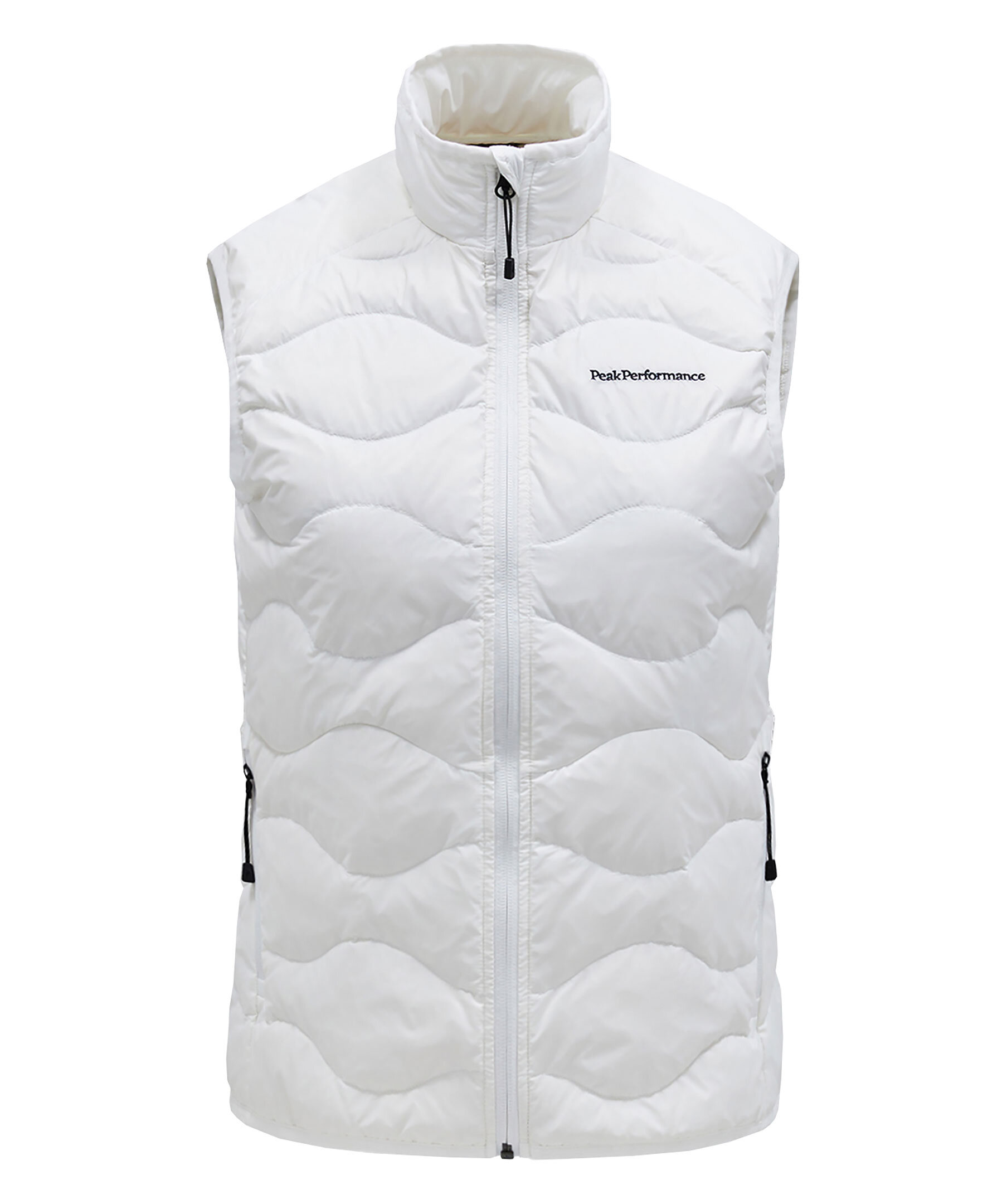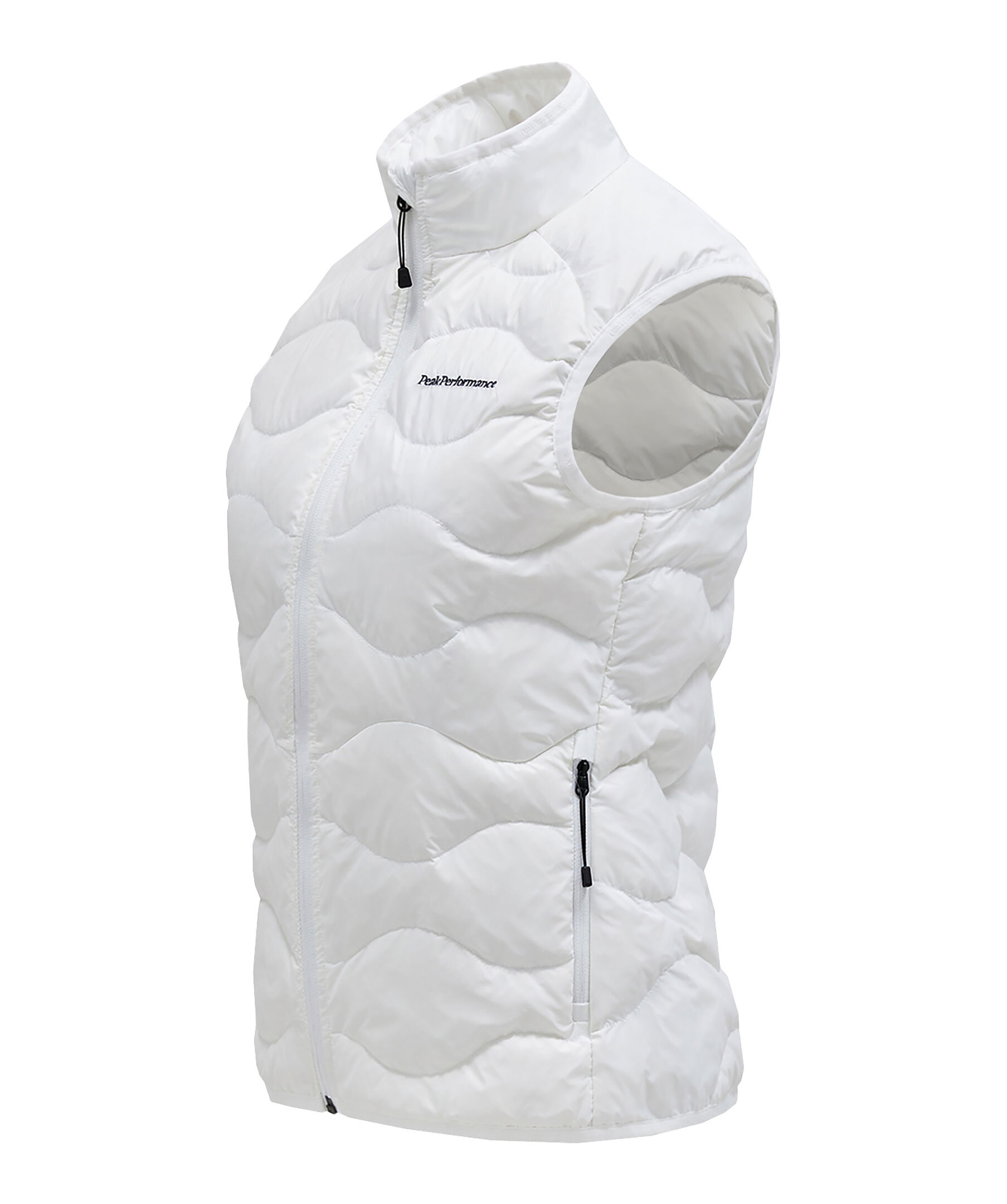 Quiltad väst från Peak Performance i färgen off-white och deras Helium mönster. Tillverkad i återvunnen polyamid som är helt PFC-fri. Har ett vind- och vattenavvisande skal tillsammans med högkvalitativ 90/10-dunvaddering. Svart logotyp på vänster sida av bröstet. Liten svart logotyp i nacken. Två sidfickor som stängs med dragkedja. Västen stängs med dragkedja i mitten av plagget.