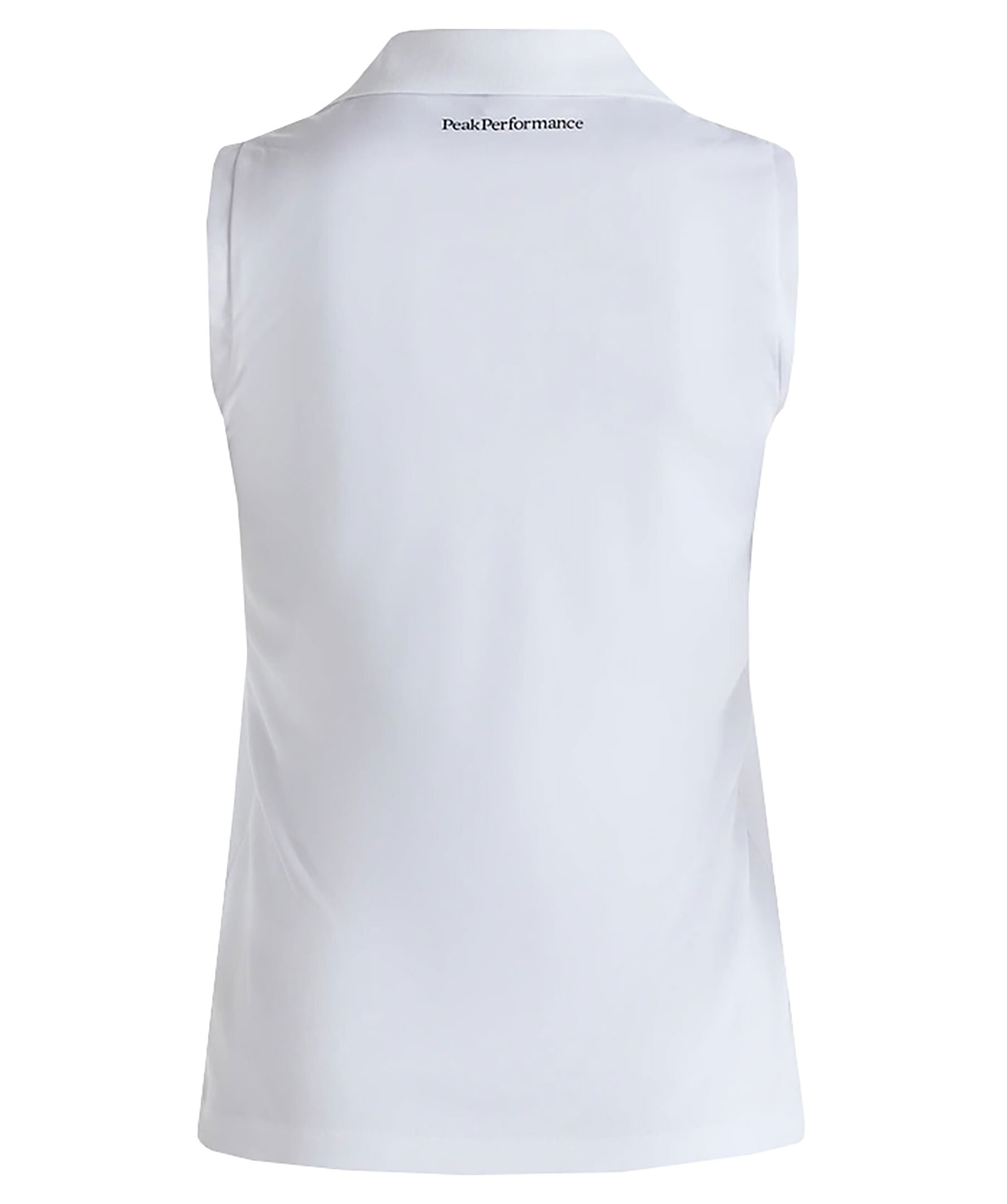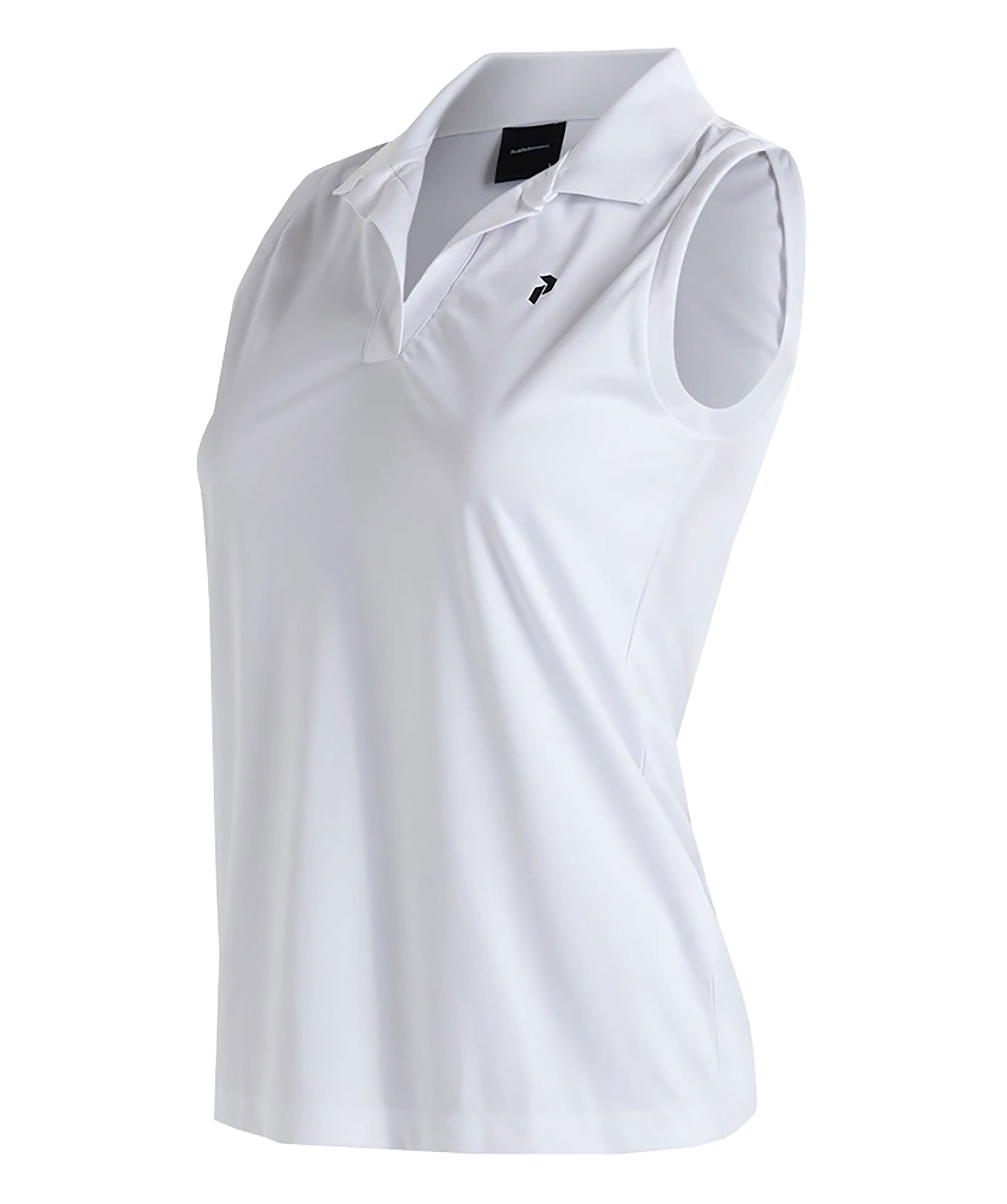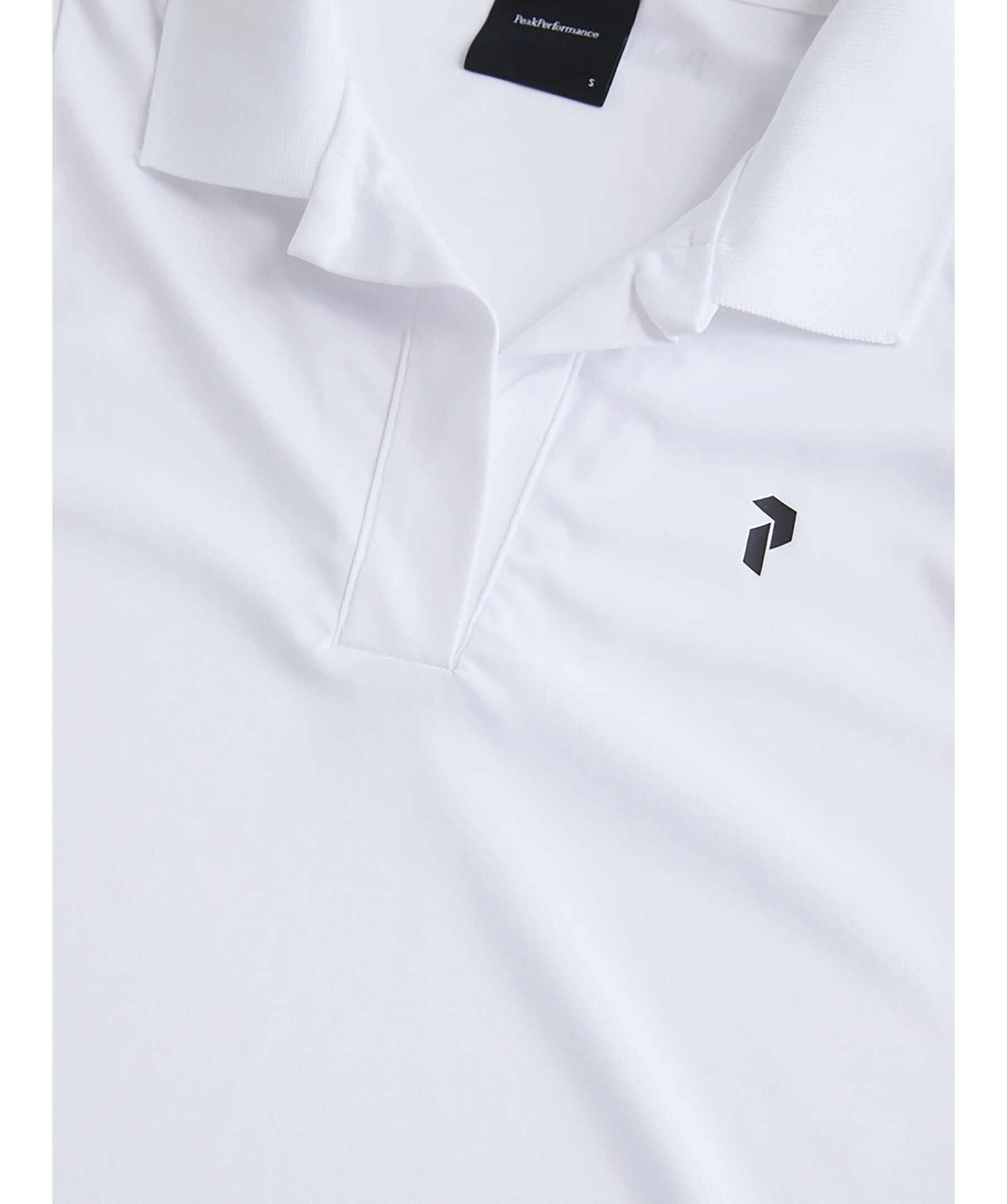 Vit avslappnad kortärmad golfpiké från Peak Performance. Tröjan är gjord i ett återvunnet polyester material som har snabbtorkande och fukttransporterande egenskaper. V-ringad halsöppning utan knappar. Tryckt logotyp på ena bröstet.