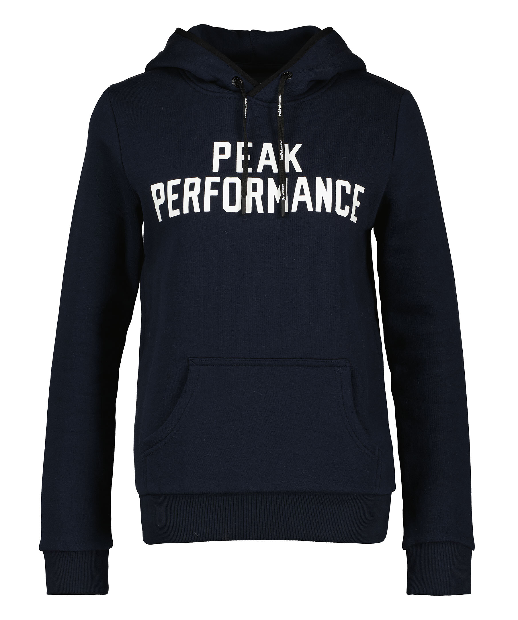 Marinblå hoodie från Peak Performance. Tillverkad i bomullsblandning. Luva med dragsko, svart snöre. Tryckt vit logotyp över bröstet. Känguruficka på magen. Ribbad mudd i plaggslut och ärmslut samt tunn svart kant på luvans kanter. Borstad insida.