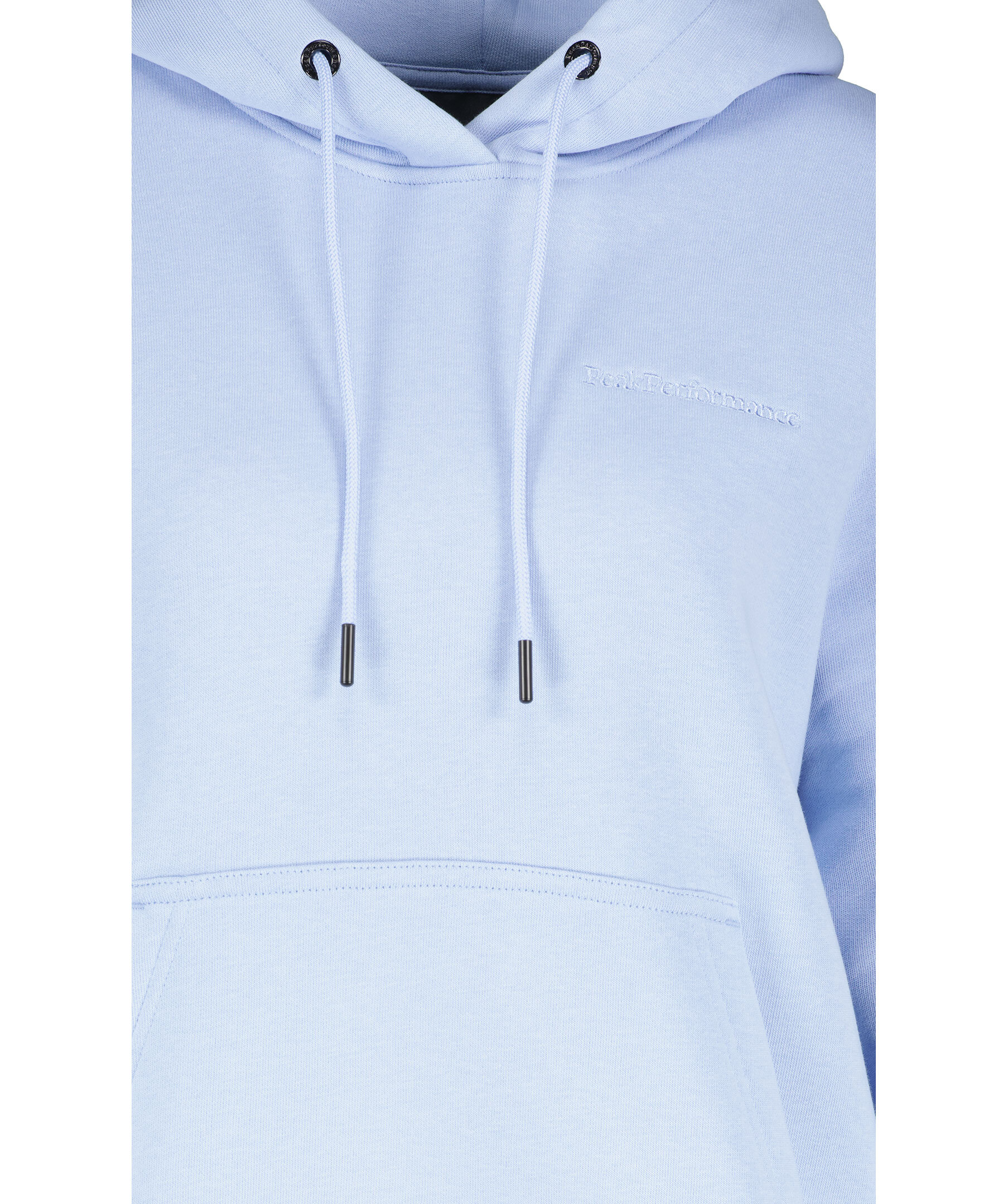 Ljusblå hoodie från Peak Performance. Tyget av högkvalitativ bomullsjersey har en borstad insida vilket gör att den känns otroligt mjuk och skön. Snörning i luvan, känguruficka på magen och broderad ton-i-ton logga på vänster sida av bröstet.
