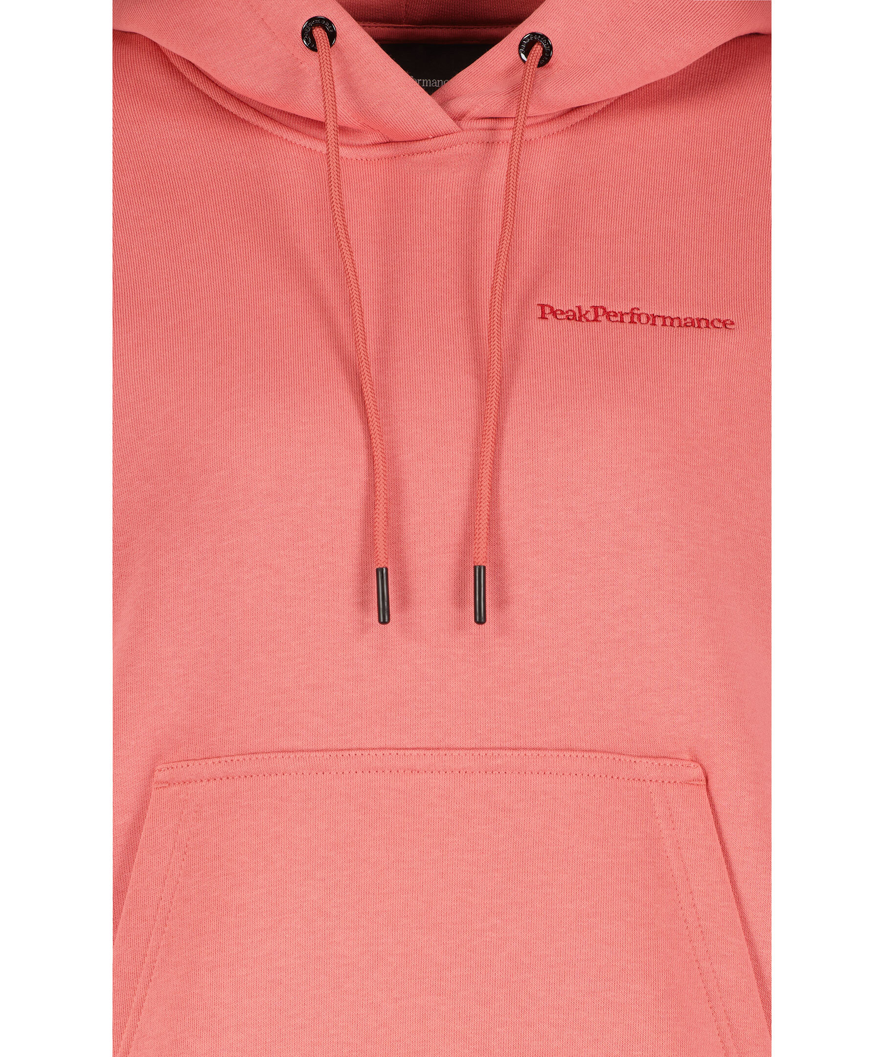 Korallfärgad hoodie från Peak Performance. Tyget av högkvalitativ bomullsjersey har en borstad insida vilket gör att den känns otroligt mjuk och skön. Snörning i luvan, känguruficka på magen och broderad ton-i-ton logga på vänster sida av bröstet.