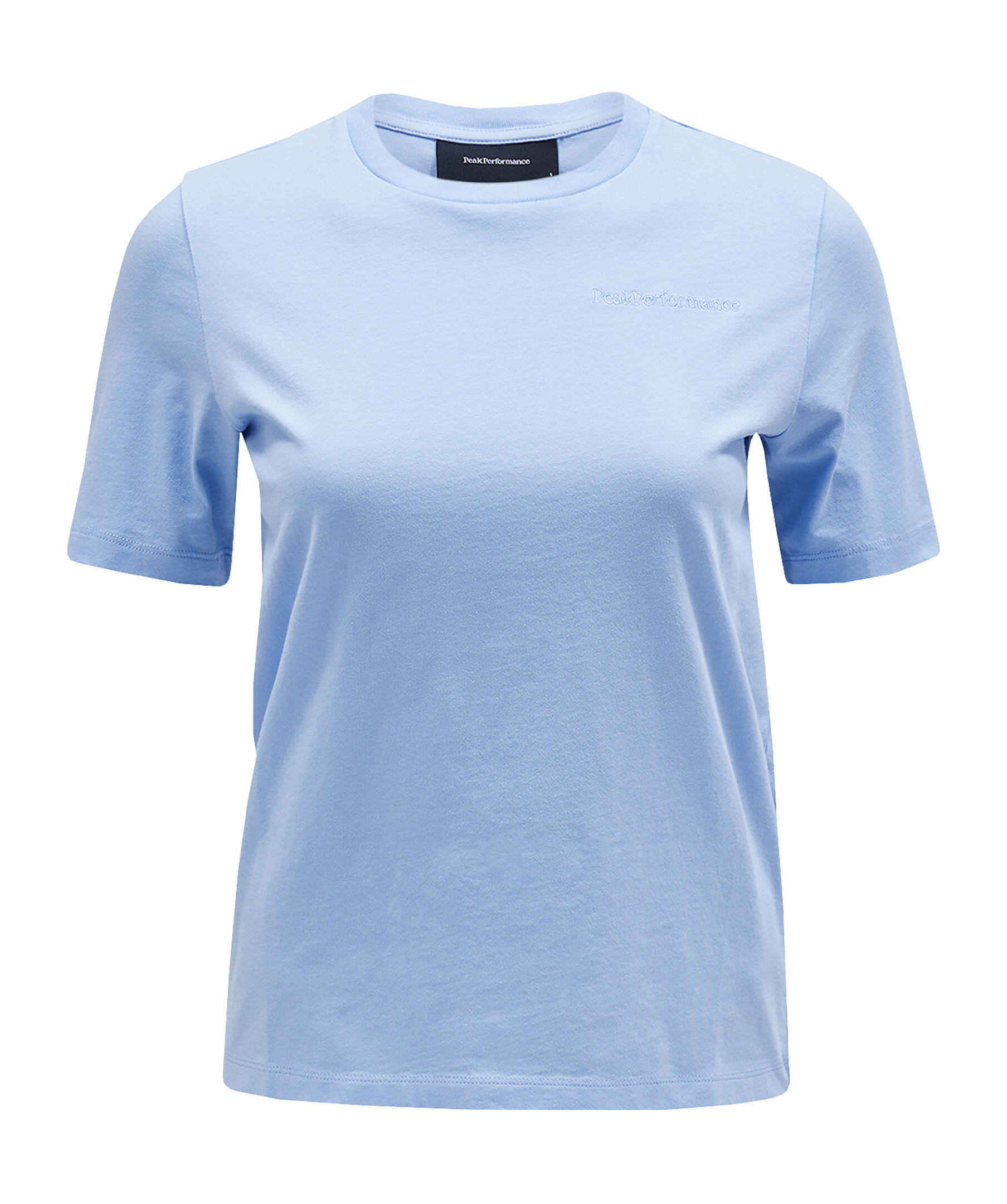 Ljusblå t-shirt från Peak Performance. Tillverkad av mjuk, förstklassig bomullsjersey som känns otroligt skön att bära. Rundad halsringning, broderad logotyp i ton-i-ton färg på vänster sida av bröstet.