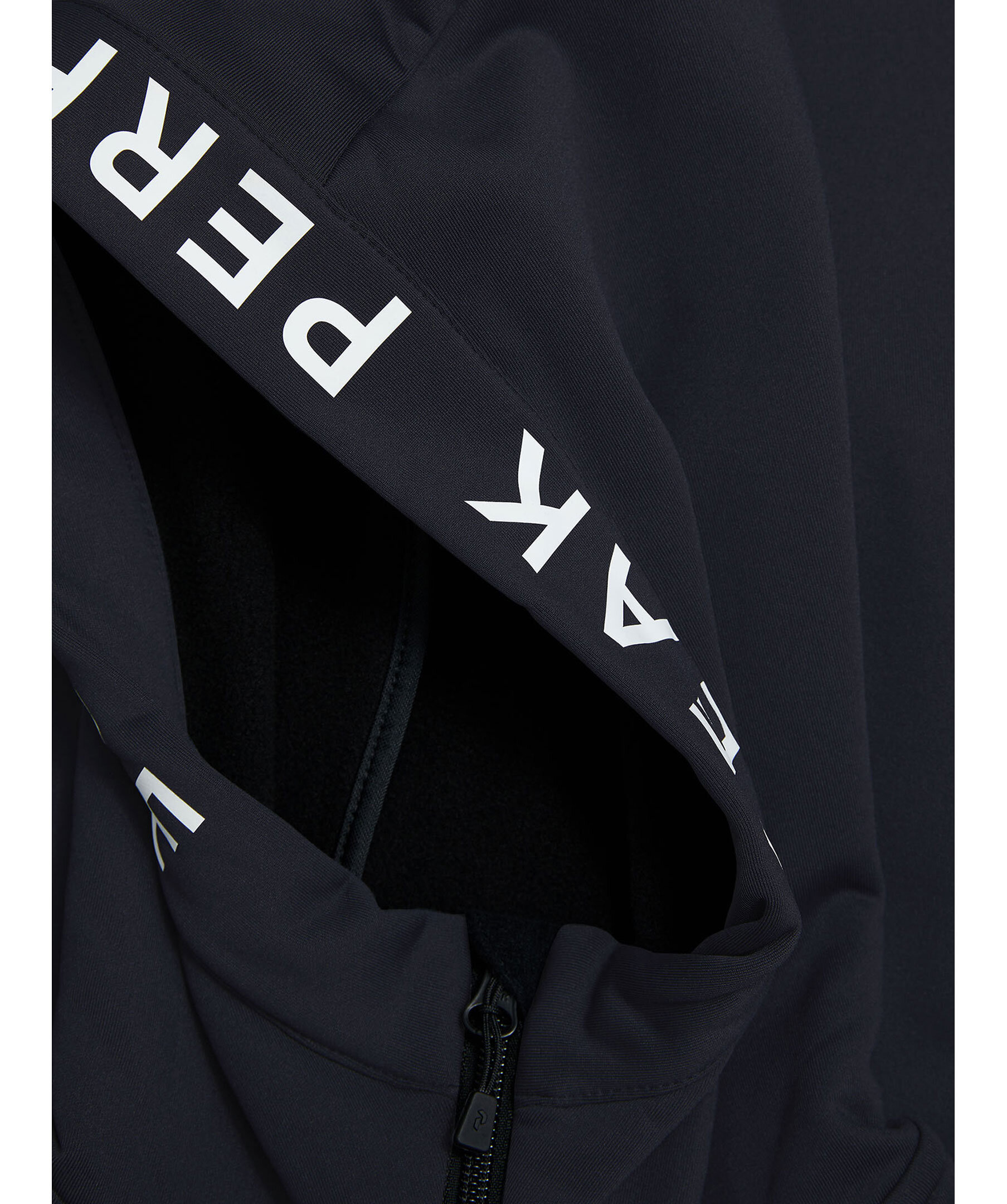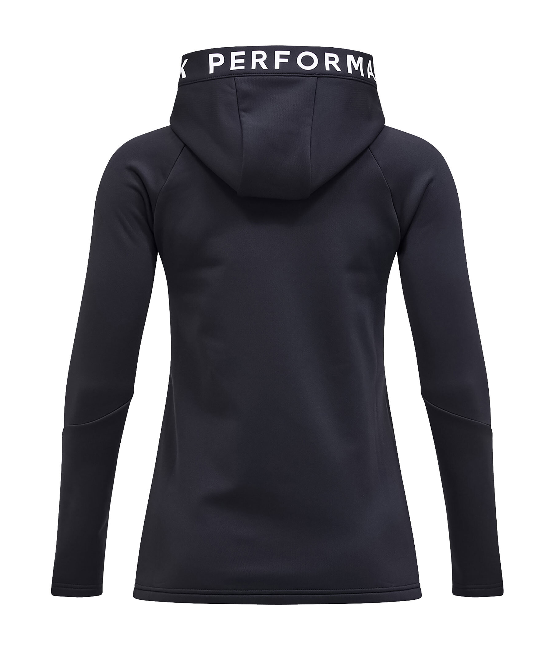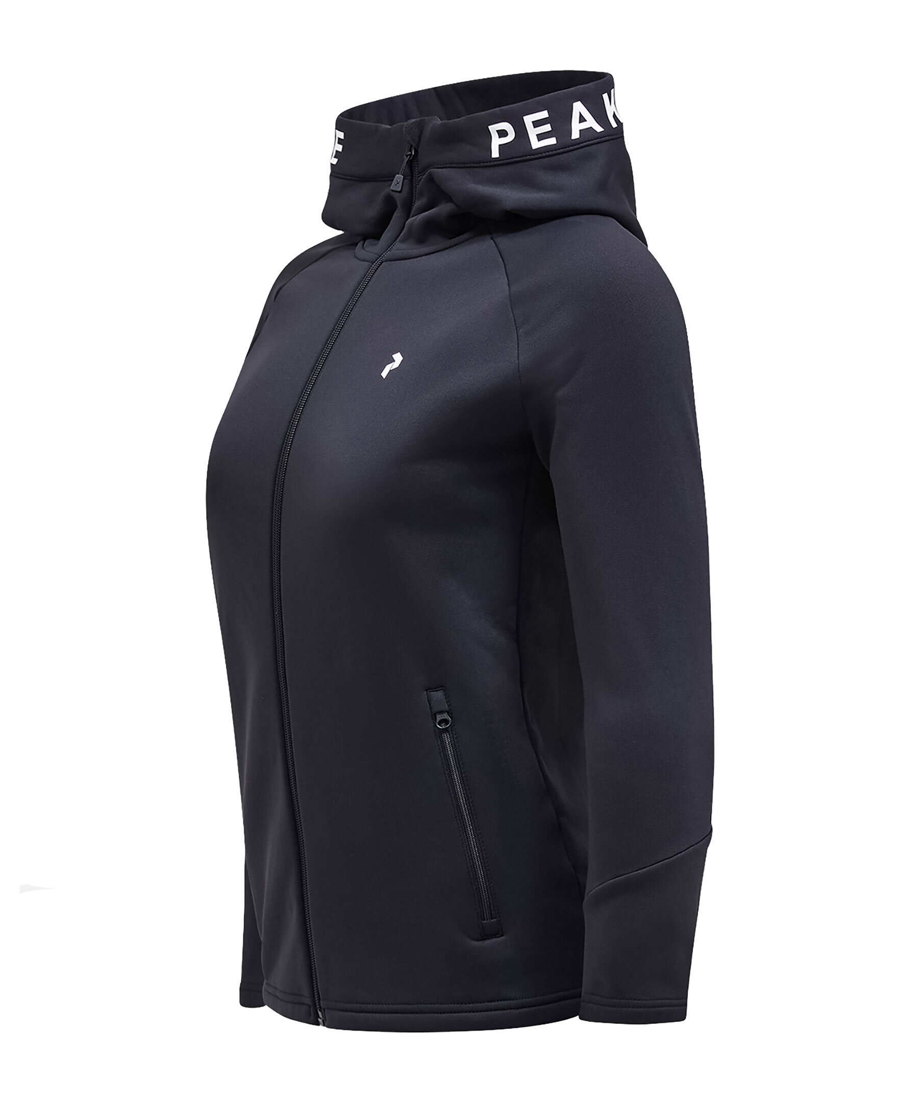 Svart mellanlagersjacka med huva från Peak Performance i stretchigt material. Tillverkad i ett fukttransporterande och snabbtorkande återvunnet polyesterblandning. Hög krage. Stor, vit logotyp runt huvan. Liten vit logotyp på bröstet. Stängs med dragkedja i mitten av plagget. Två sidfickor som även de stängs med dragkedja.