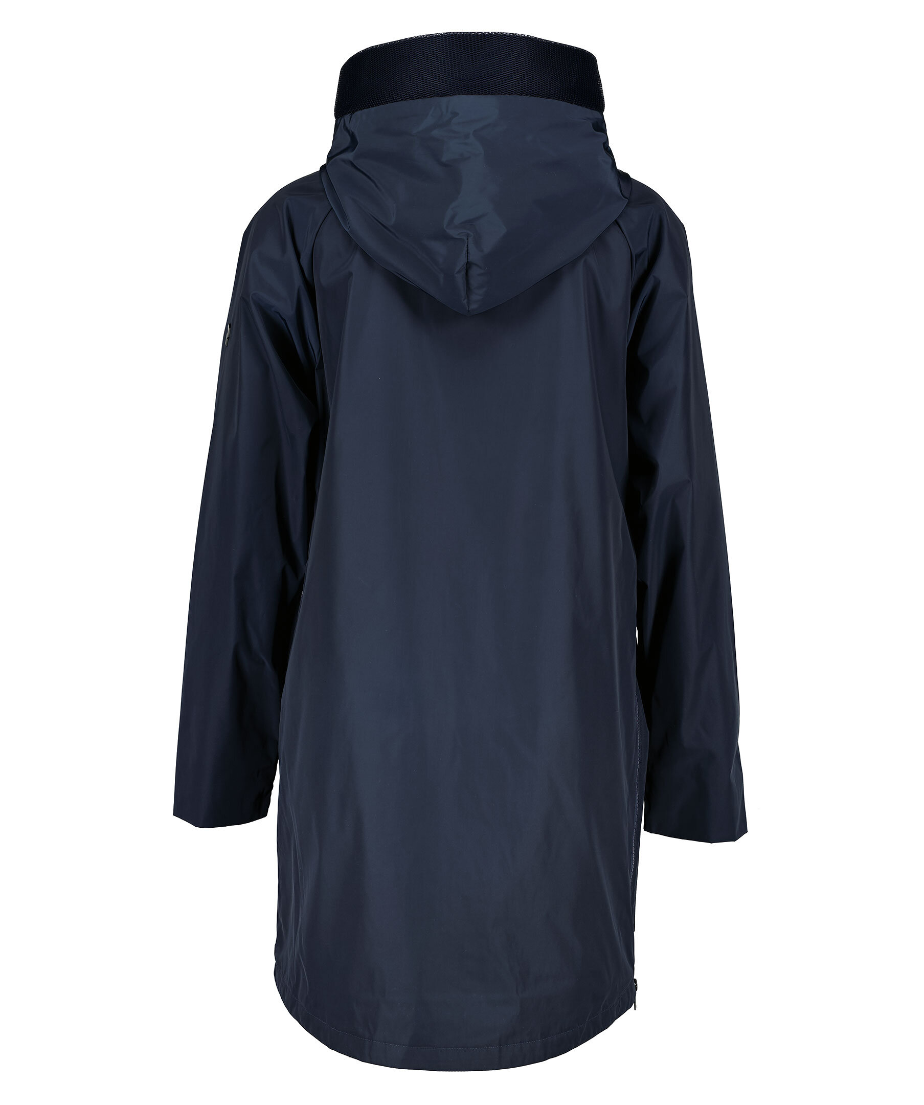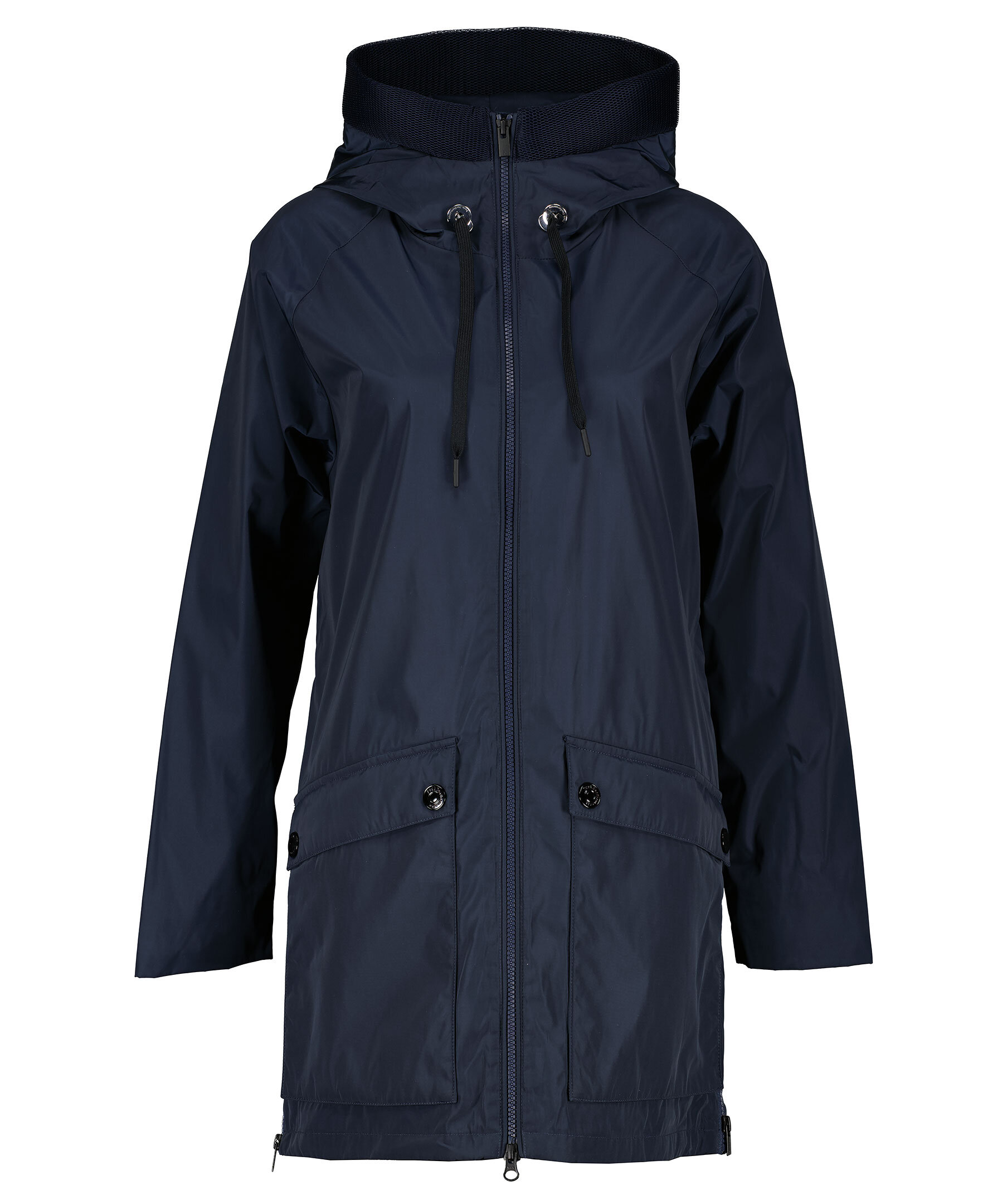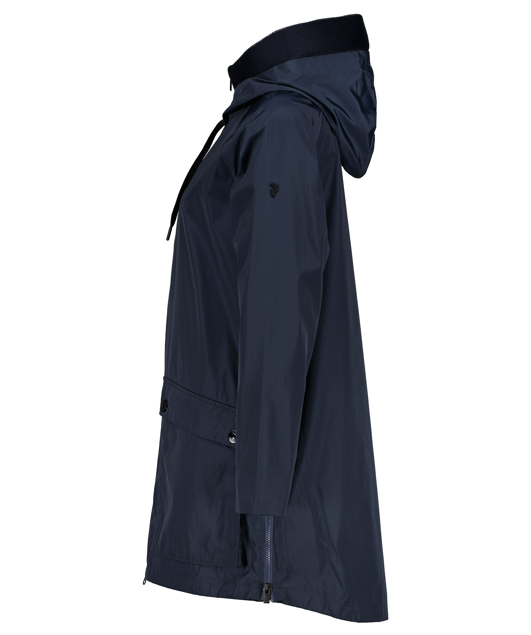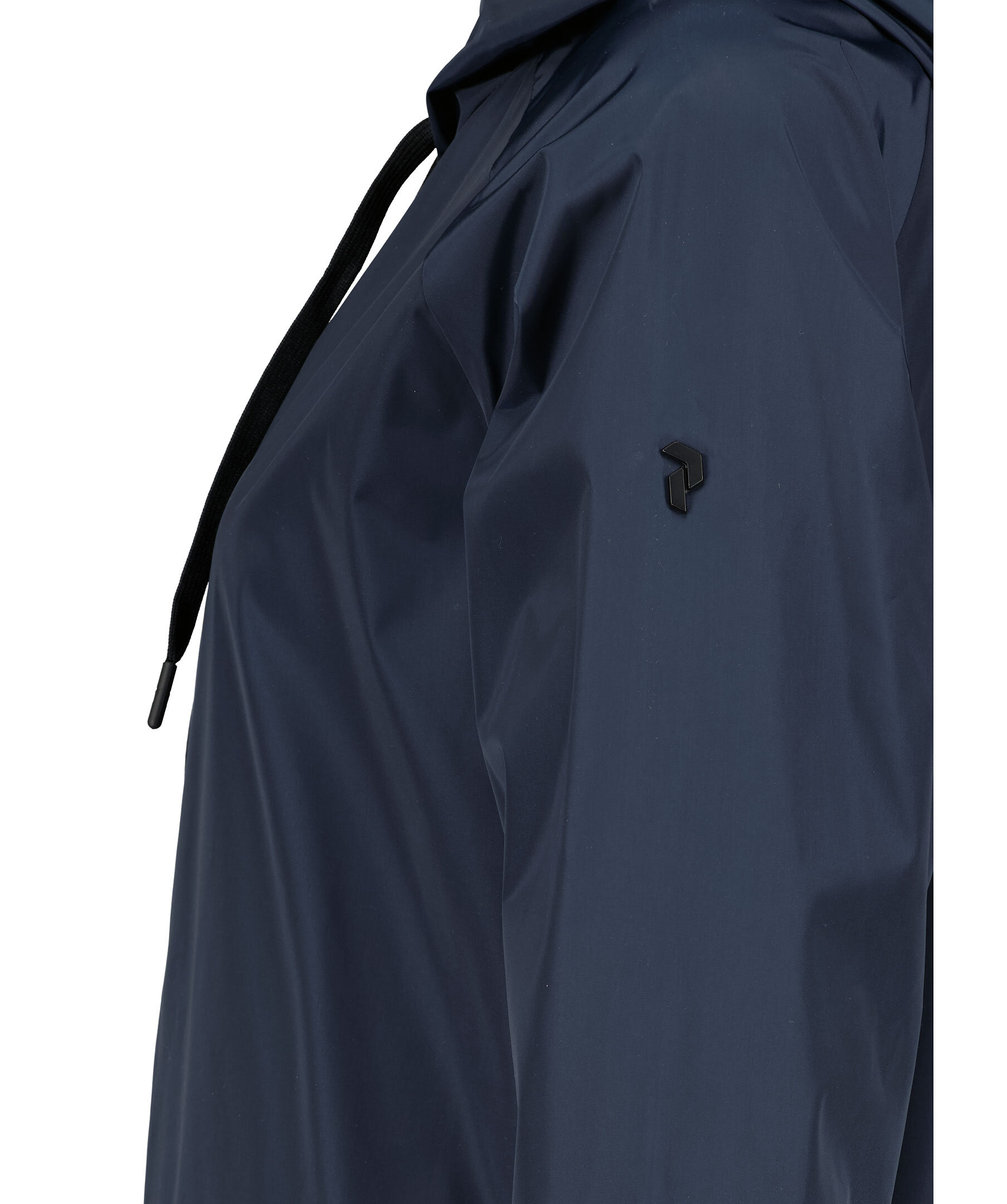 Mörkblå jacka med luva och med ett glansigt skalmaterial från Peak Performance. Detaljer i 3D-struktur och överdimensionerad silhuett som skapar en modern passform som är lätt att använda som lager. Snörning i luva, stängs med tvåvägsdragkedja fram samt har en hög krage. Liten, svart logotyp på vänster ärm och framfickor med ficklock och tyckknappar.