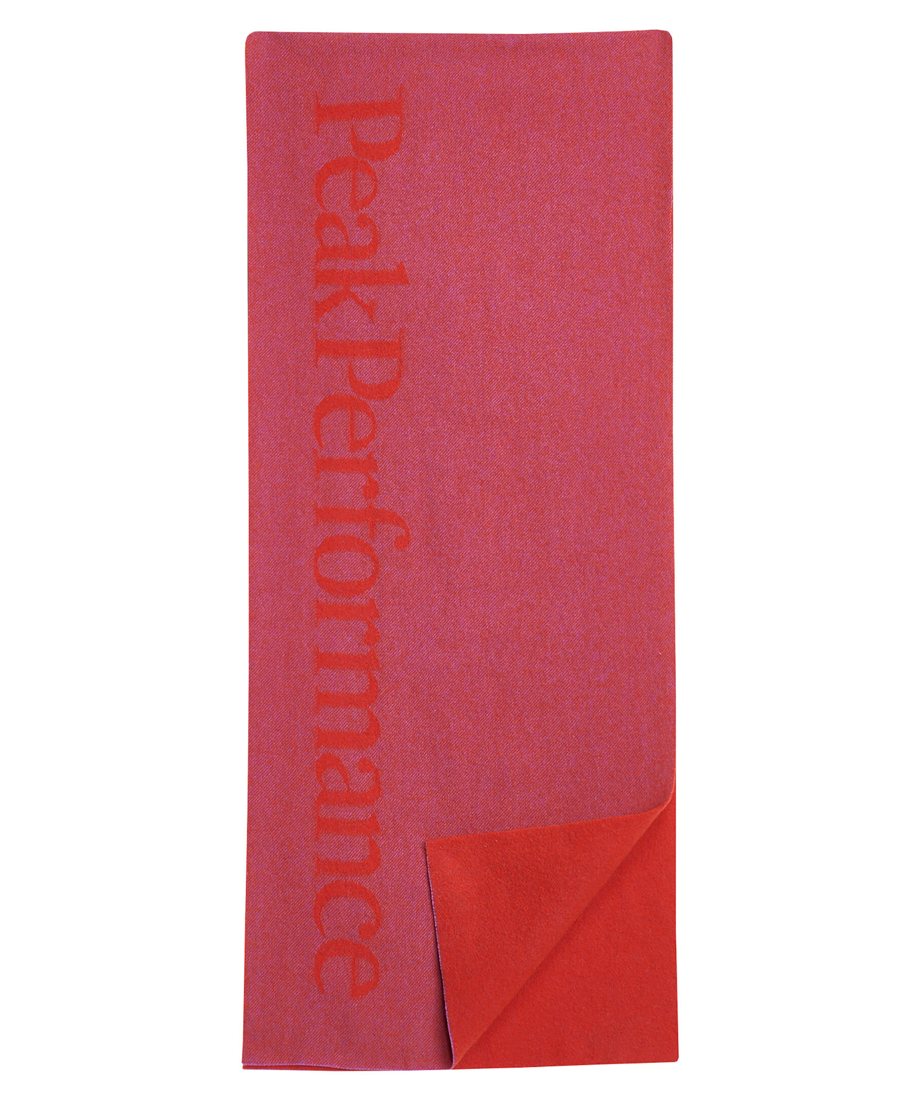 Rosa och röd vävd halsduk från Peak Performance med stor logotyp. Tillverkad i 100% Ull.