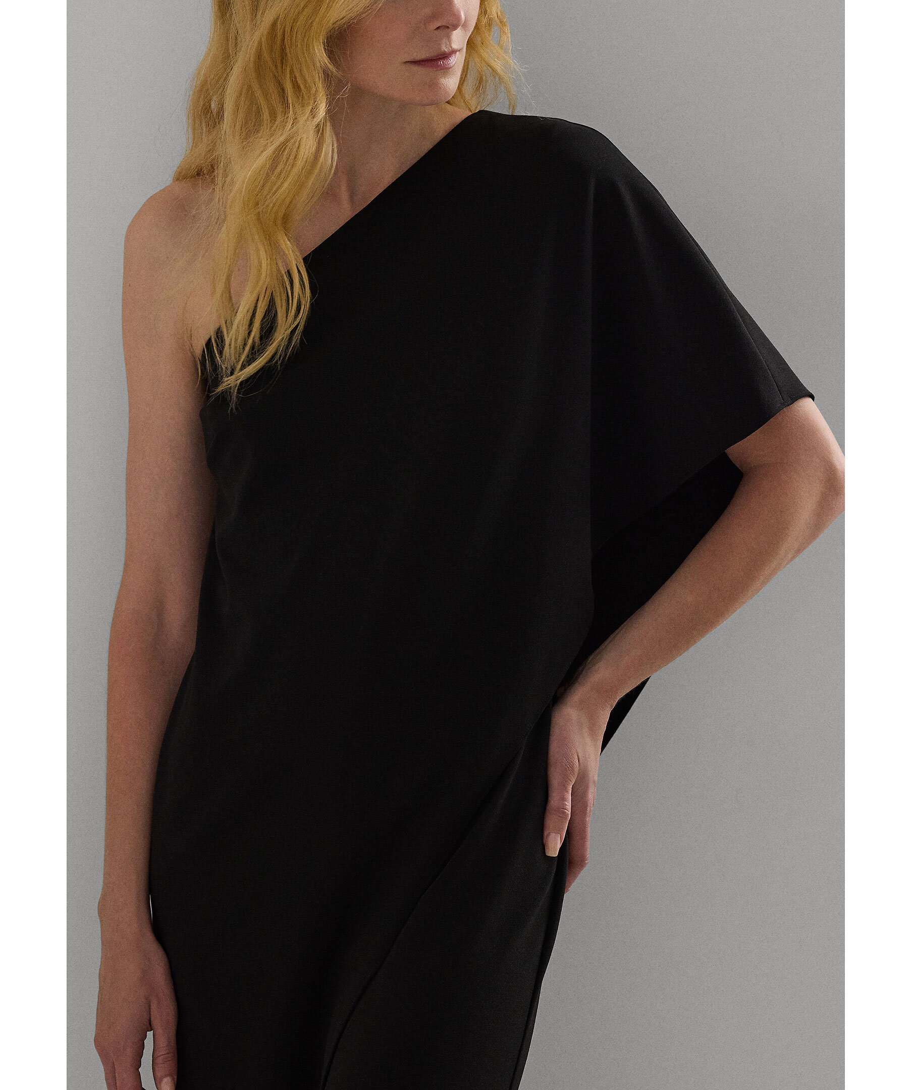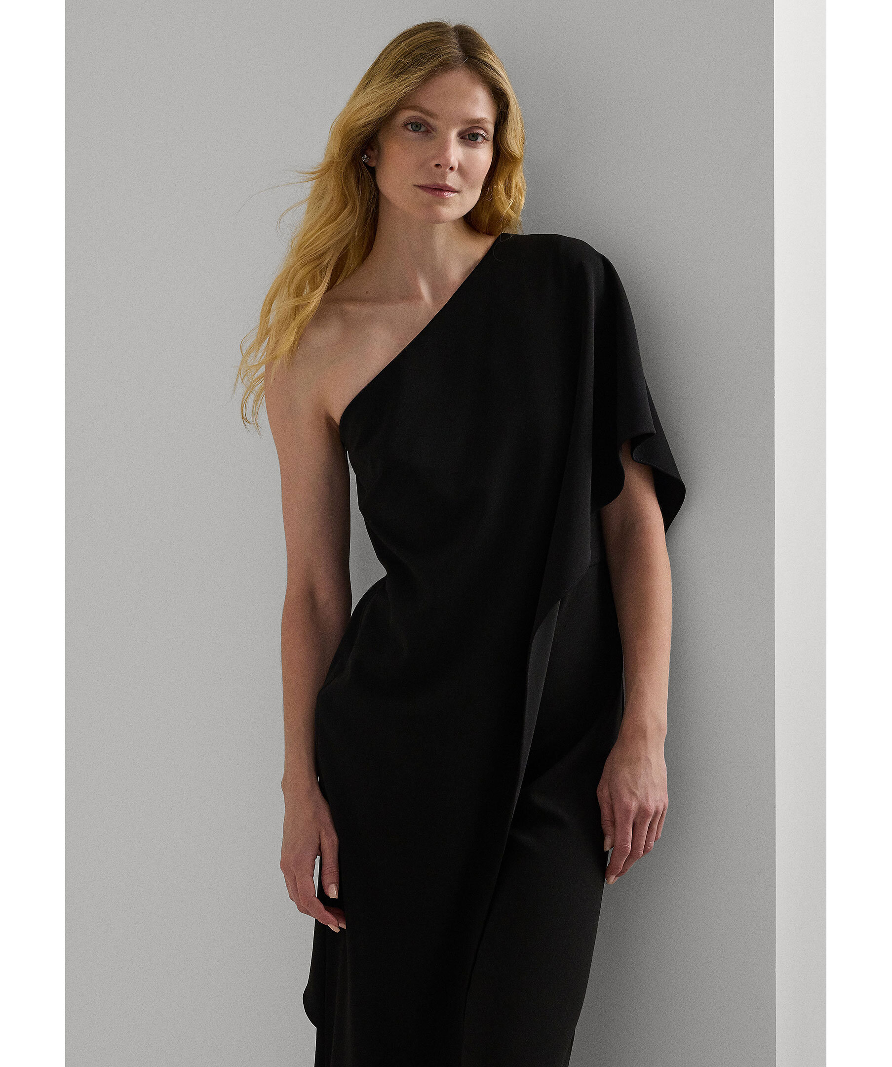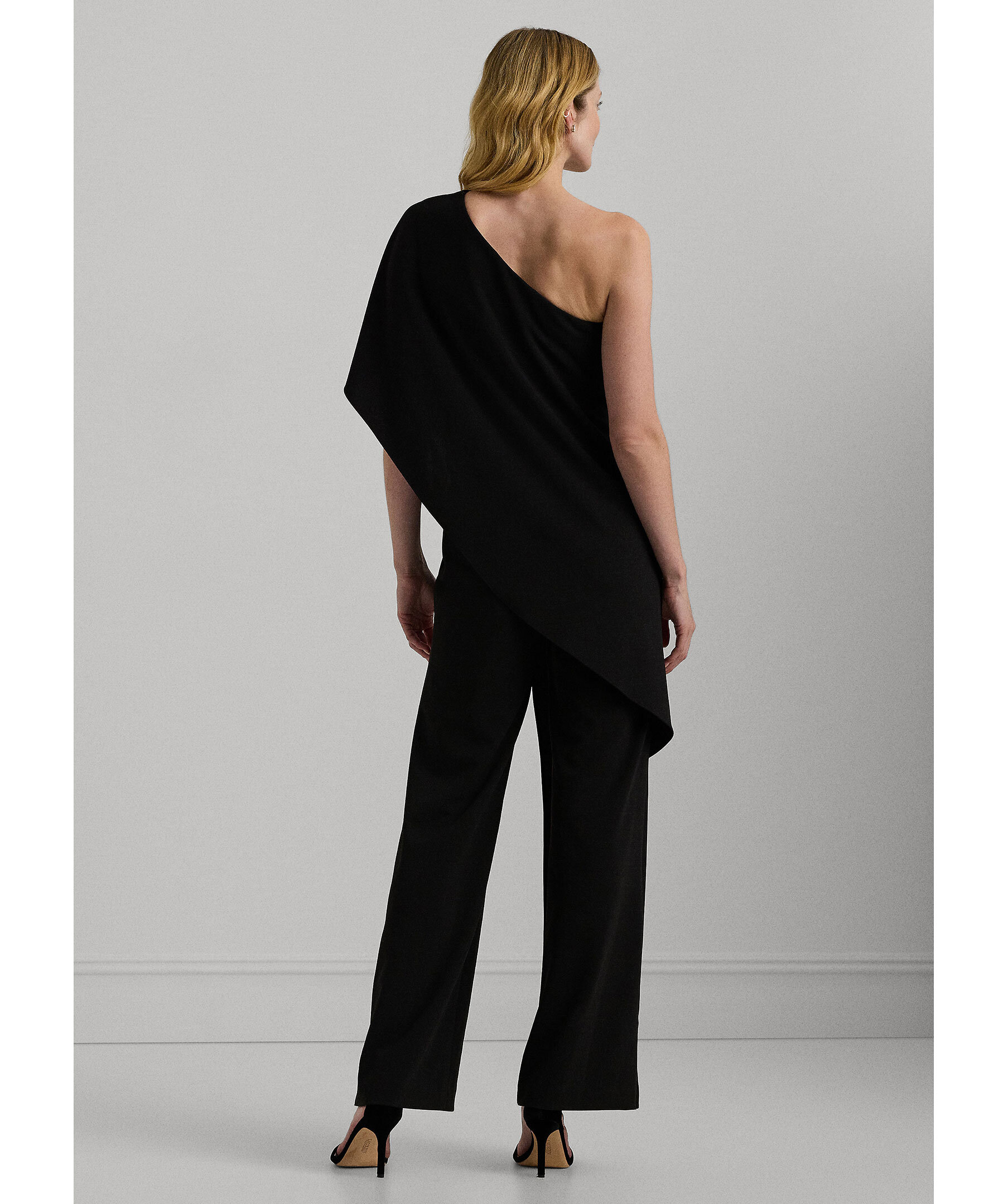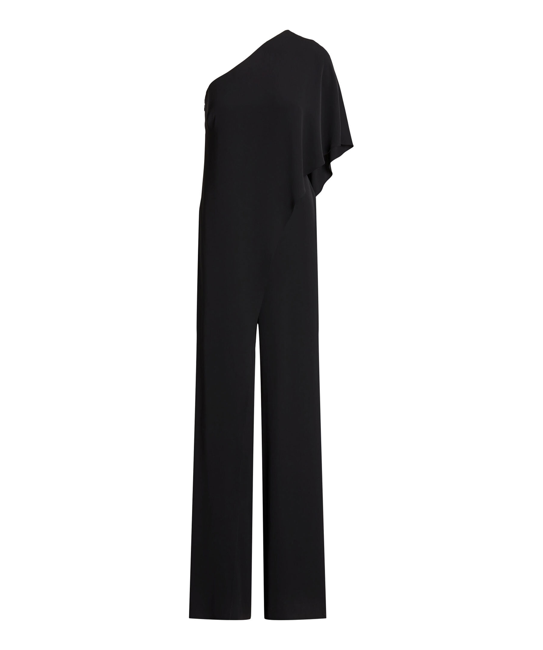 Svart jumpsuit från Polo Ralph Lauren. Den har asymmetrisk ringning och kommer i en enaxlad modell med volangdetalj över ena ärmen. Raka ben och dold dragkedja med hake i sidan. Tillverkad i en polyesterblandning.