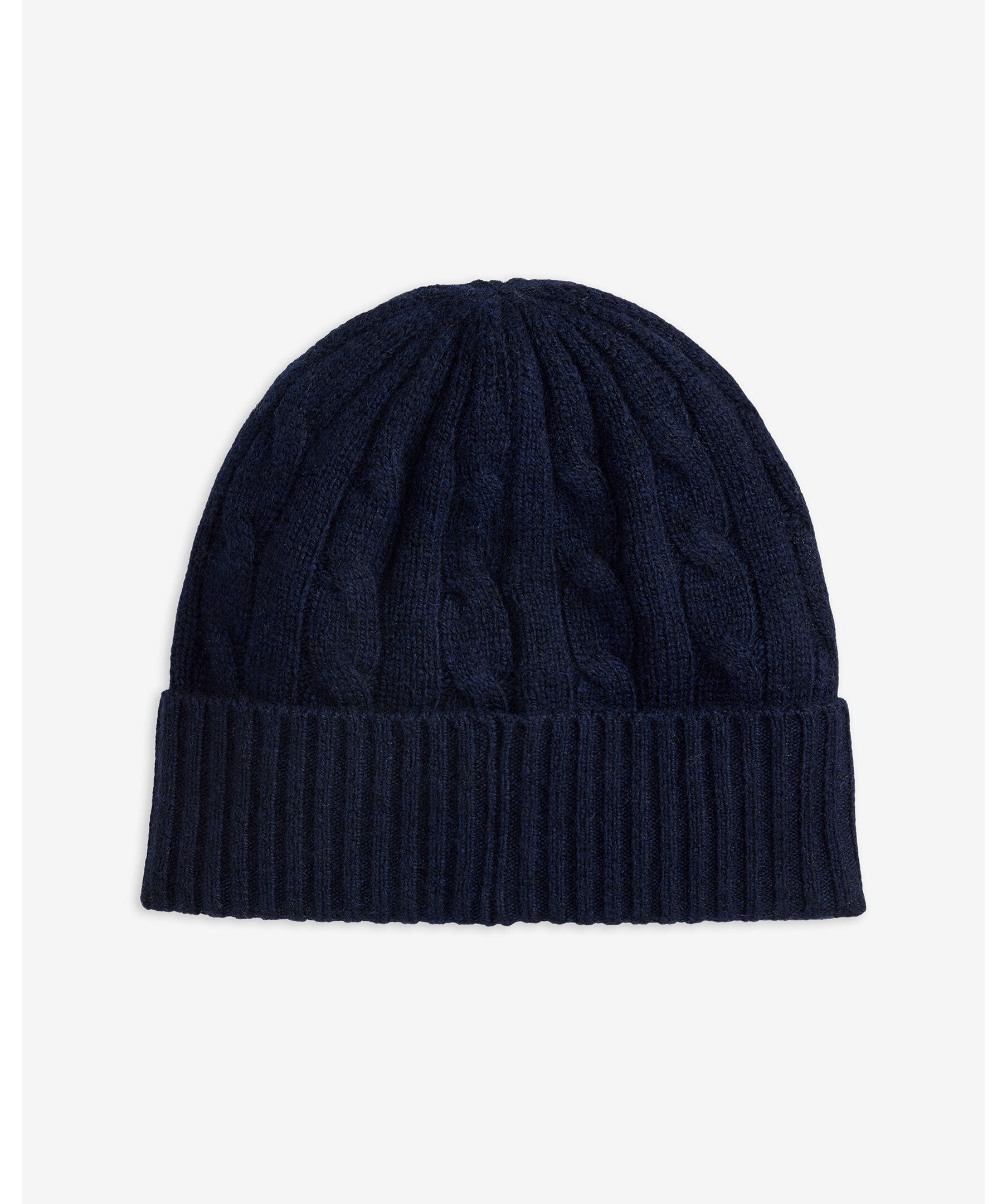 En kabelstickad mössa i mjuk ull- och kashmirblandning, med ribbstickad kant och den ikoniska broderade polohäst framtill.