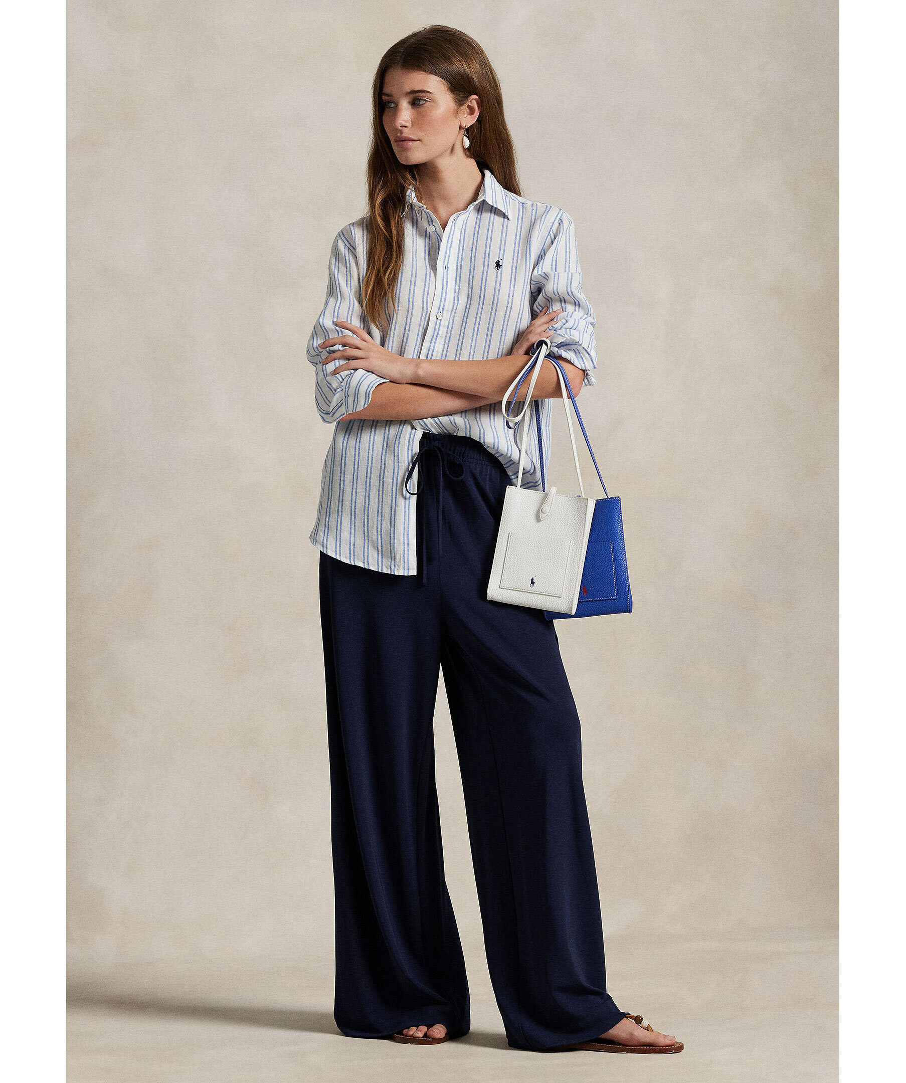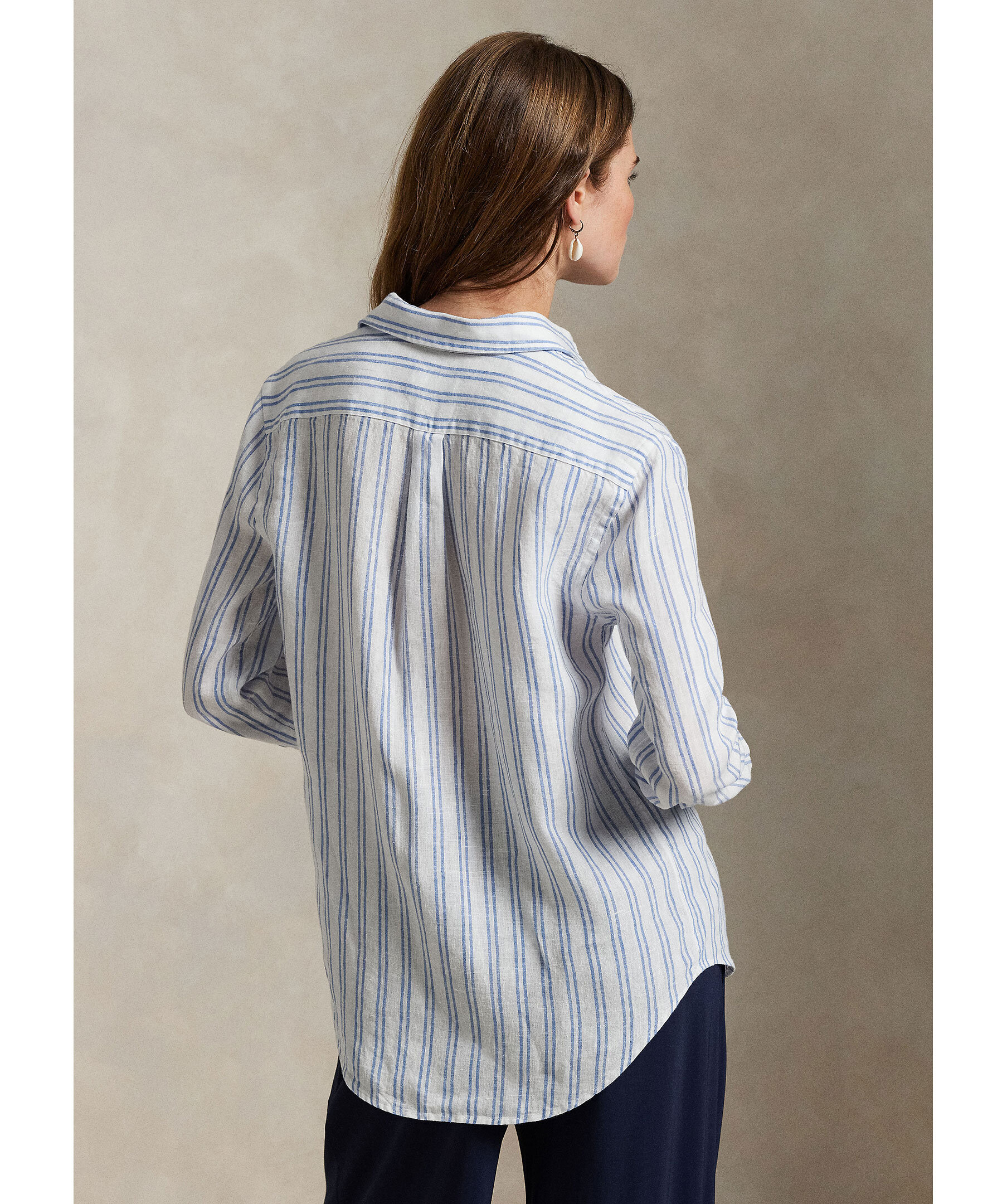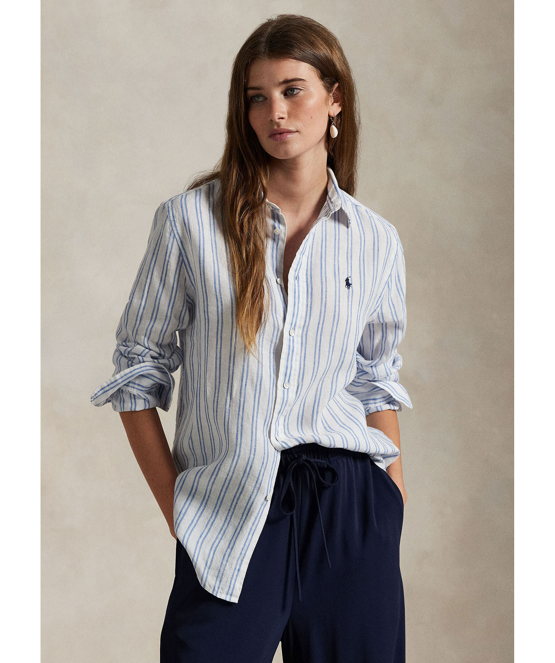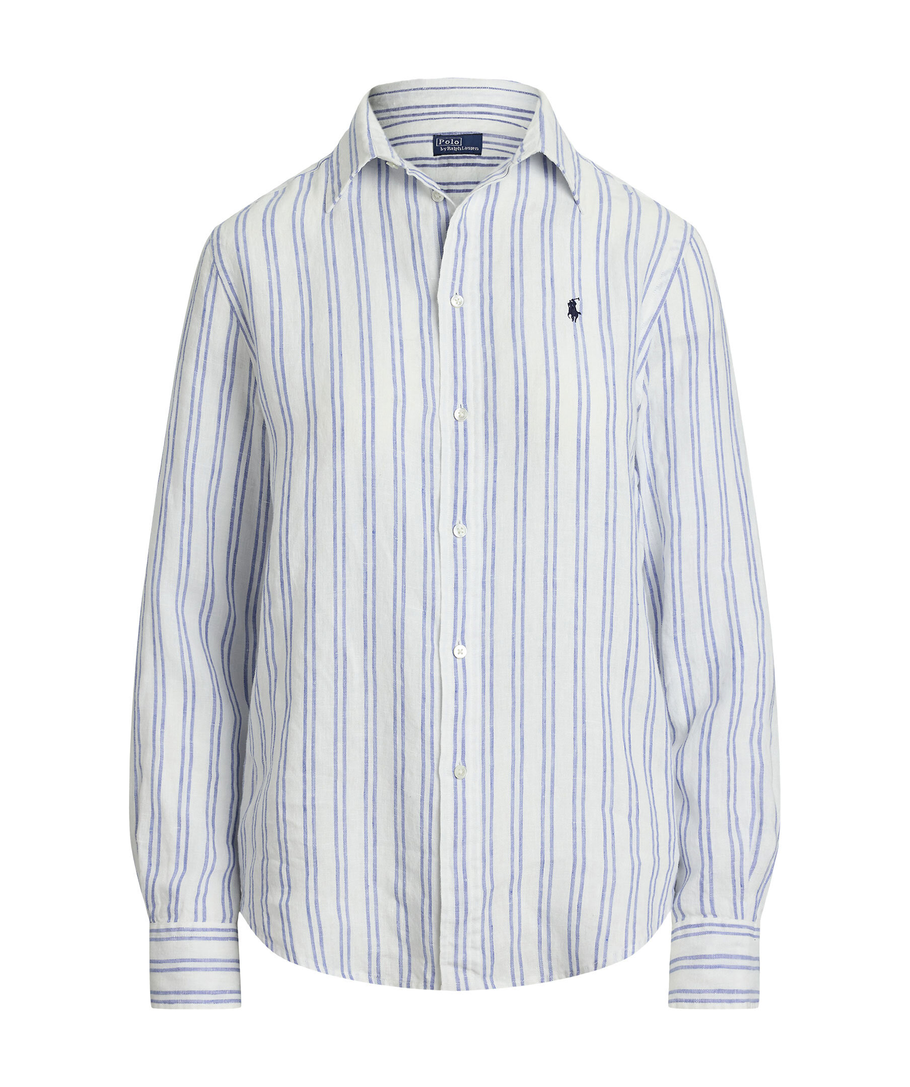 Vit och blårandig skjorta från Polo Ralph Lauren. Skjortan stängs med knappar och har broderad logotyp på bröstet. Tillverkad i 100% linne.