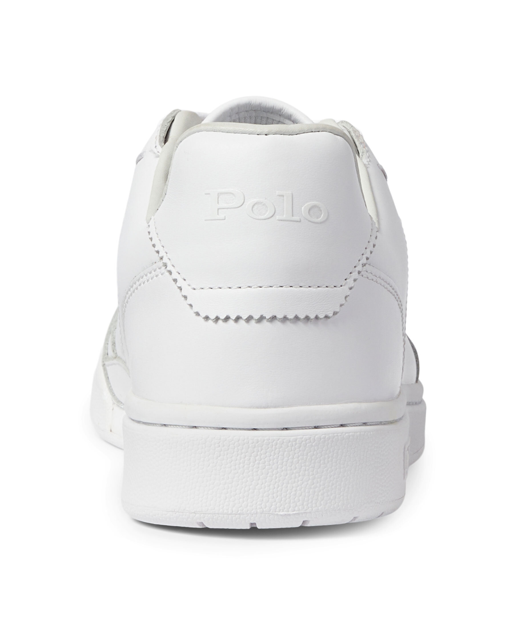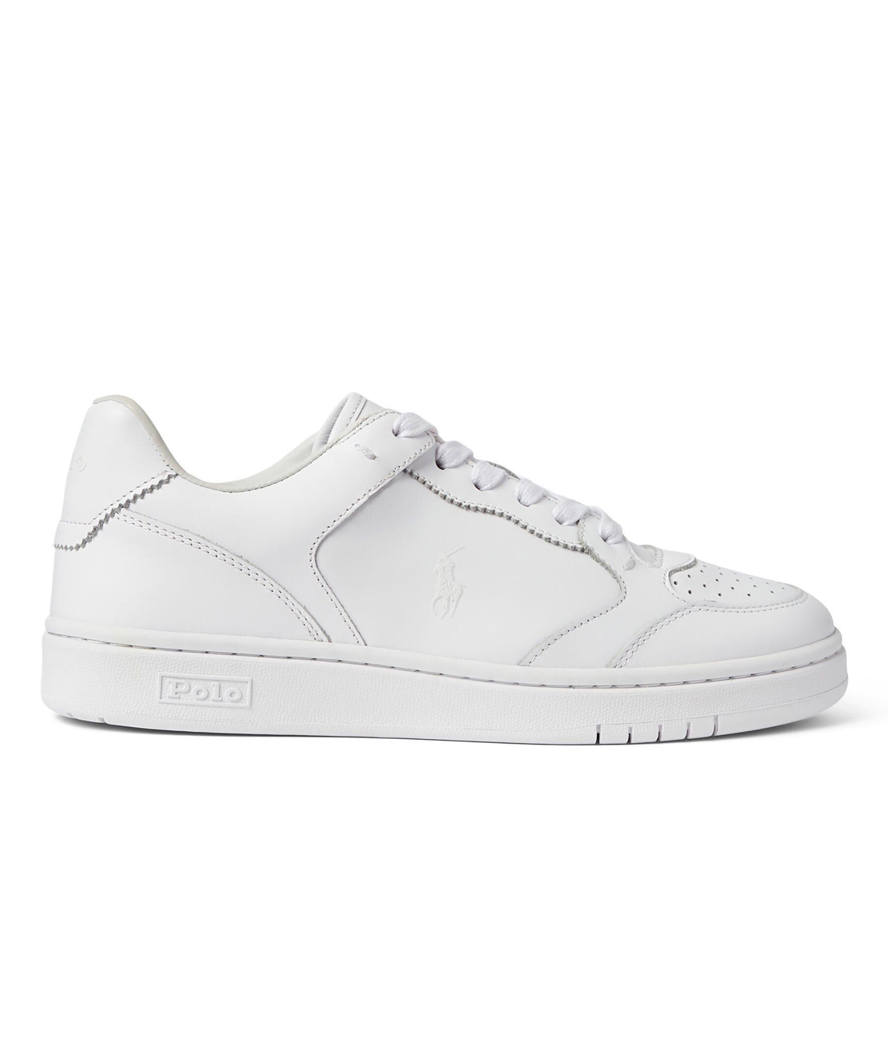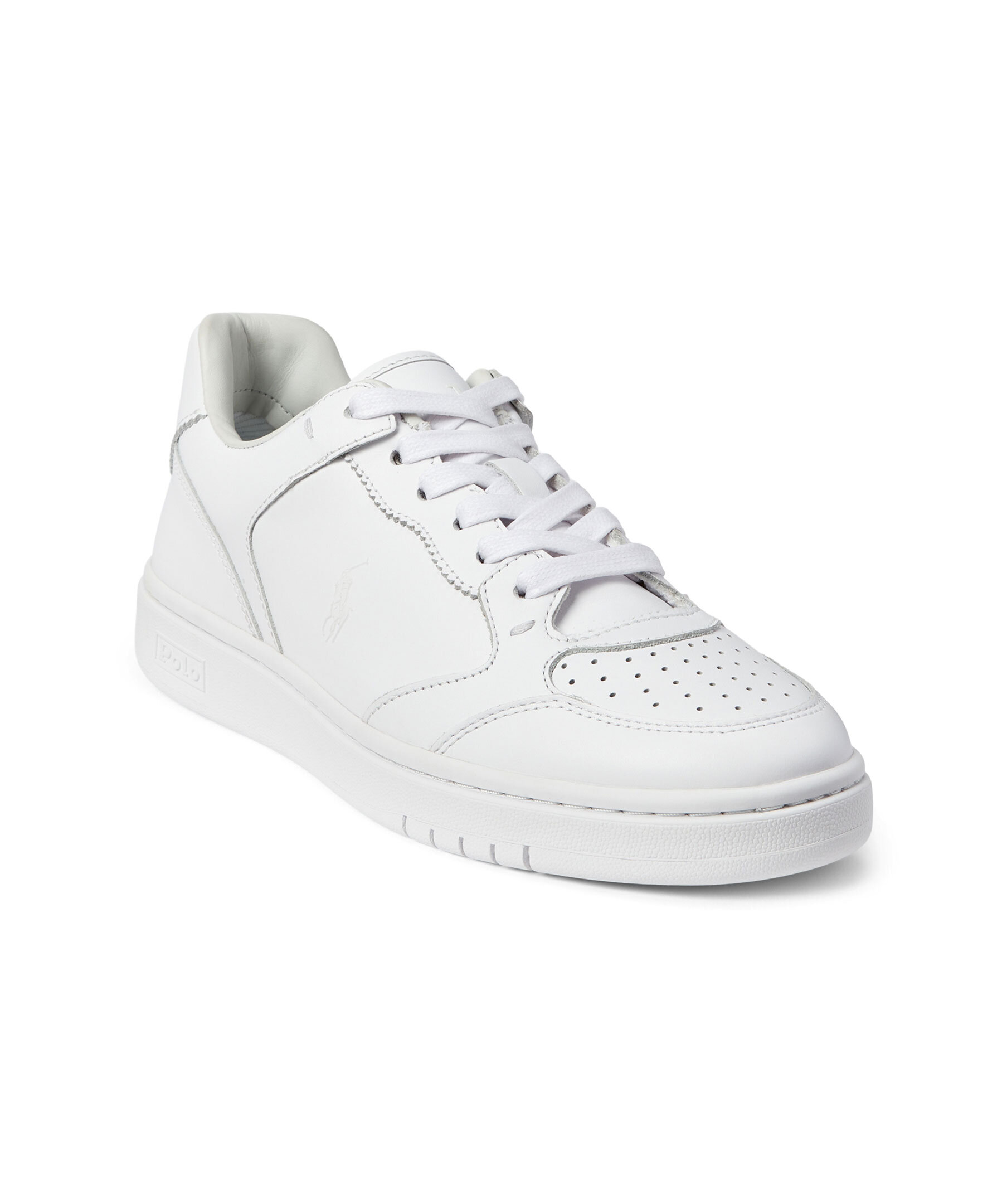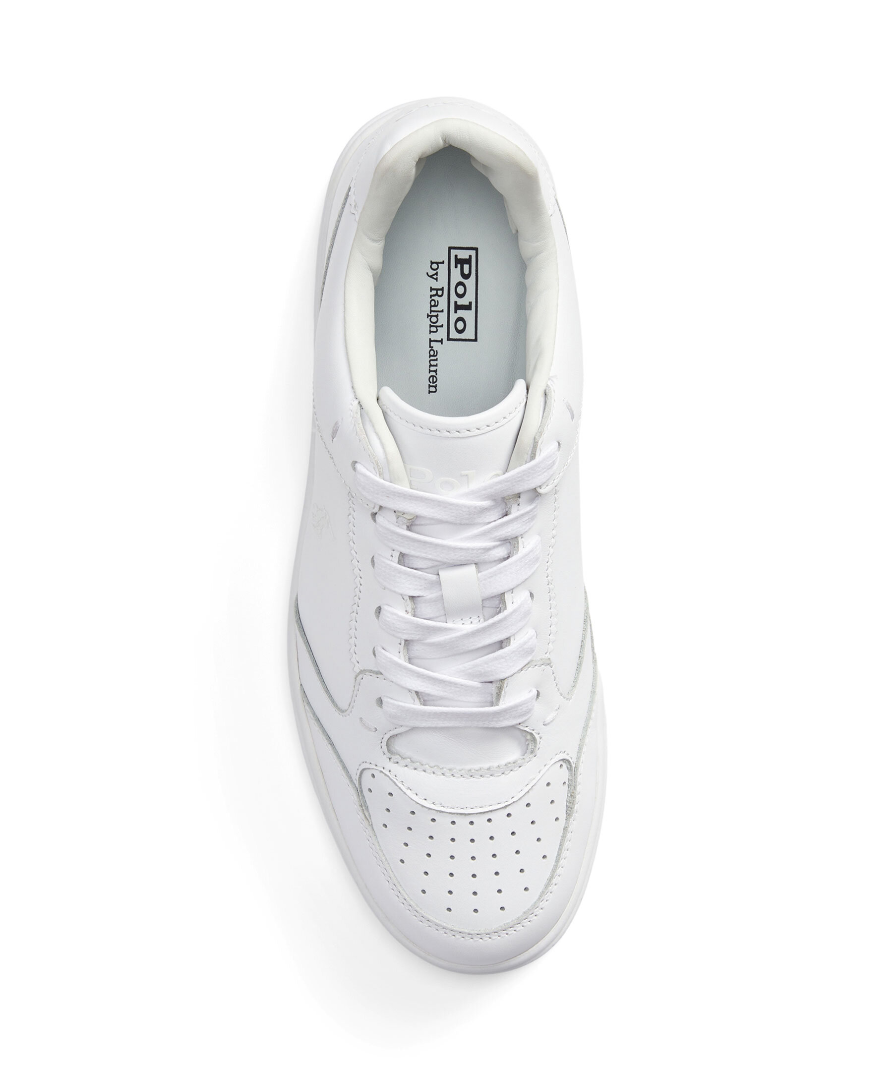 Vita sneakers i läder från Polo Ralph Lauren. Logotyp i vitt på skons utsida, plös. häl samt sulan. Platta snören.