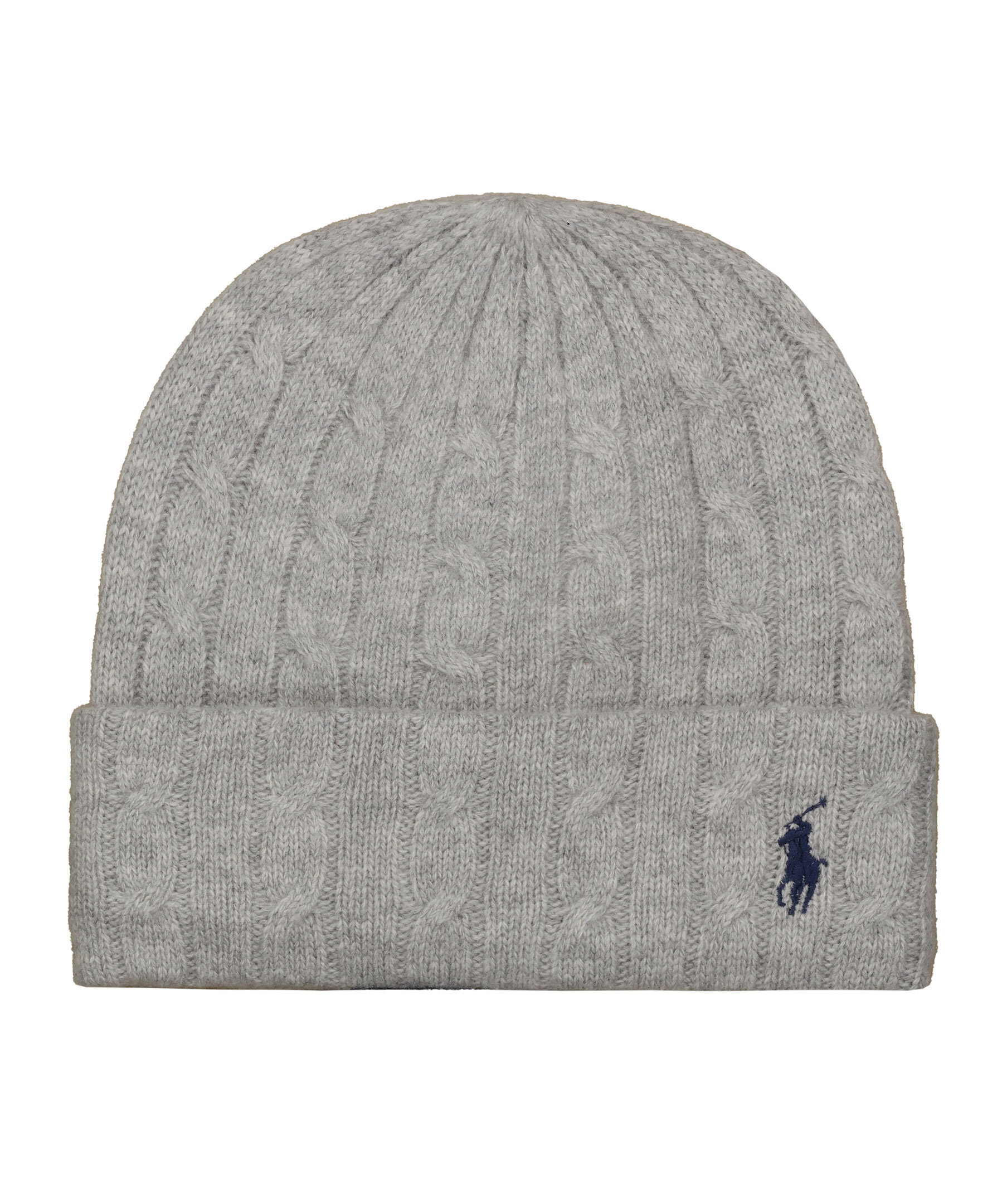 Ljusgrå kabelstickad mössa från Polo Ralph Lauren. Liten, blå broderad logotyp på uppvikt kant. Tillverkade av en ull- och kashmirblandning.