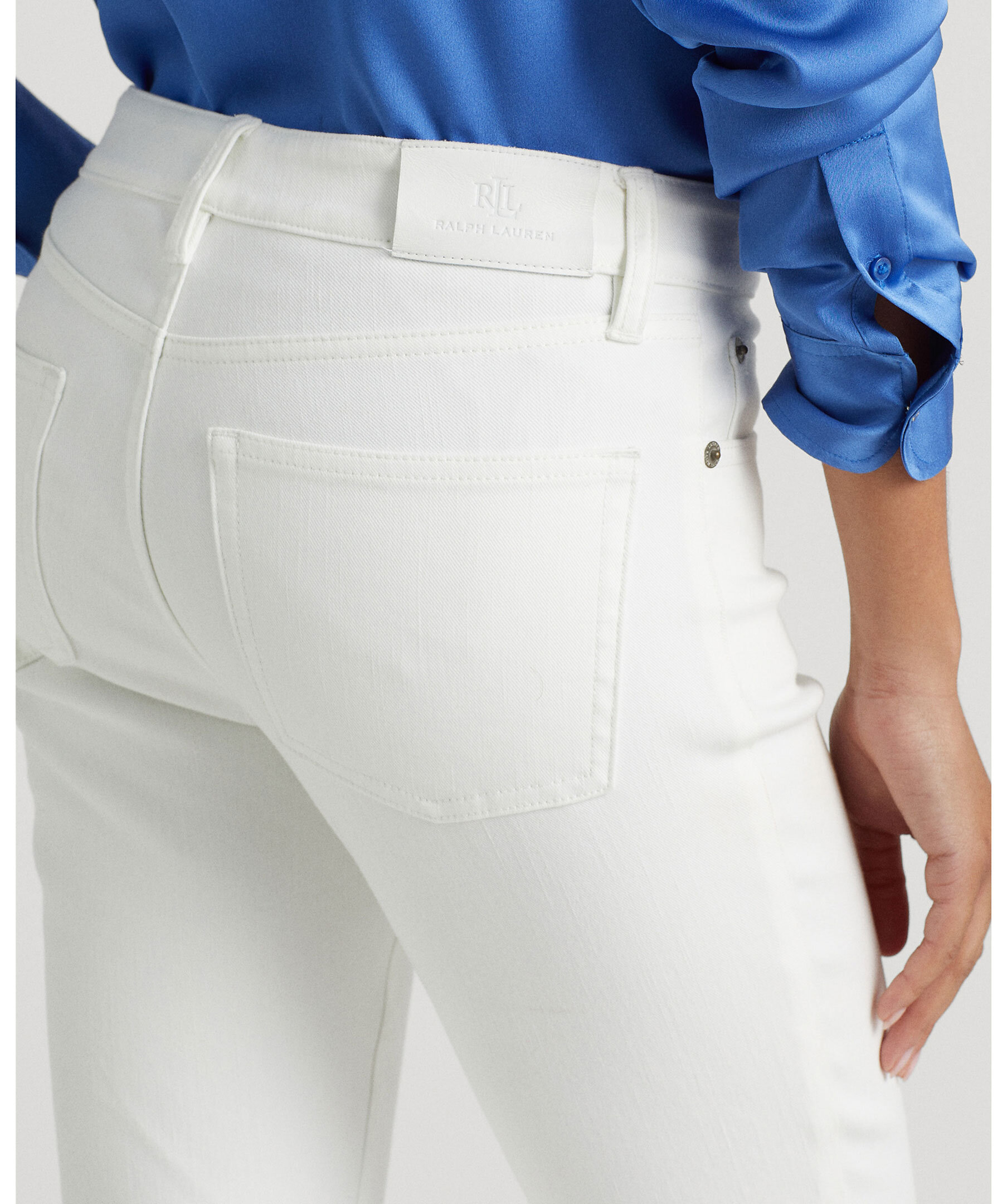 Vita jeans från Lauren Ralph Lauren. Smal passform, femficksmodell och hög midja. Stängs med dold gylf med dragkedja och knapp. Patch i läder baktill med logotyp. Tillverkade i bomull med lite stretch.