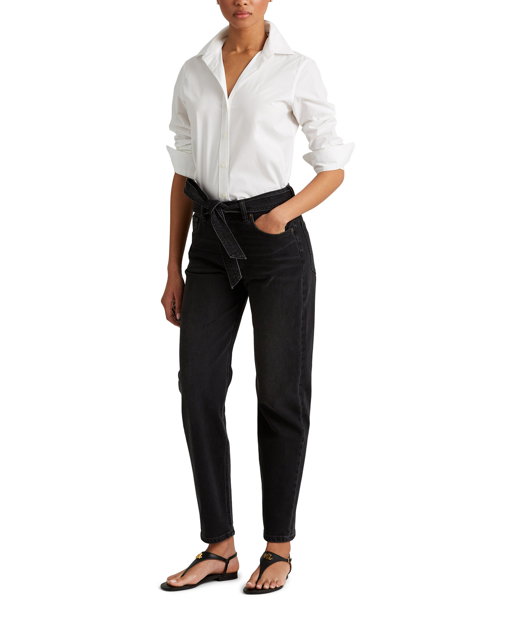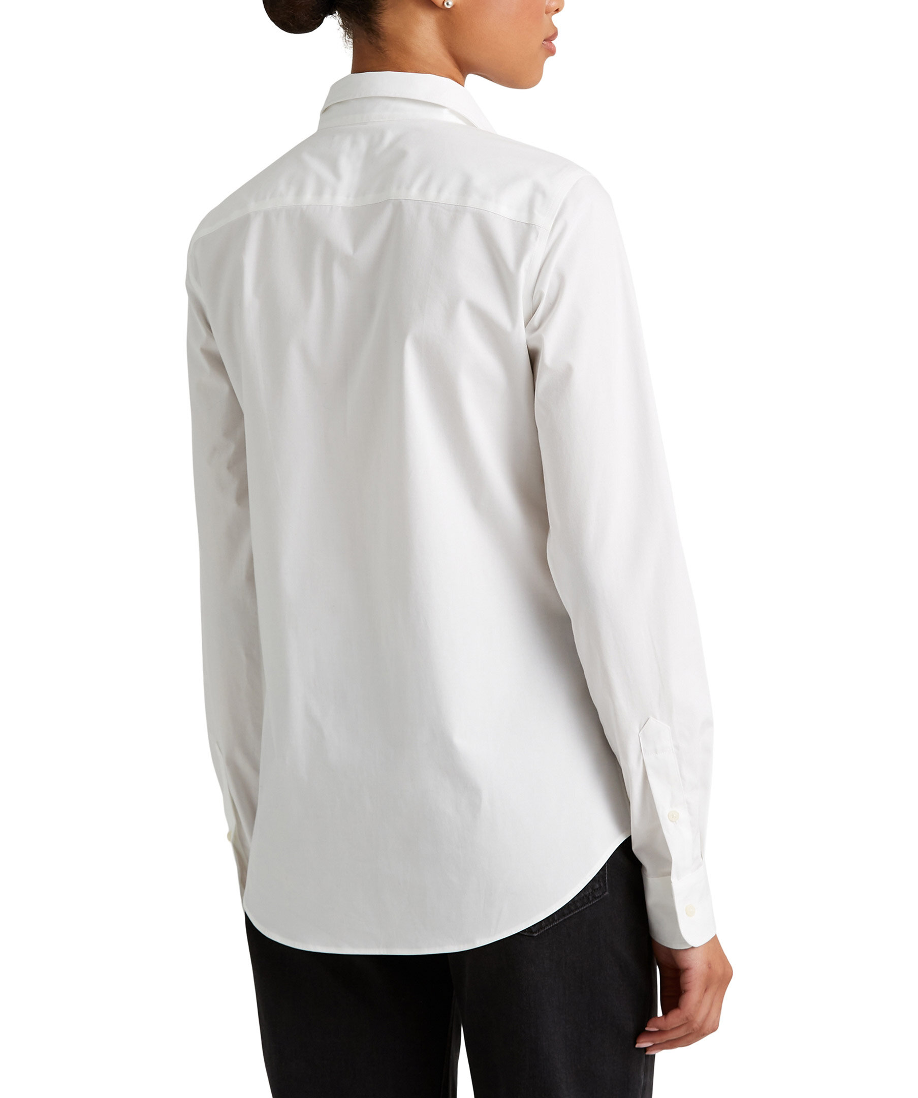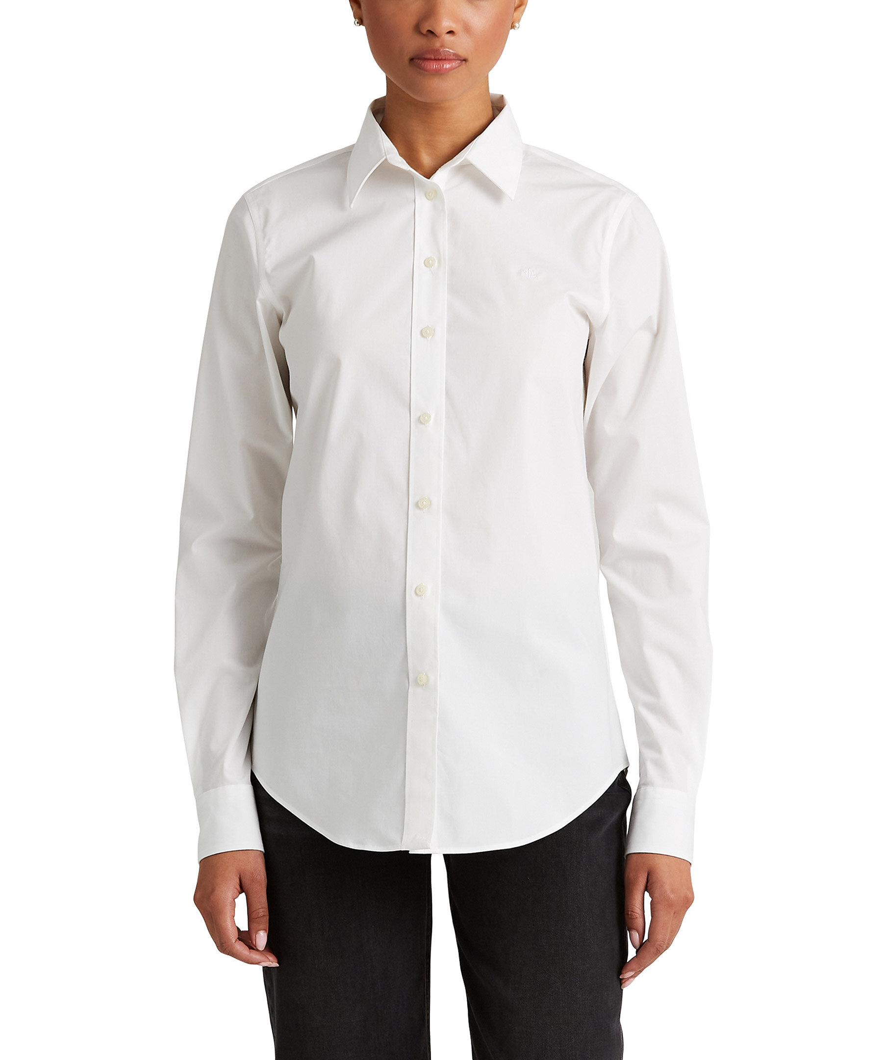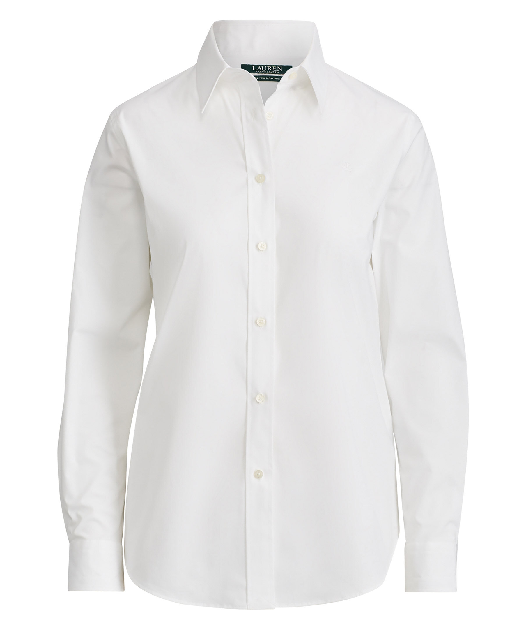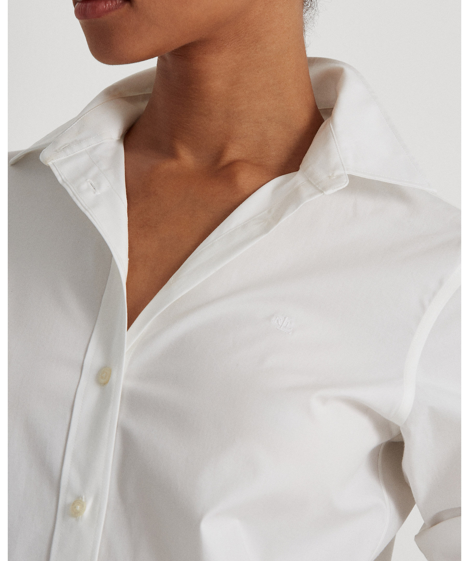 Vit, skjorta i bomull från Polo Ralph Lauren. Spetskrage, knappslå med "Lauren Ralph Lauren"-knappar. Långa ärmar med manschetter med knäppning. Broderat "LRL"-monogram på vänster bröst. Ok bak och skjortsvansfåll. Modellen är 178 cm och bär storlek small.