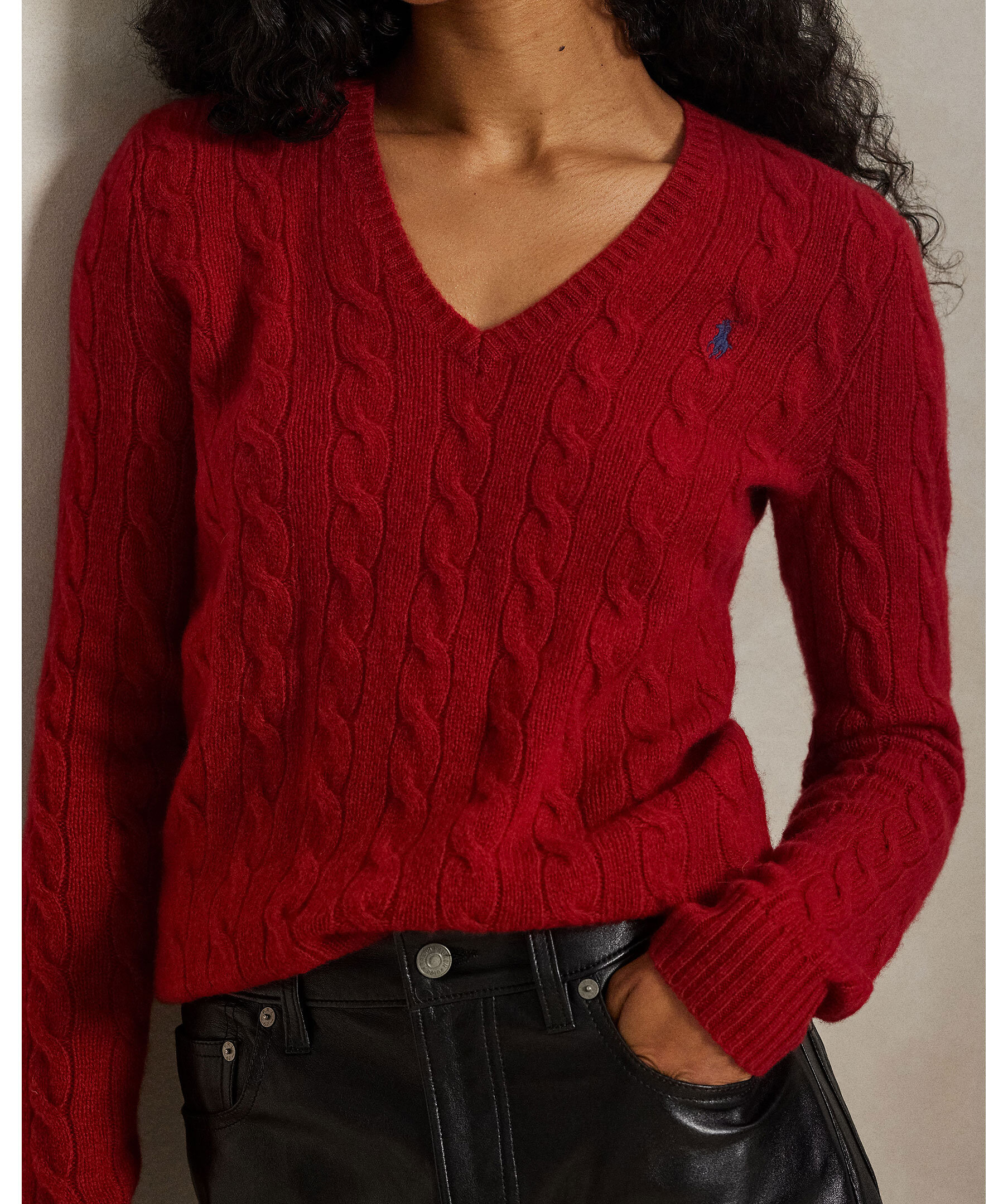 Röd, v-ringad kabelstickad tröja från Polo Ralph Lauren. Gjord i en mjuk ull och kashmirblandning. Ribbstickade muddar och en broderad polohäst på bröstet.
