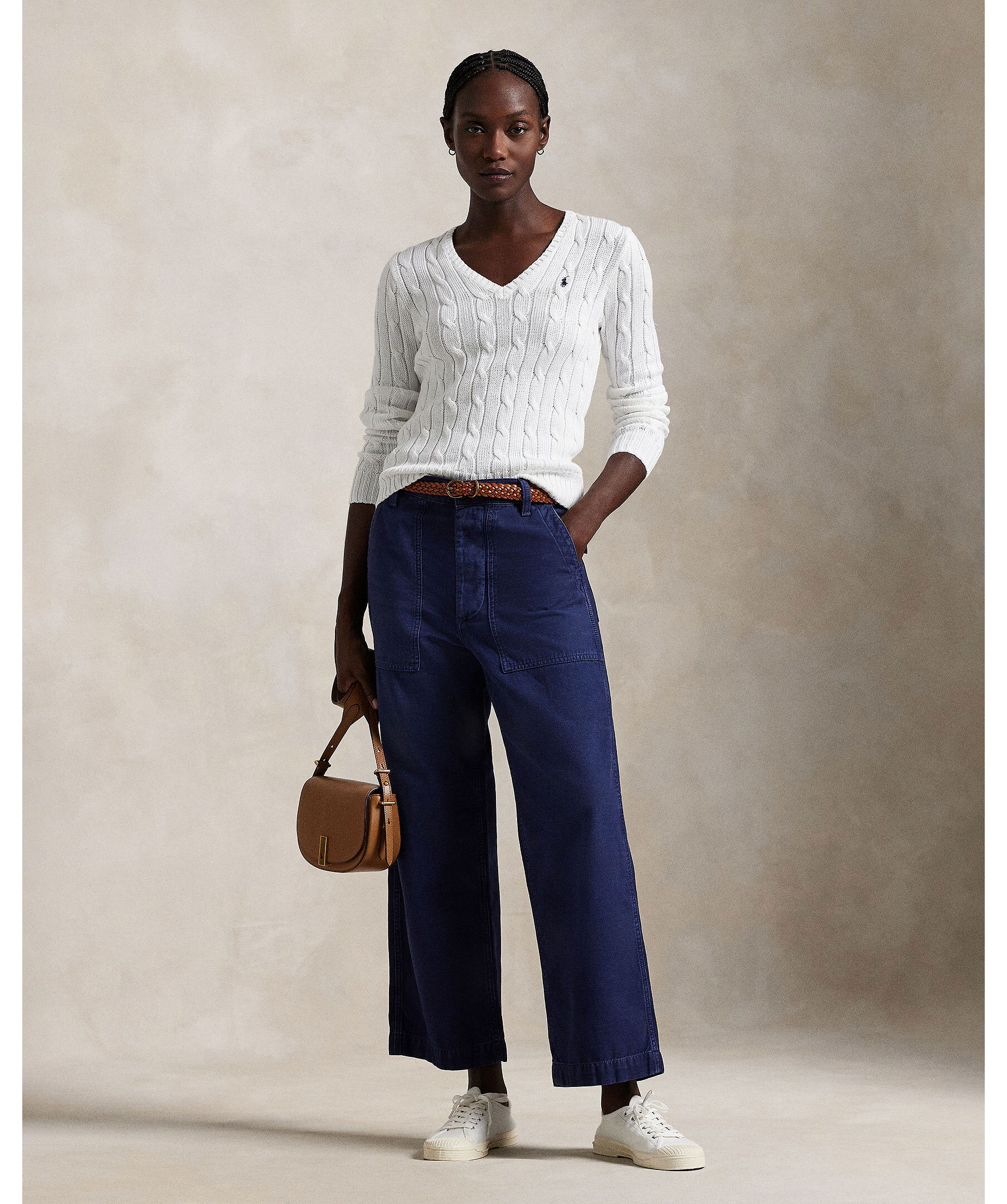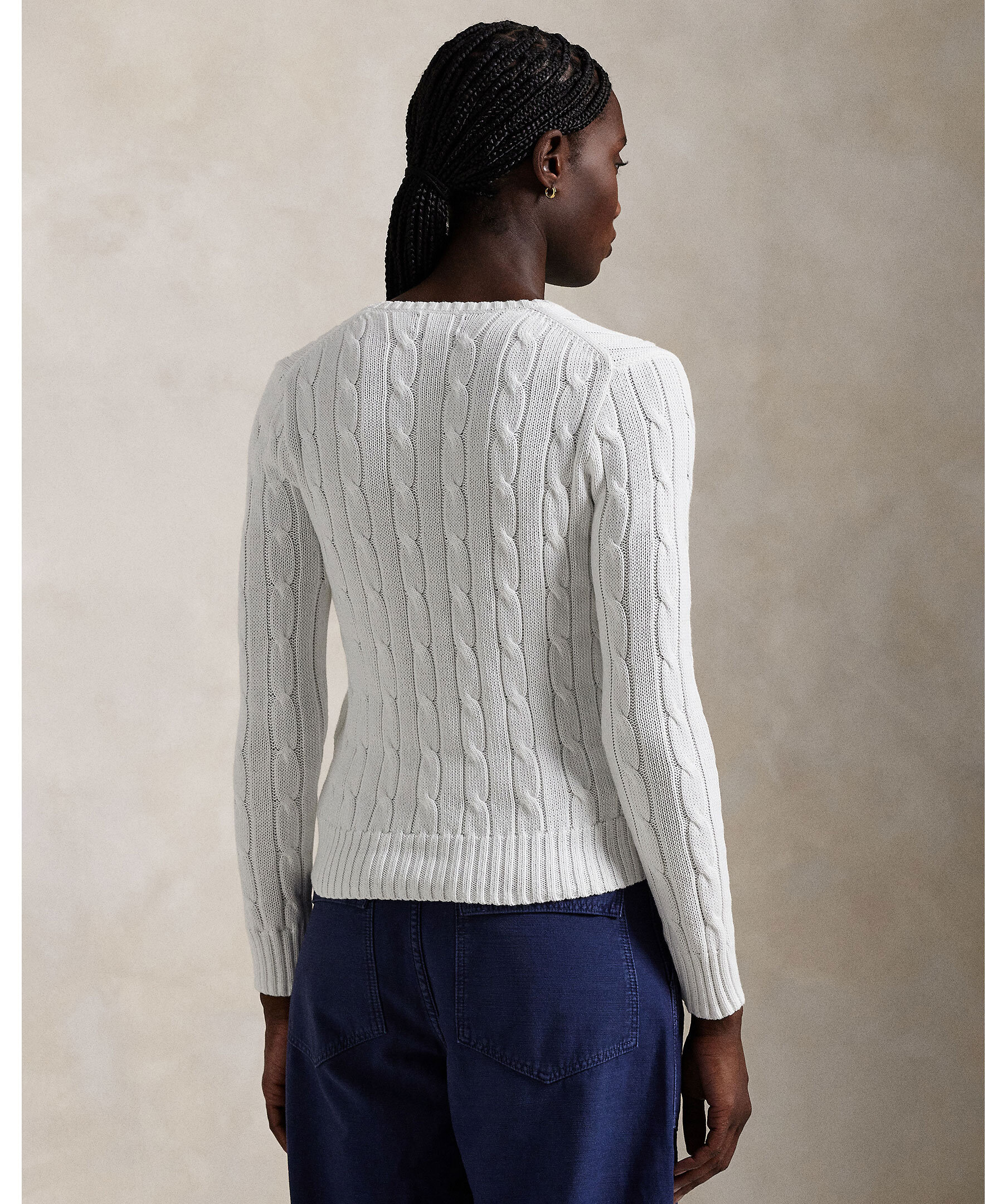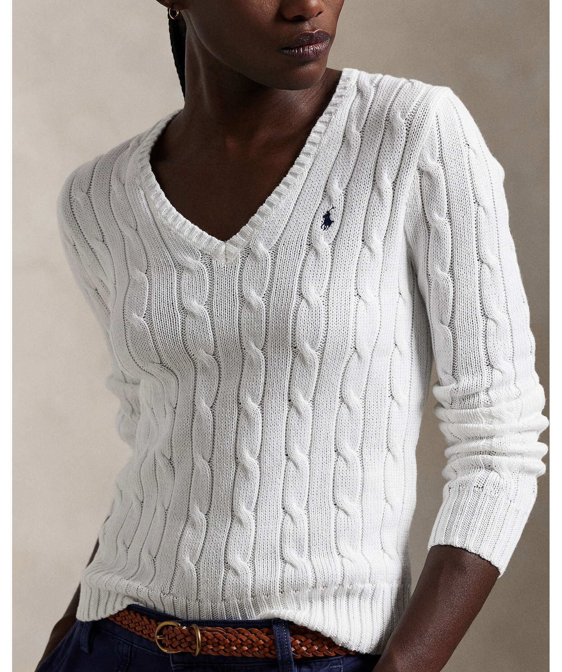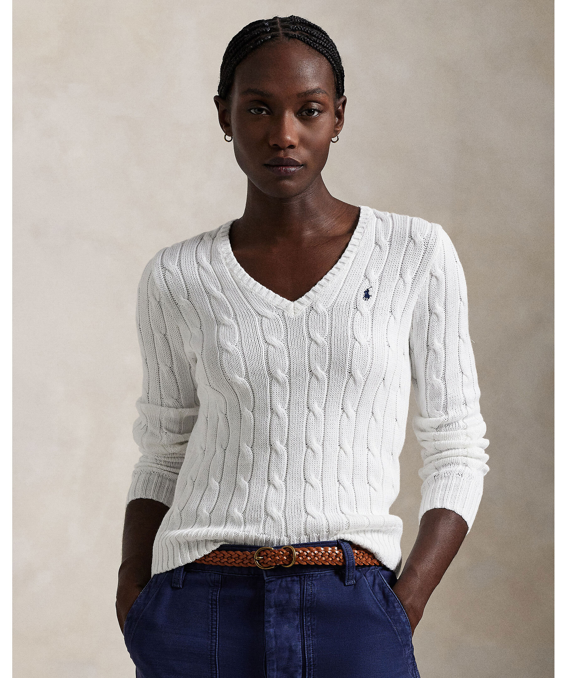 Vit kabelstickad tröja från Polo Ralph Lauren. V-ringad hals och broderad polohäst på bröstet. Smal passform. Gjord i mjuk bomull.