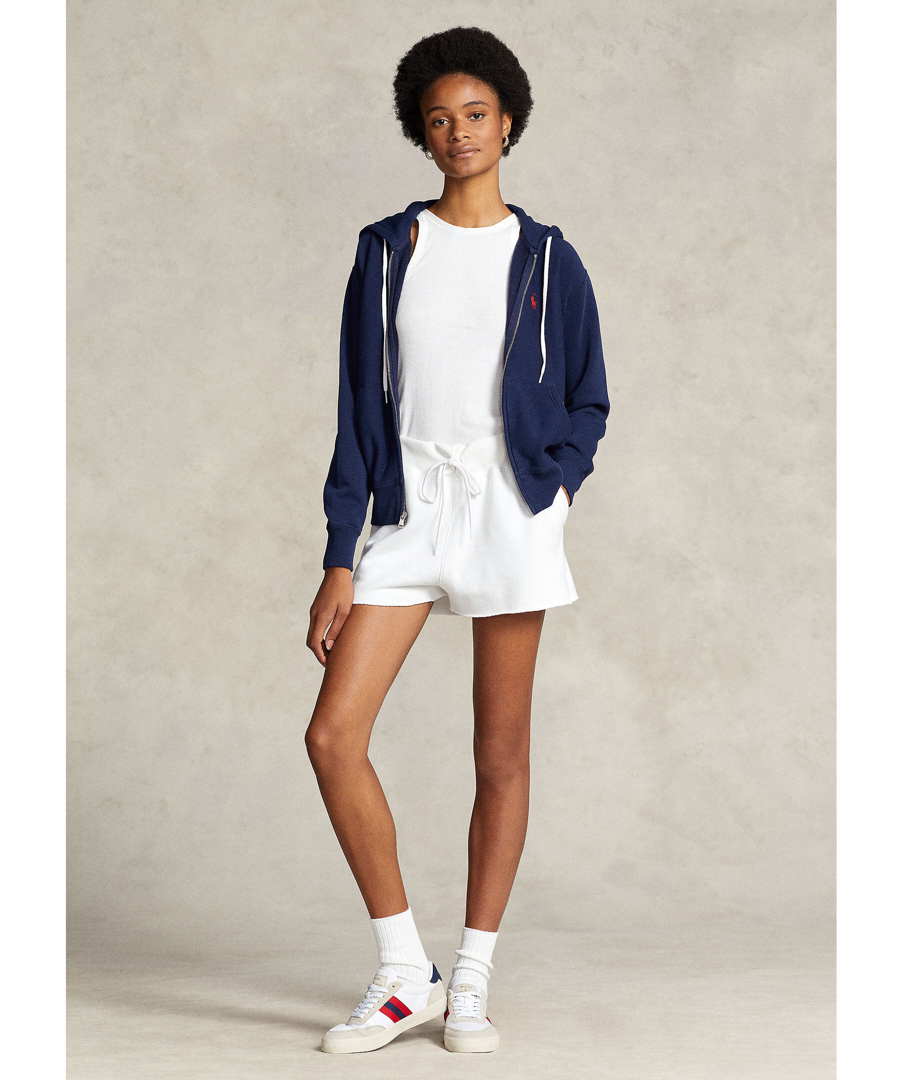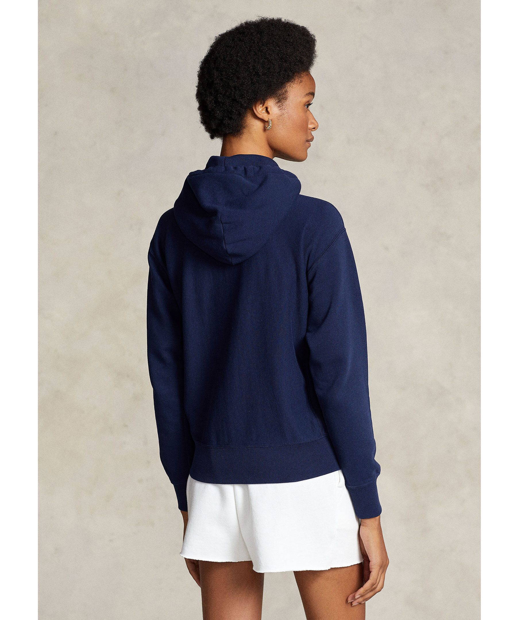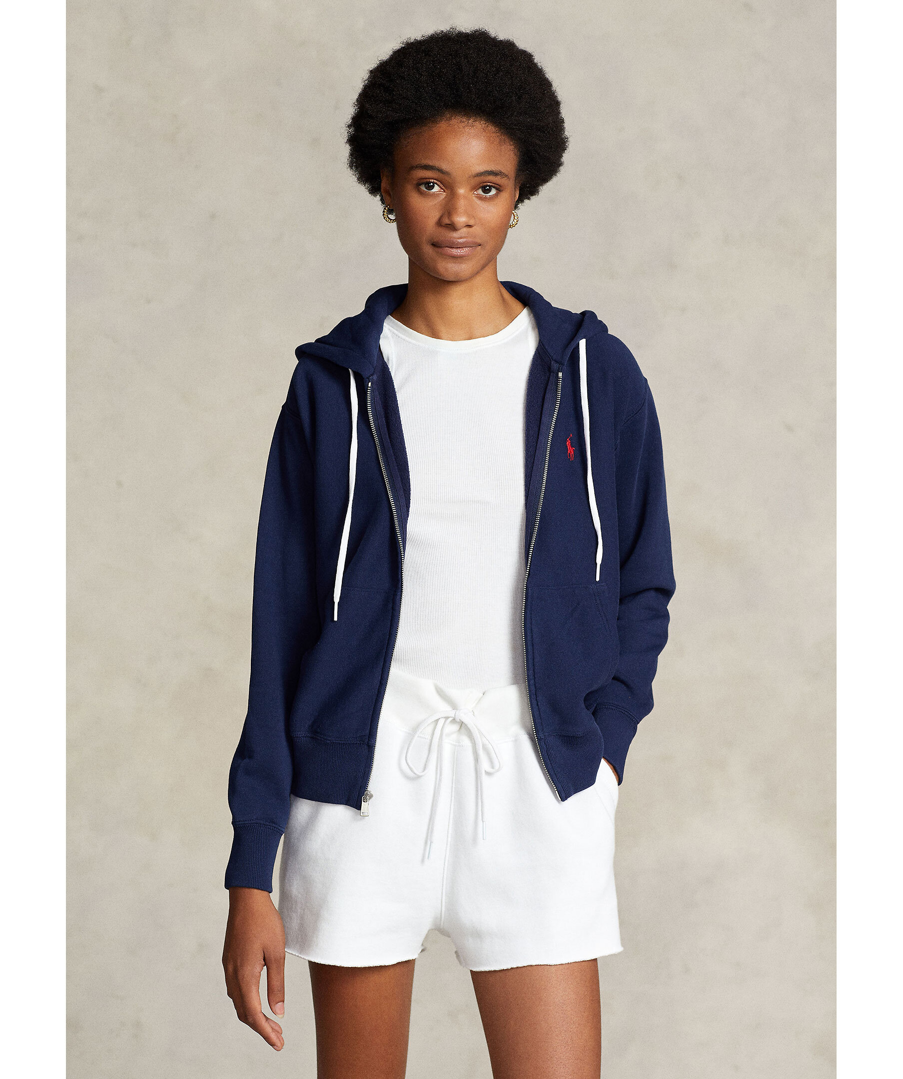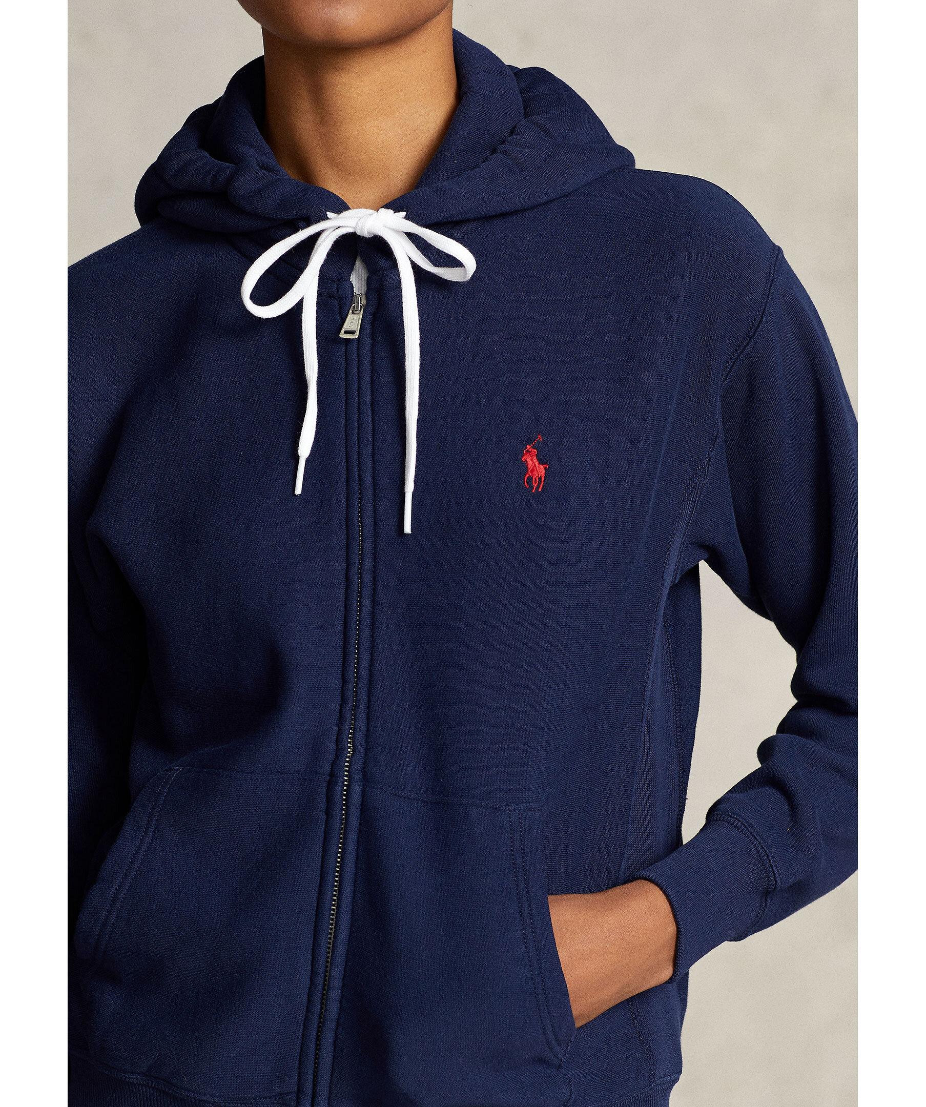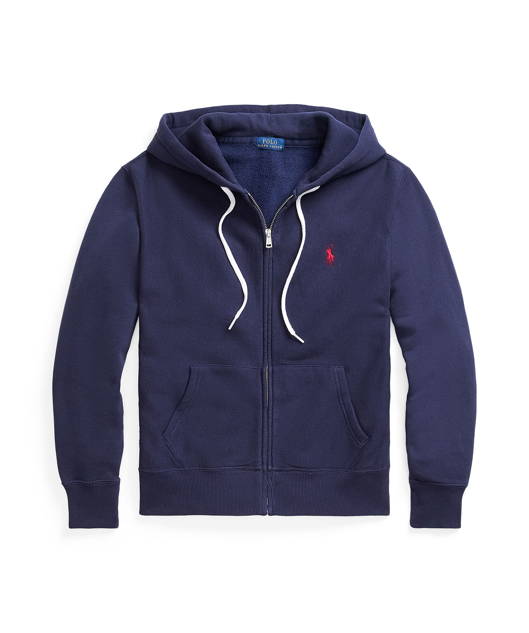 Mörkblå hoodie från Polo Ralph Lauren. Tillverkad i bomull och polyester. Två fickor fram, broderad logotyp på bröstet och vit snörning i luvan. Stängs med dragkedja och ribbade muddar i ärmslut och plaggslut samt borstad insida.
