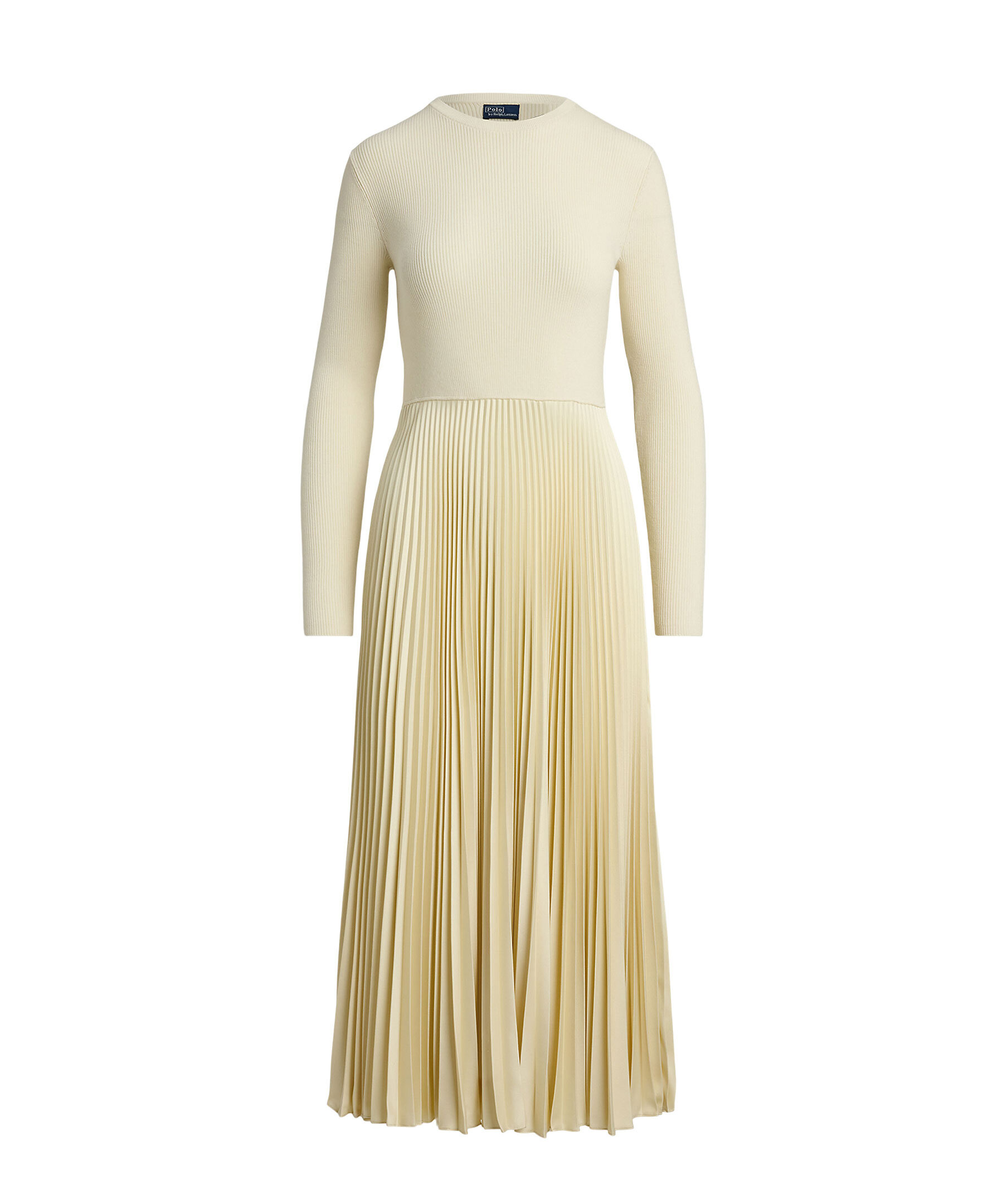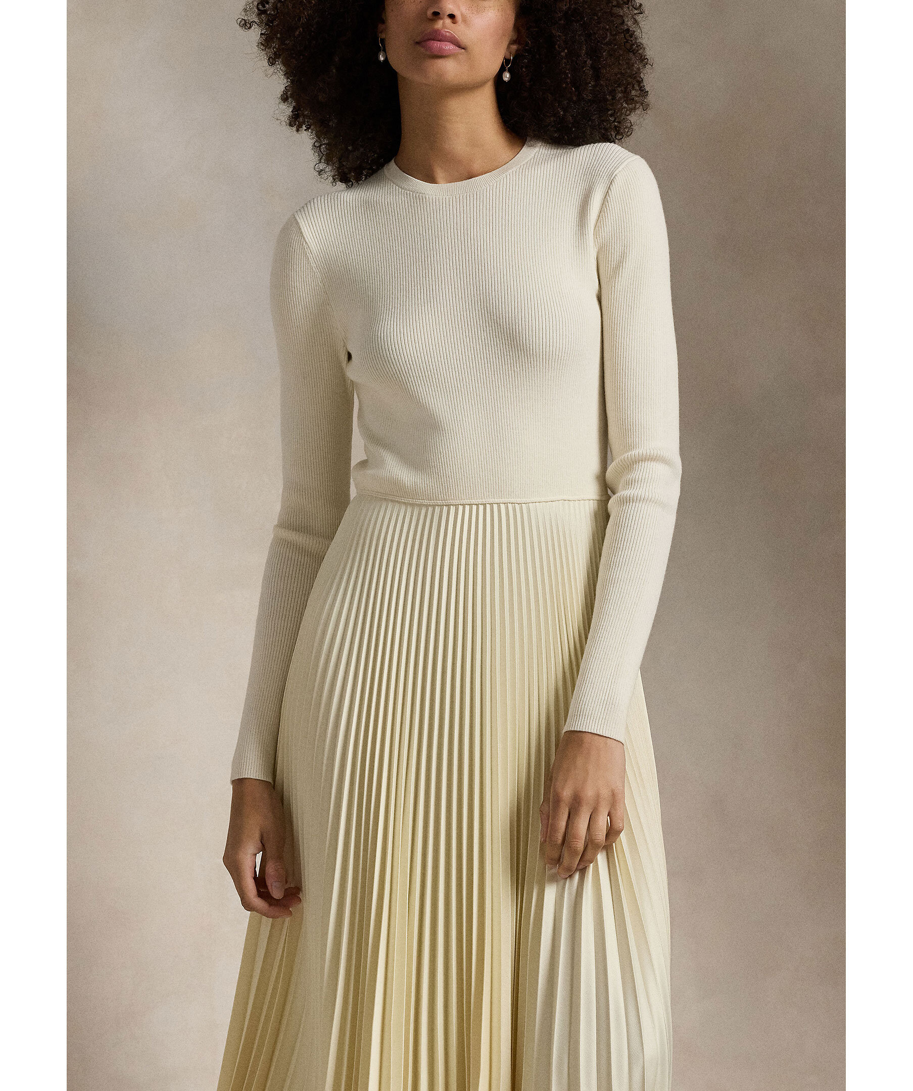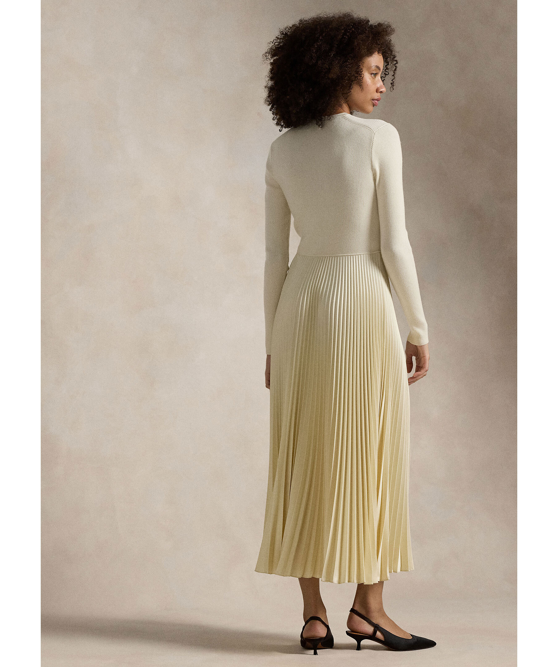 Krämvit långärmad klänning. Klänningen har plisserad nederdel och ribbstickad överdel. Tillverkad av en mjuk ullblandning med en touch av stretch.