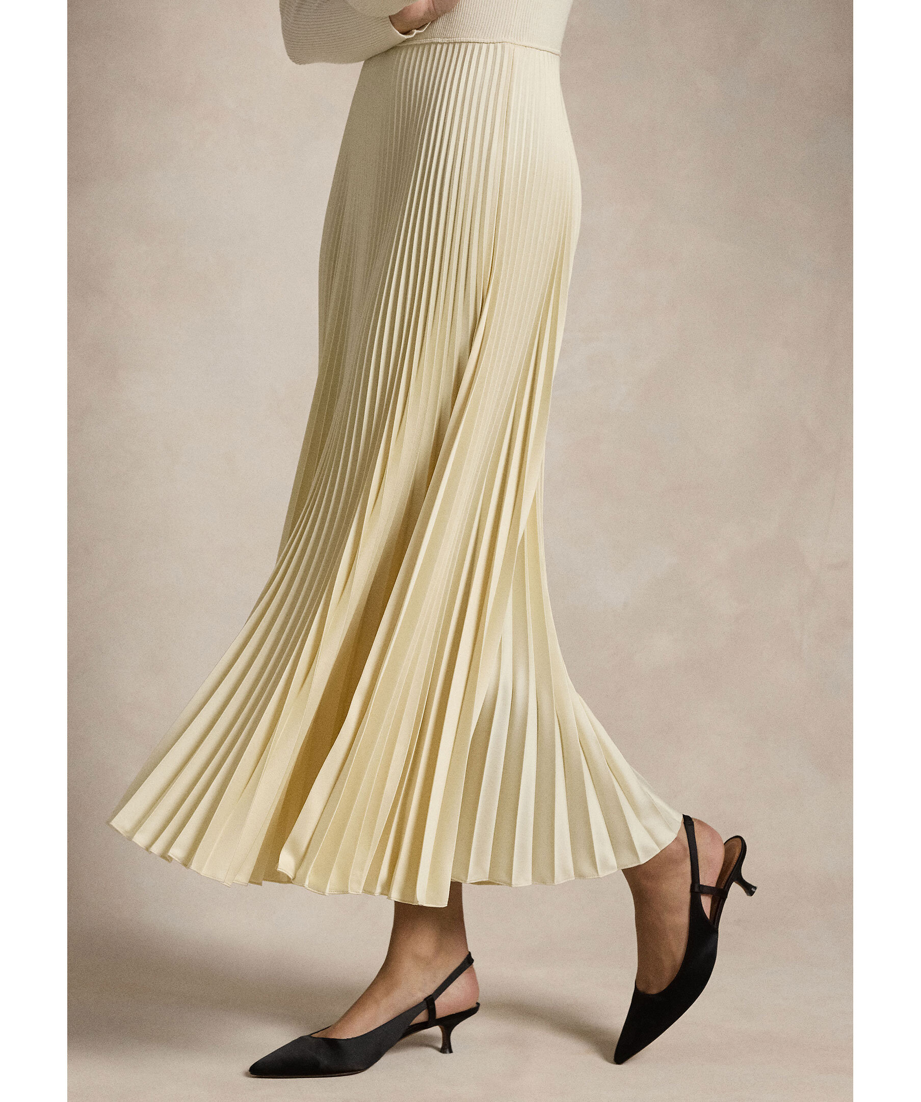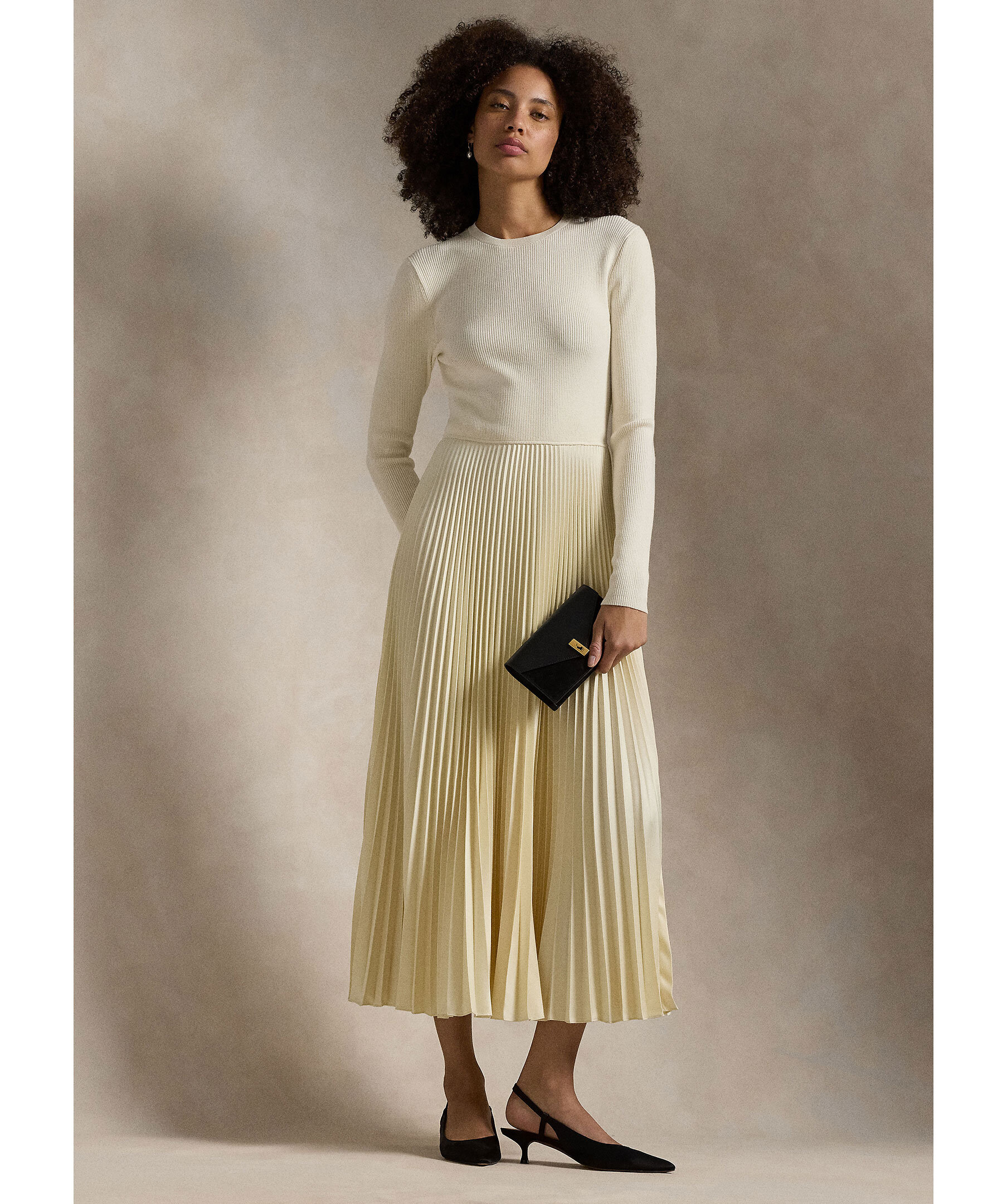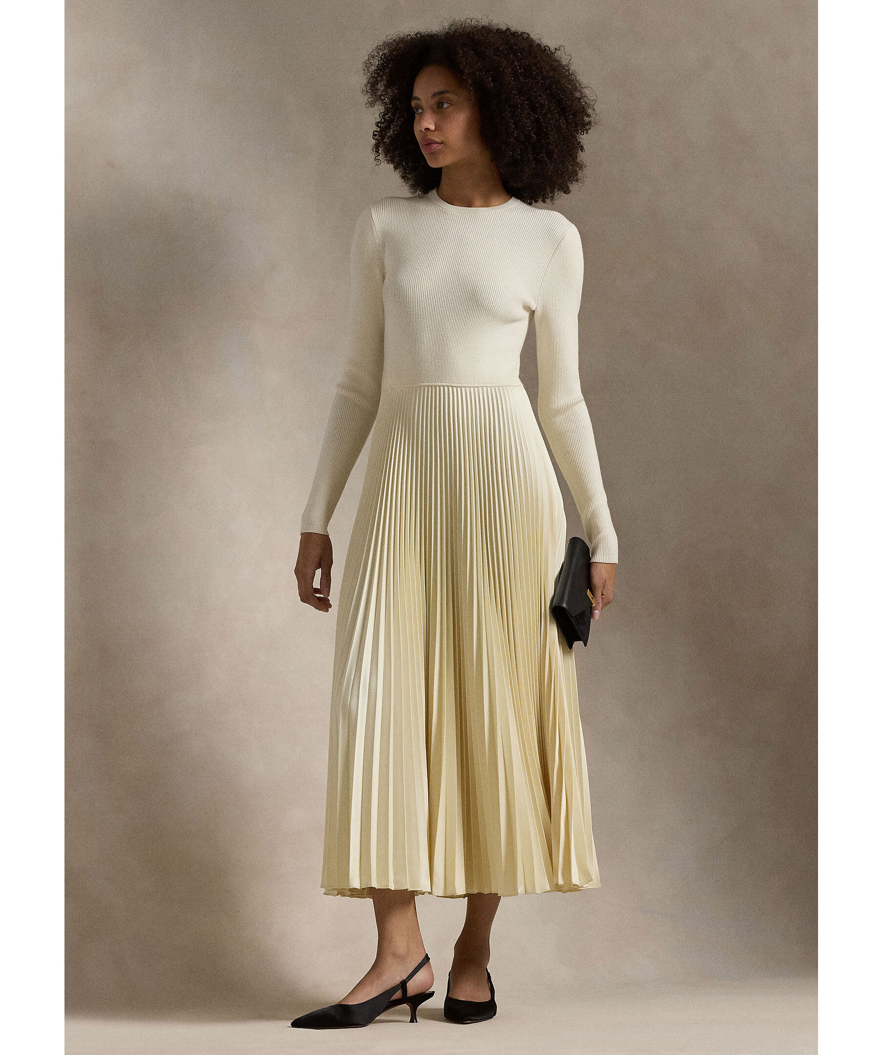 Krämvit långärmad klänning. Klänningen har plisserad nederdel och ribbstickad överdel. Tillverkad av en mjuk ullblandning med en touch av stretch.