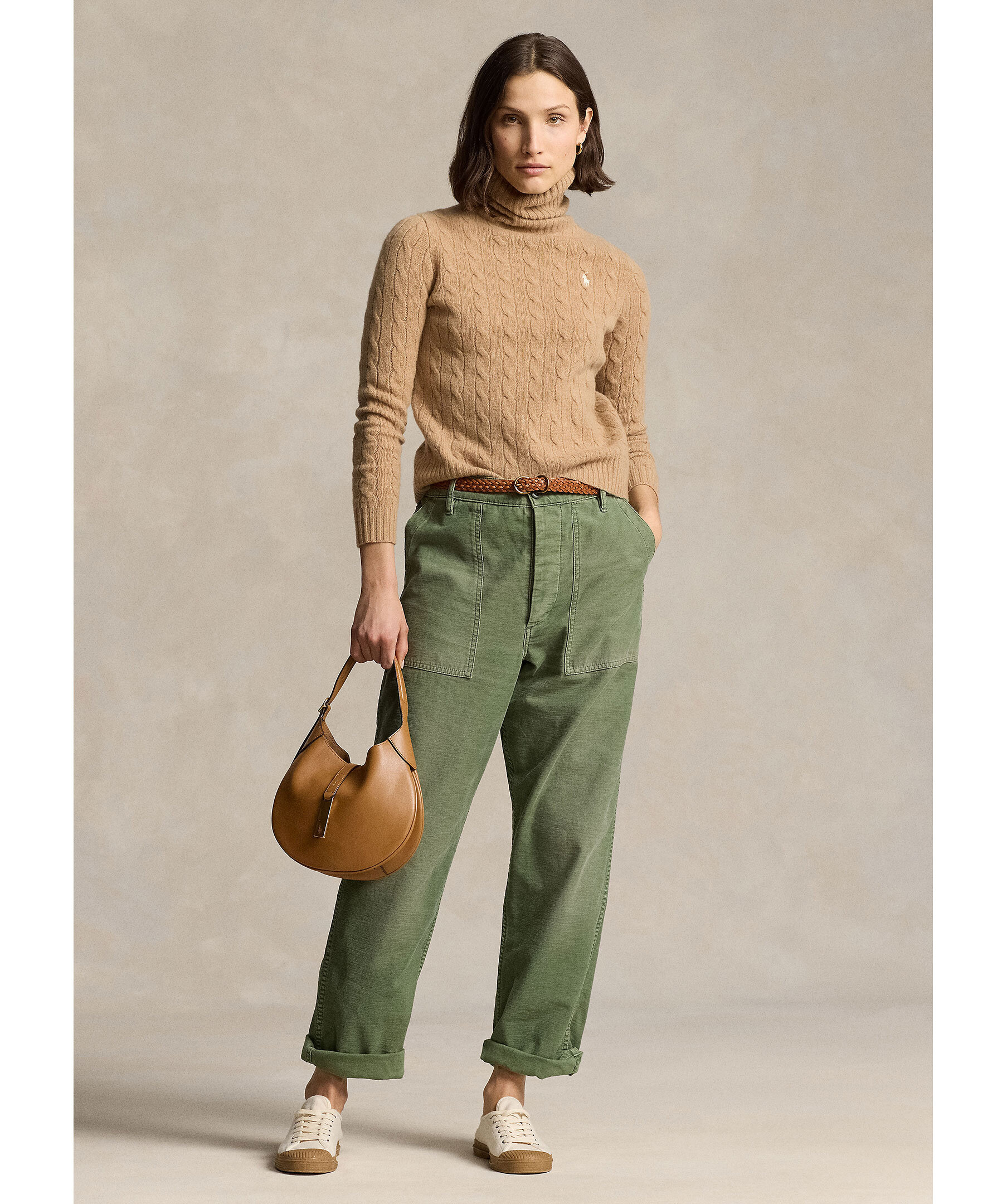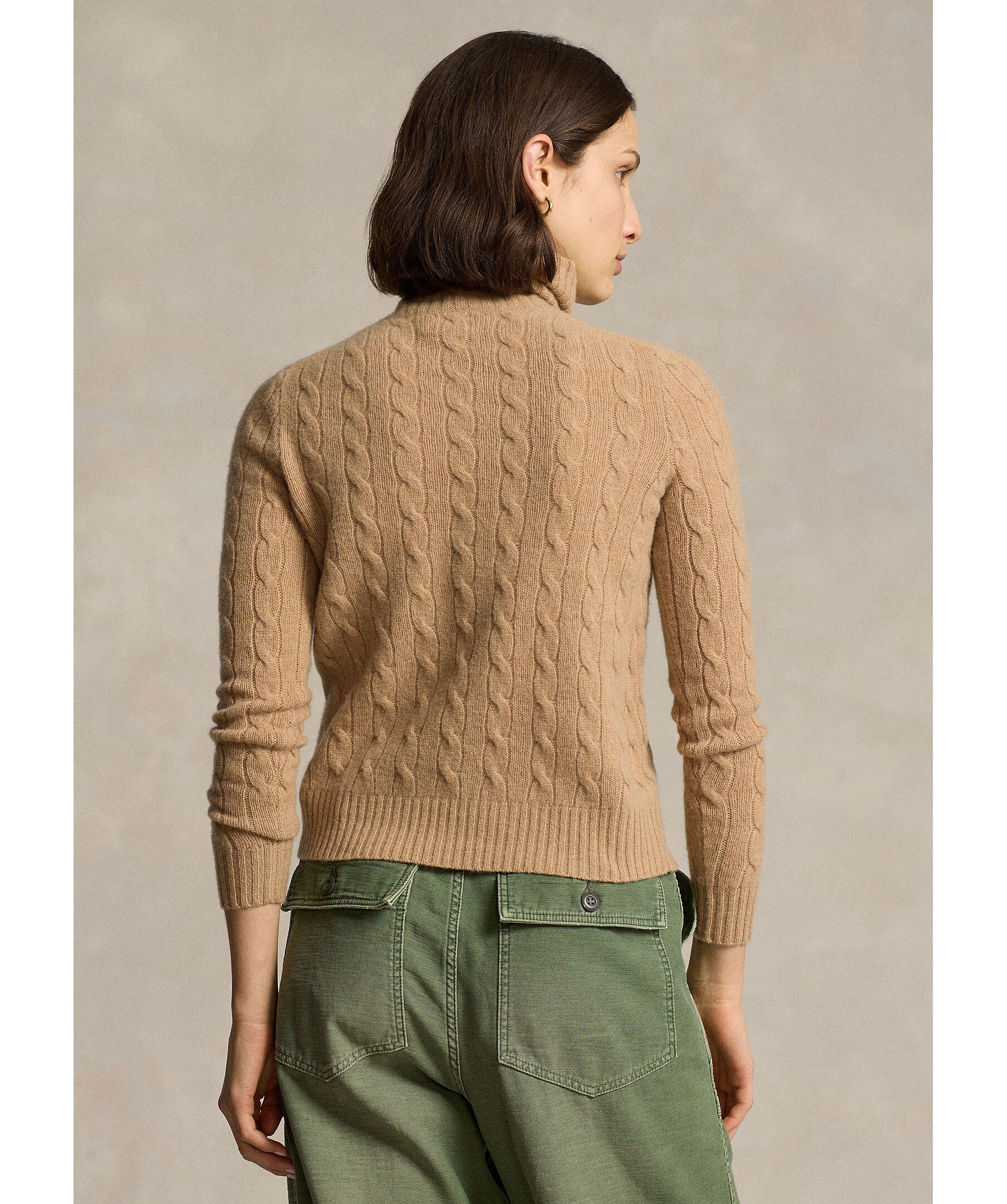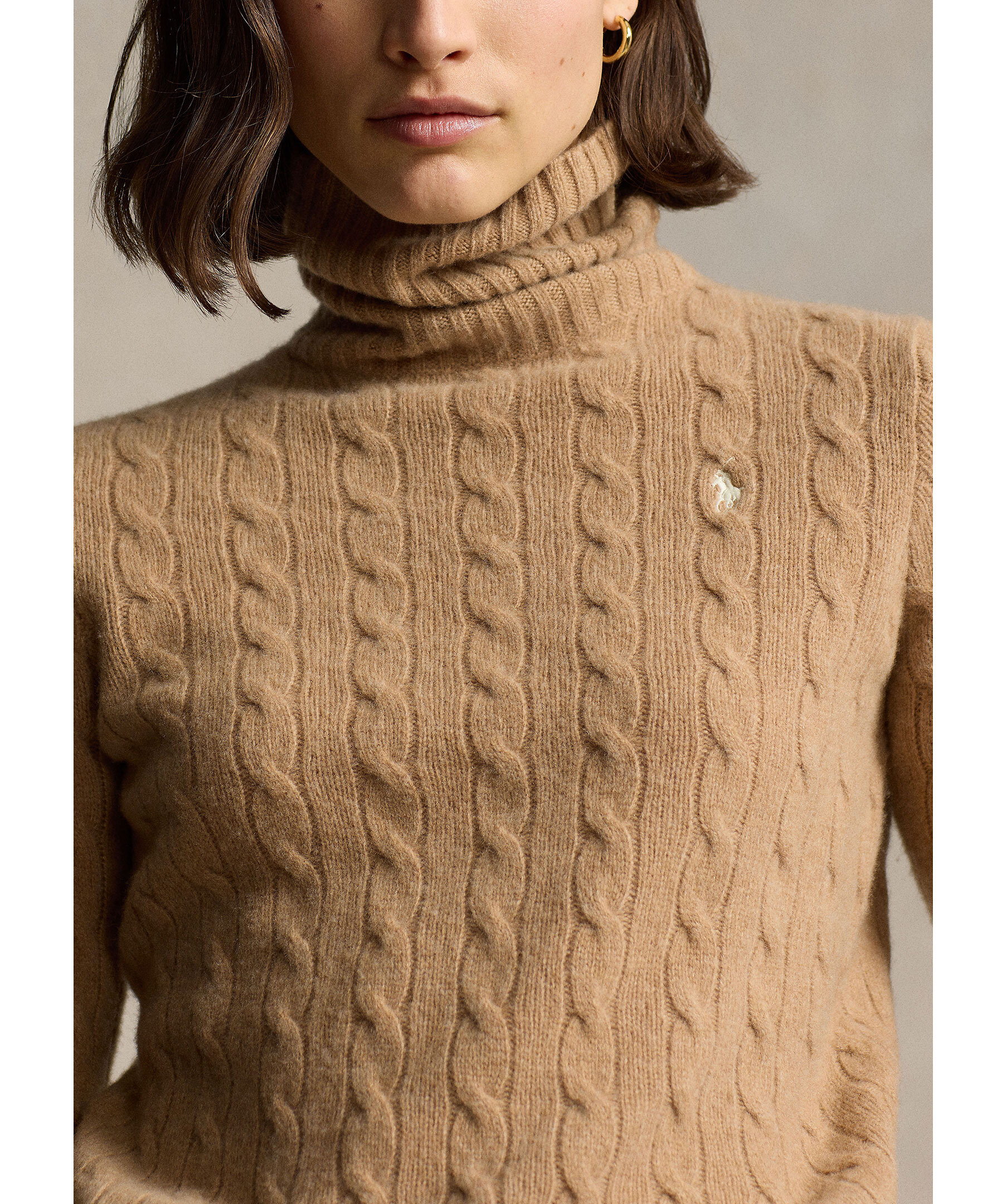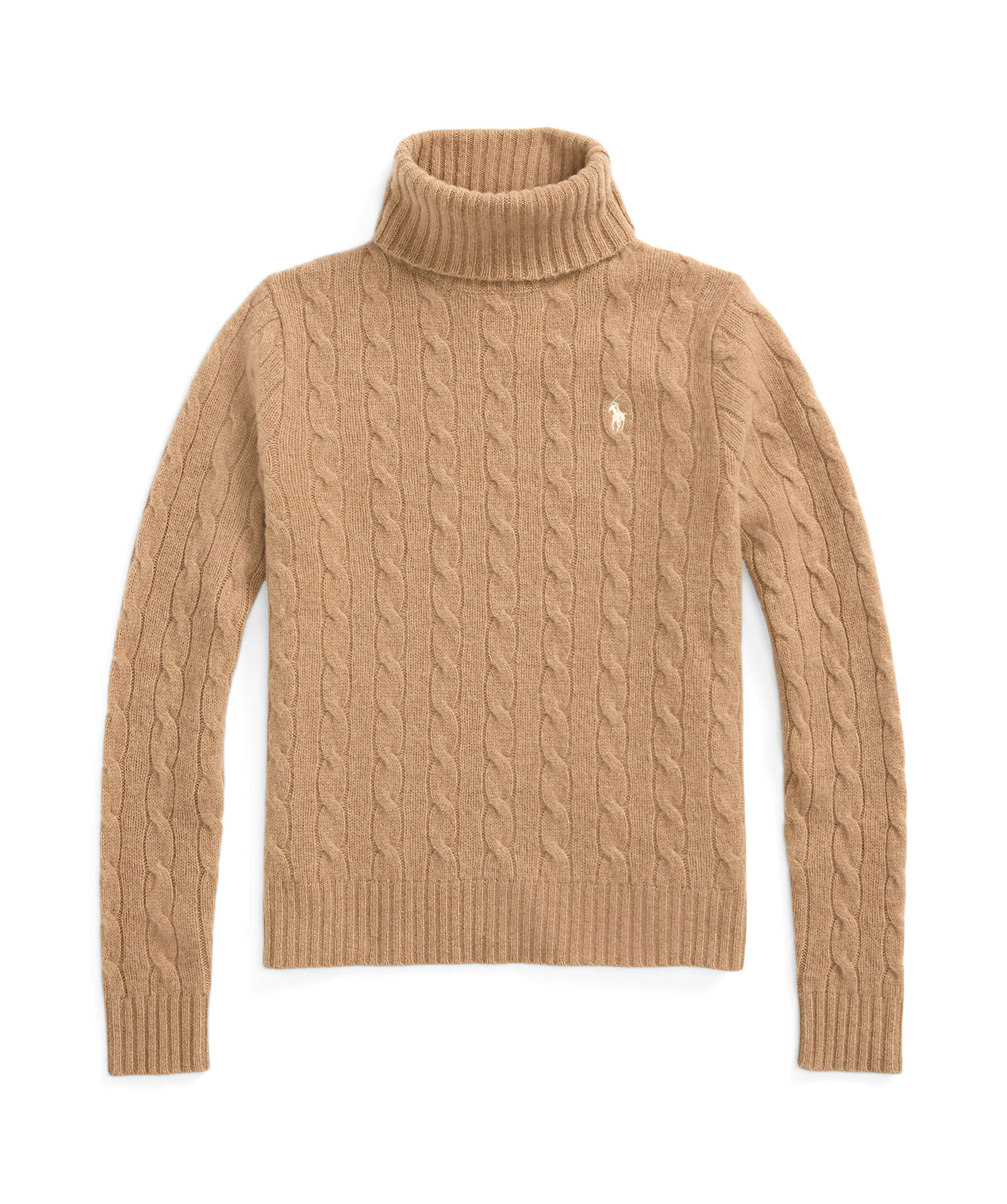 Kamelfärgad, kabelstickad polotröja från Polo Ralph Lauren. Tröjan har ribbstickade muddar och broderad logotyp på bröstet. Tillverkad i en kashmir- och ullblandning.