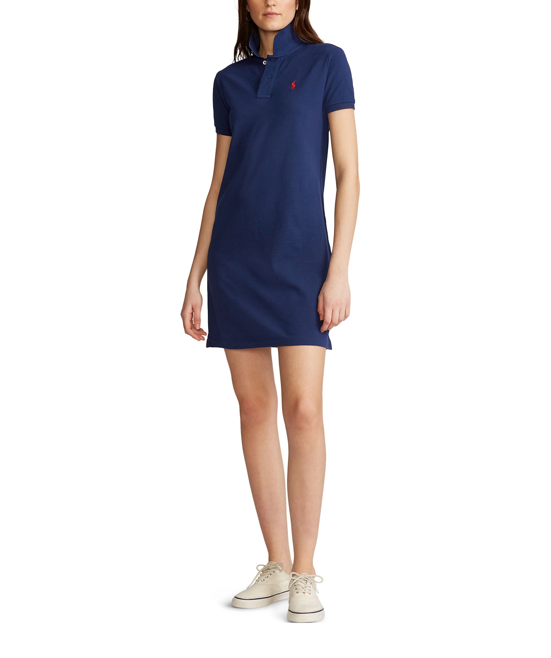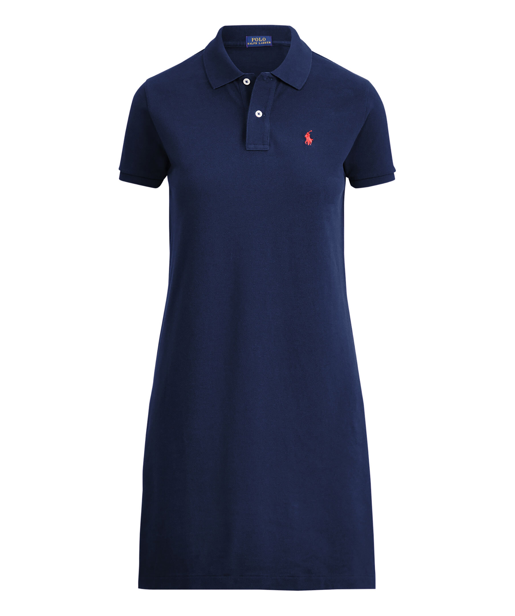 Mörkblå piké klänning från Polo Ralph Lauren. Broderad logotyp på vänster bröst i rött. Smal passform. Klänningen har en elastisk krage och två knappar. Tillverkad i bomulls blandning.
