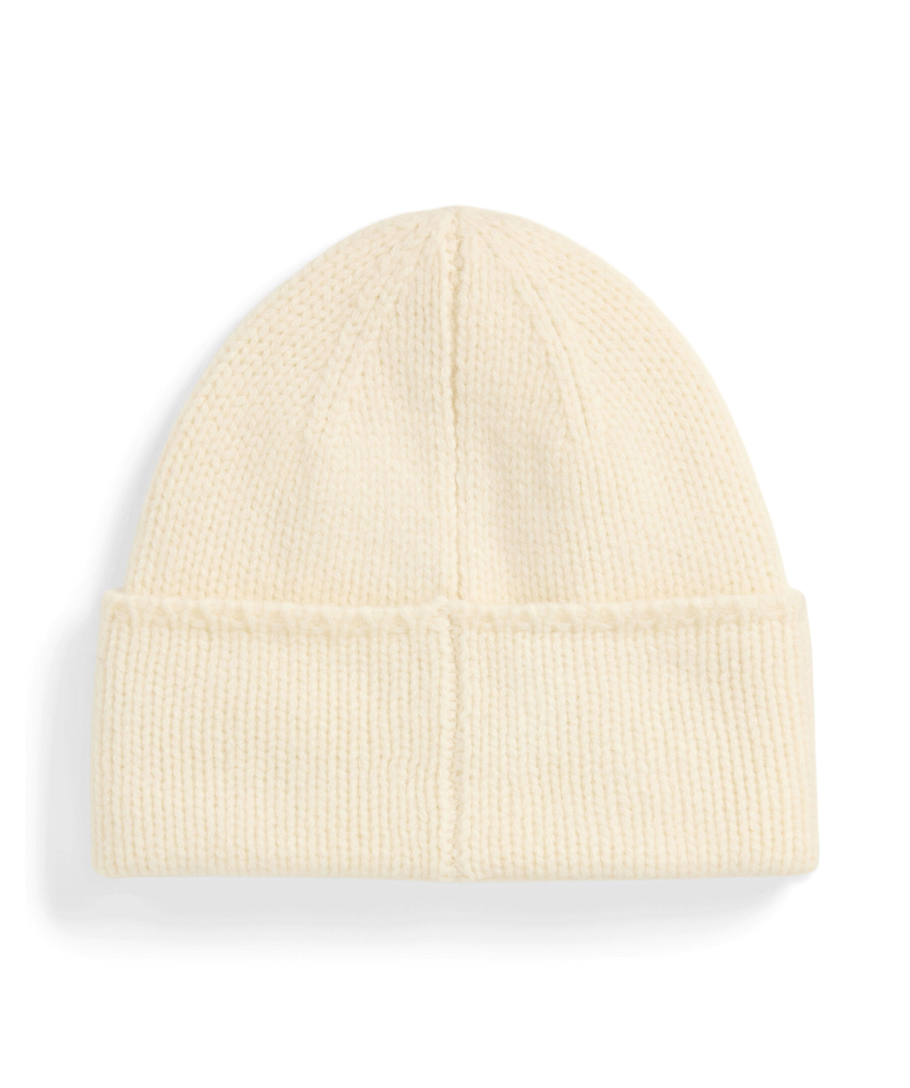 Krämvit, stickad mössa från Polo Ralph Lauren. Mössan har en uppvikt kant med broderad logotyp på framsidan. Tillverkad i en polyesterblandning.