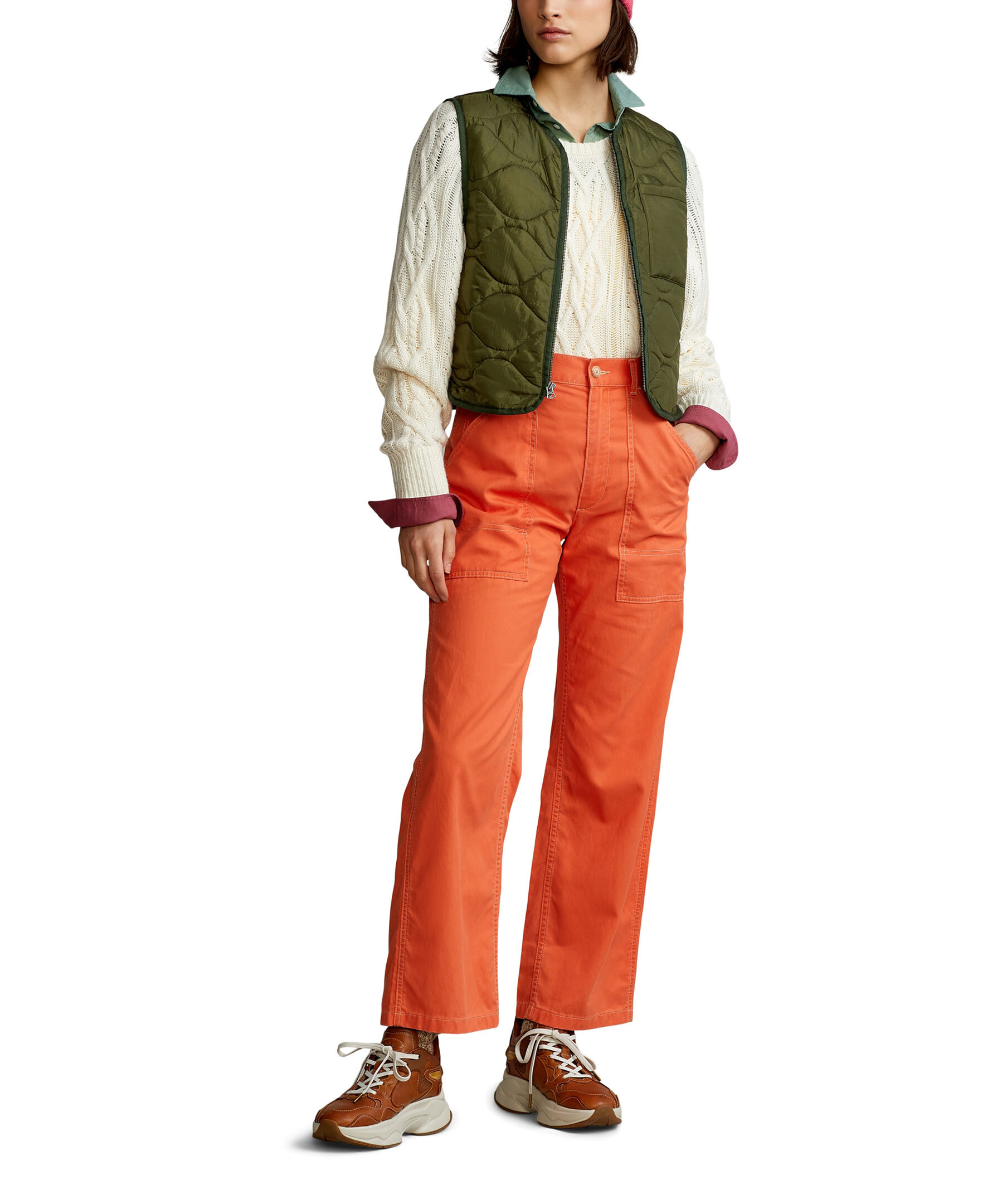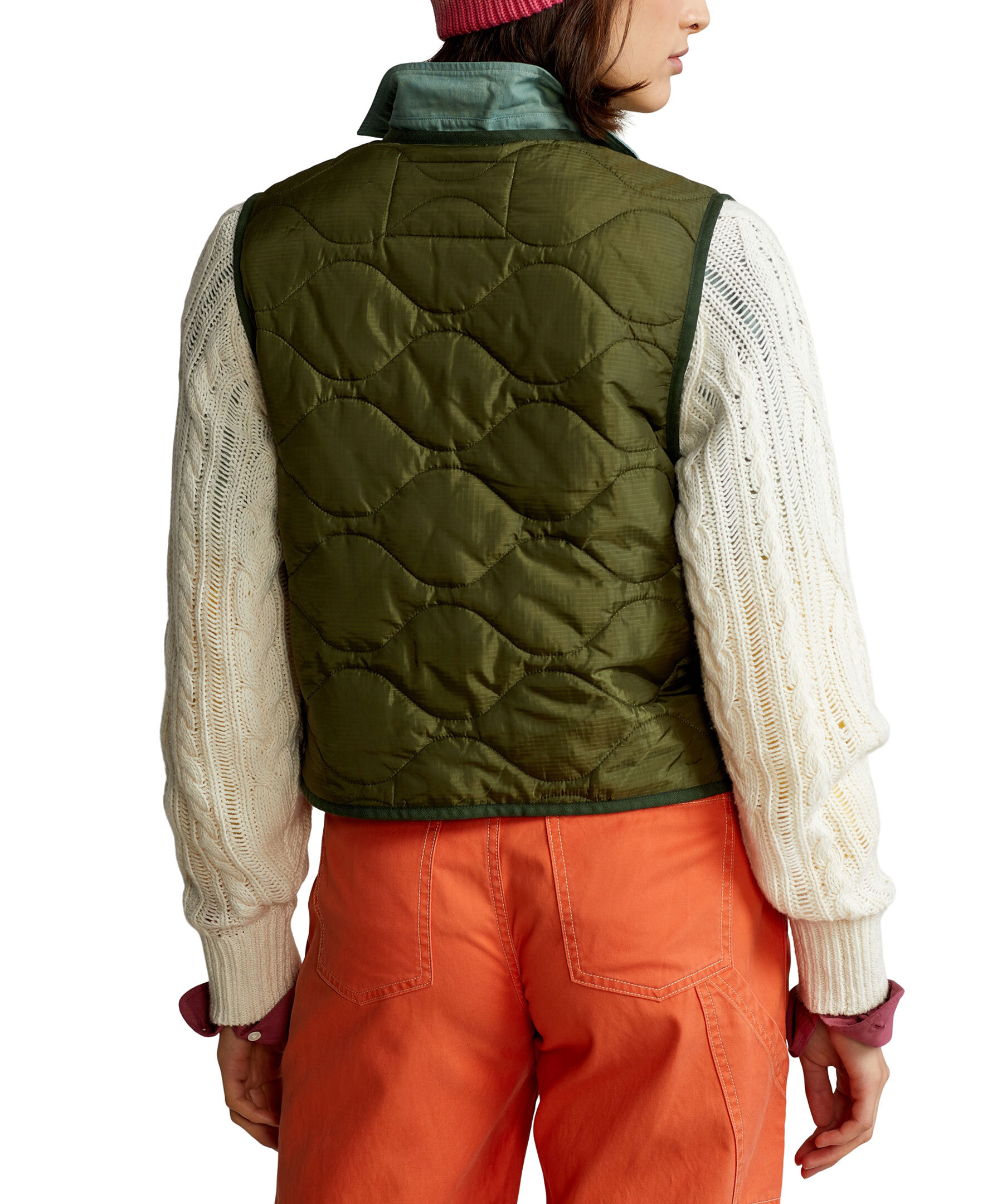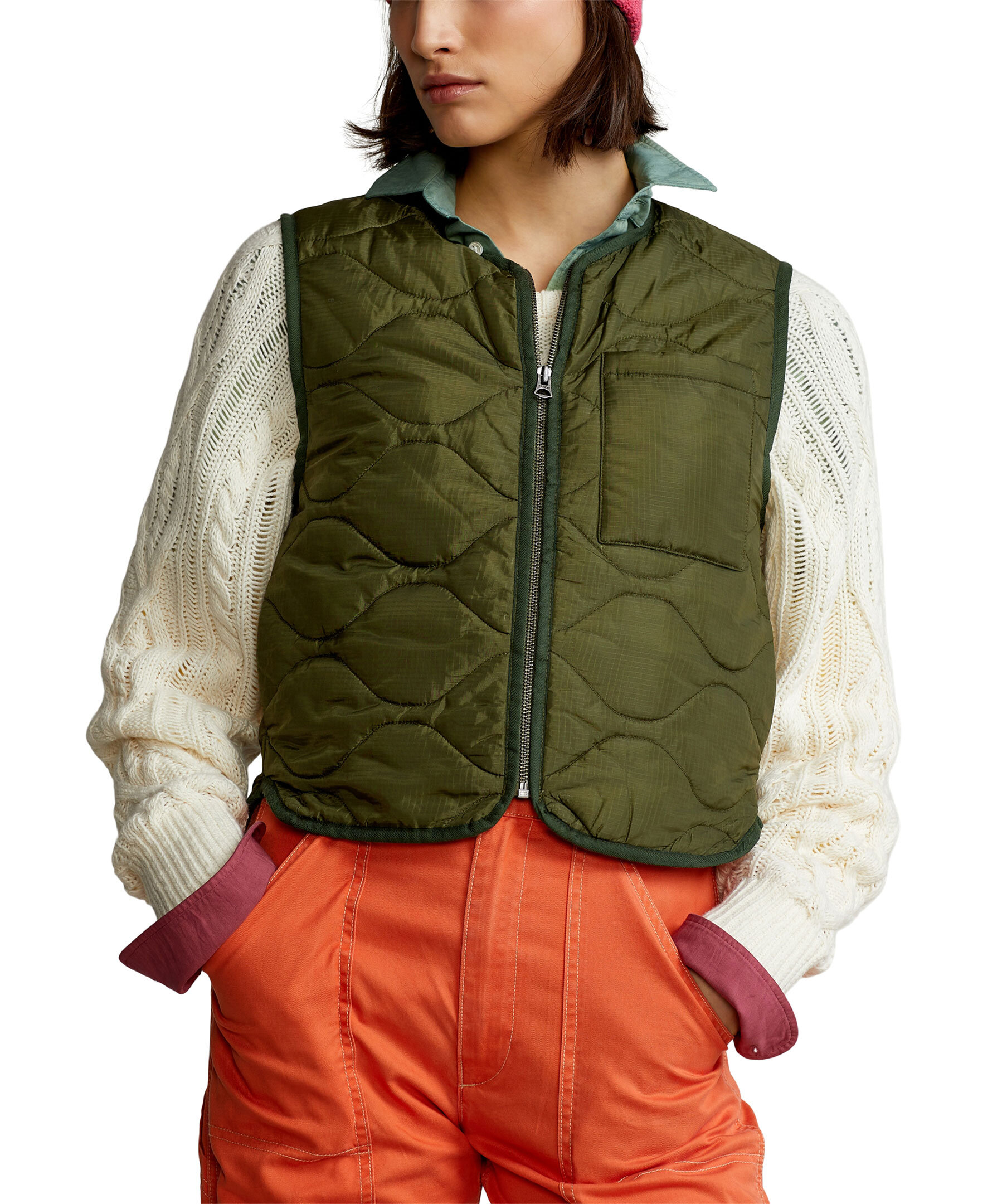 Olivfärgad, quiltad dunväst med rundad hals från Polo Ralph Lauren. Tillverkad i nylon med återvunnen polyesterfyllning. Stängs med dragkedja fram, har två öppna fickor i sidorna och en bröstficka. Smal kantsöm och rundade slitsar i sidorna.
