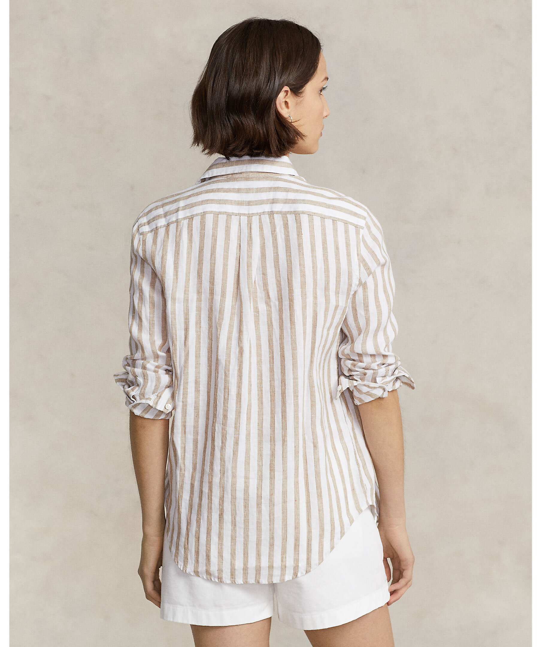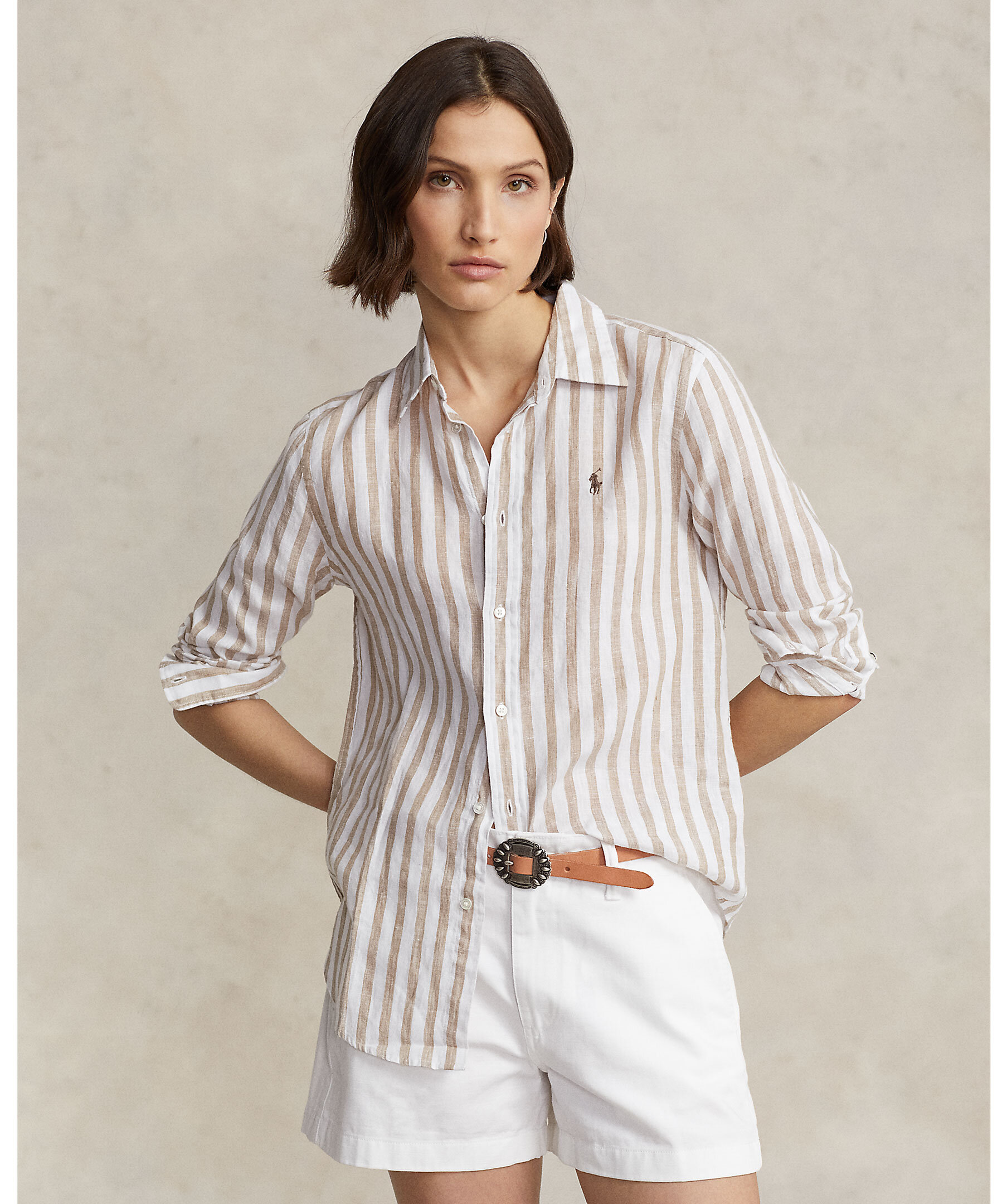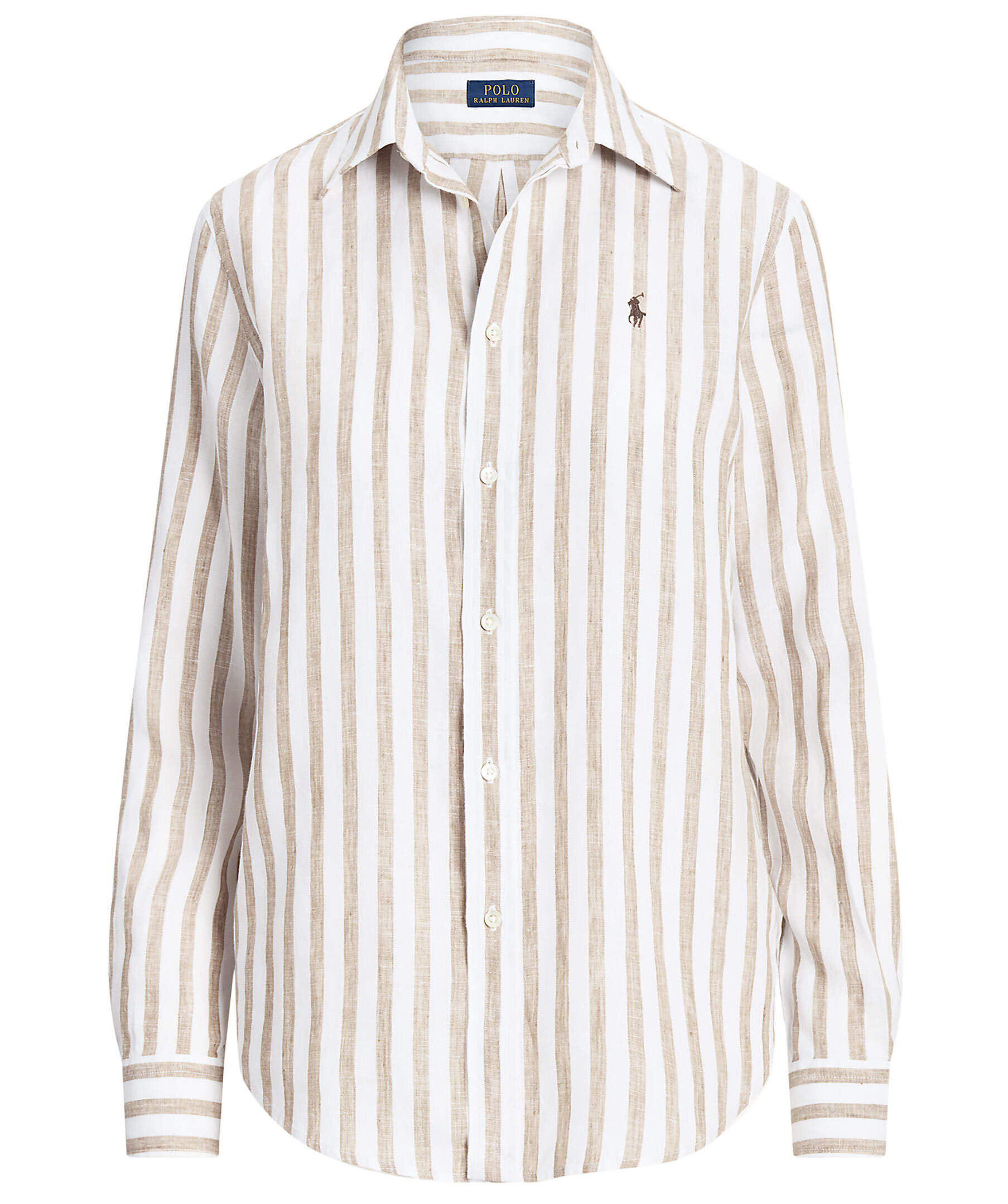 Beige och vit randig linneskjorta från Polo Ralph Lauren. Stängs framtill med knappar. Broderad logotyp på vänster bröst. Enkla manschetter. Tillverkad i linne. Spetsig krage. Boxpleat i ryggen. Lite oversized i passformen. Droppade axlar.