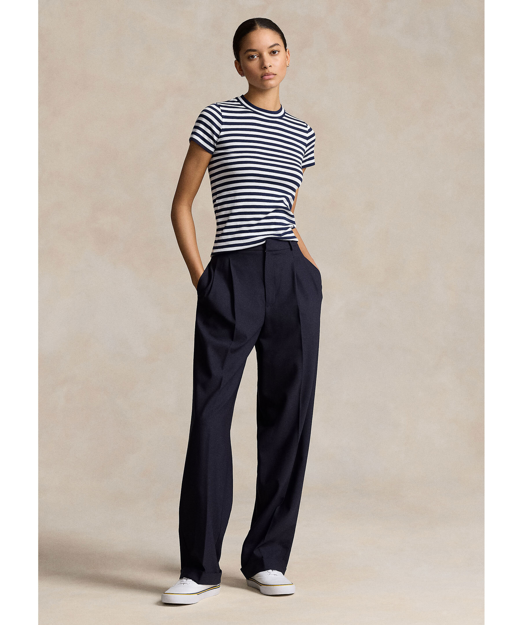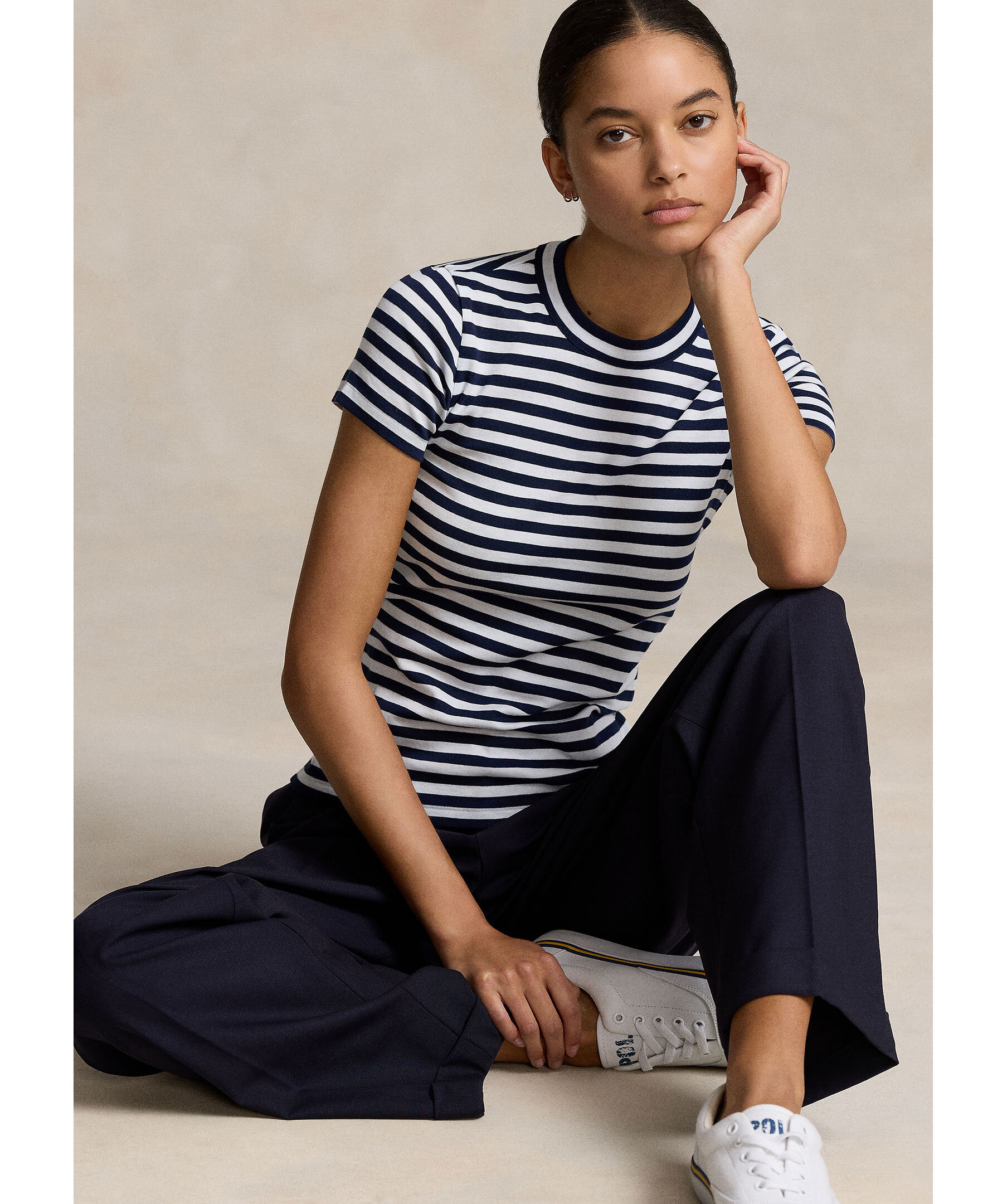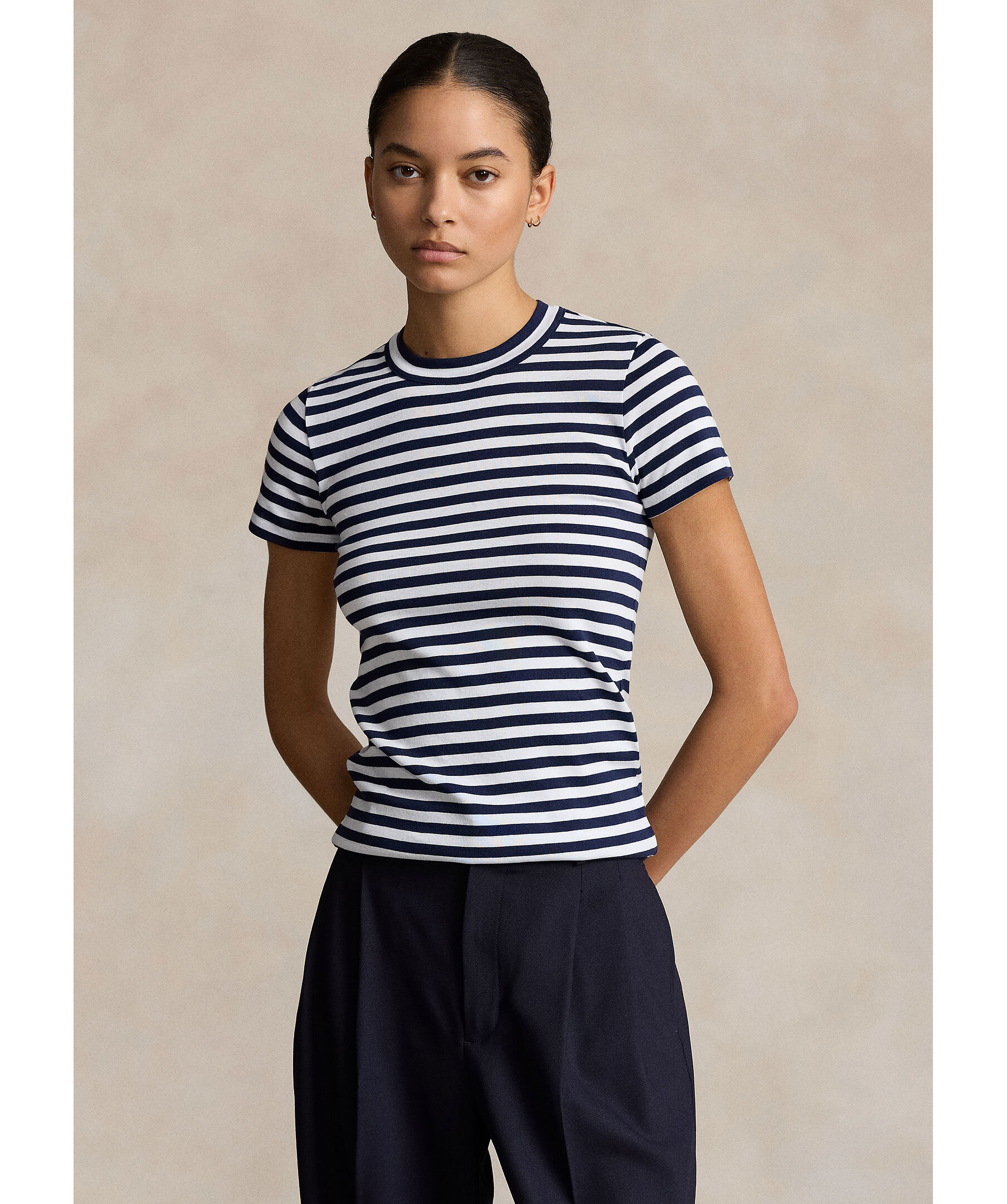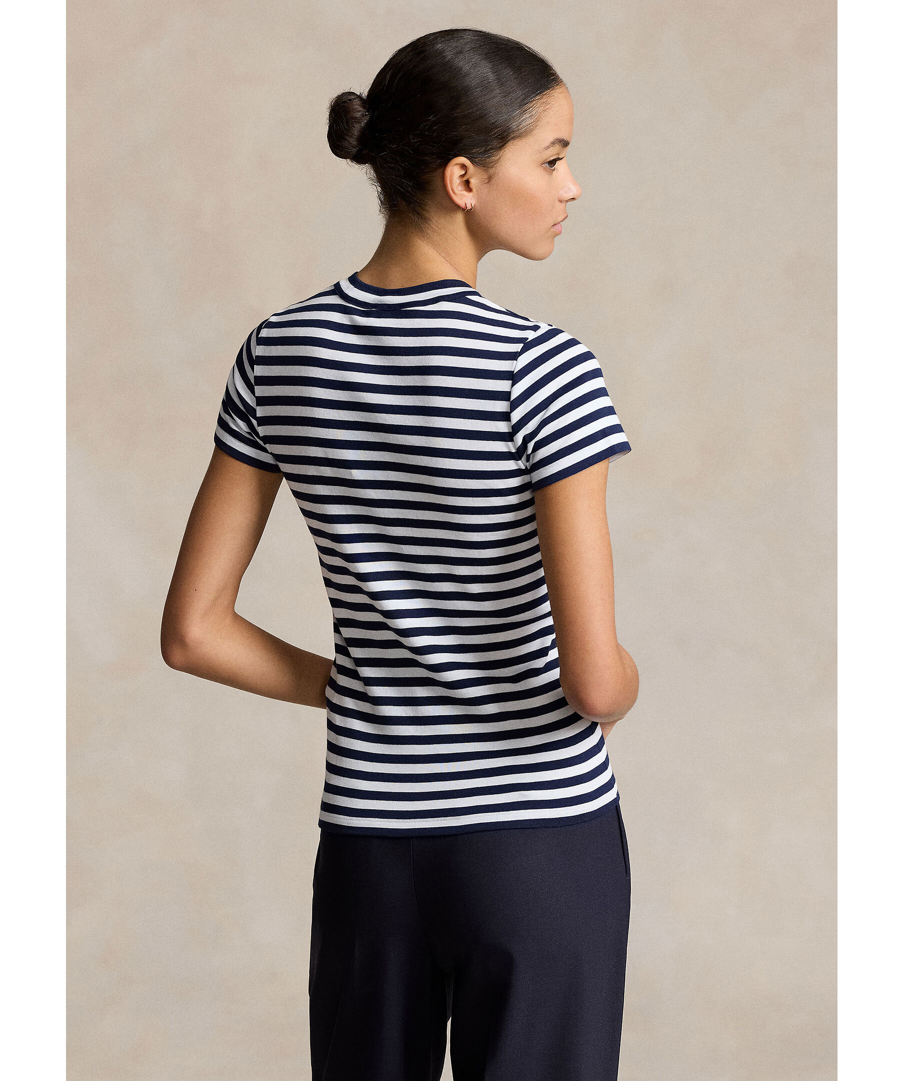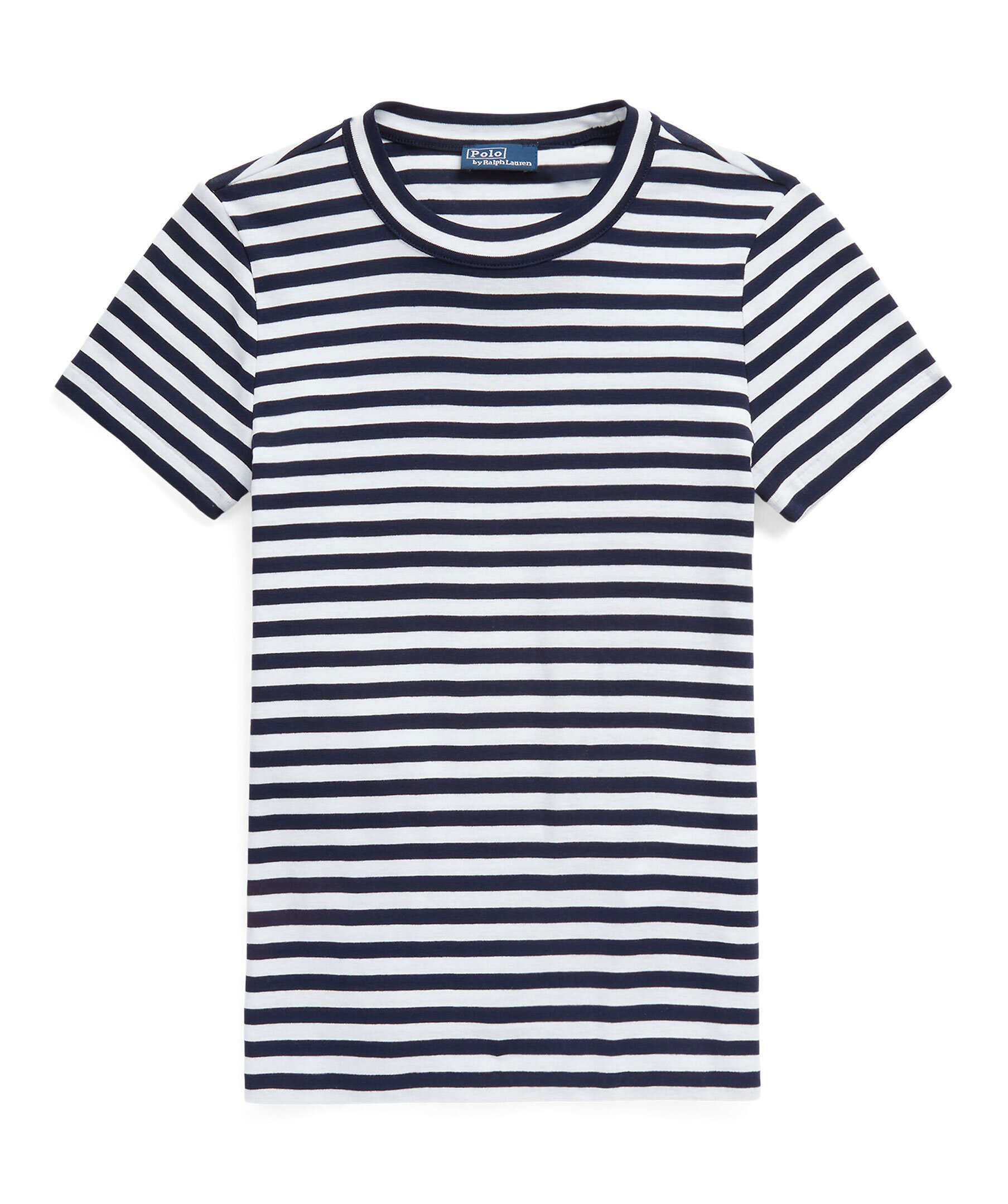 Vit och blårandig t-shirt från Polo Ralph Lauren. Tröjan har en rundad halsringning och är tillverkad av 100% bomull.