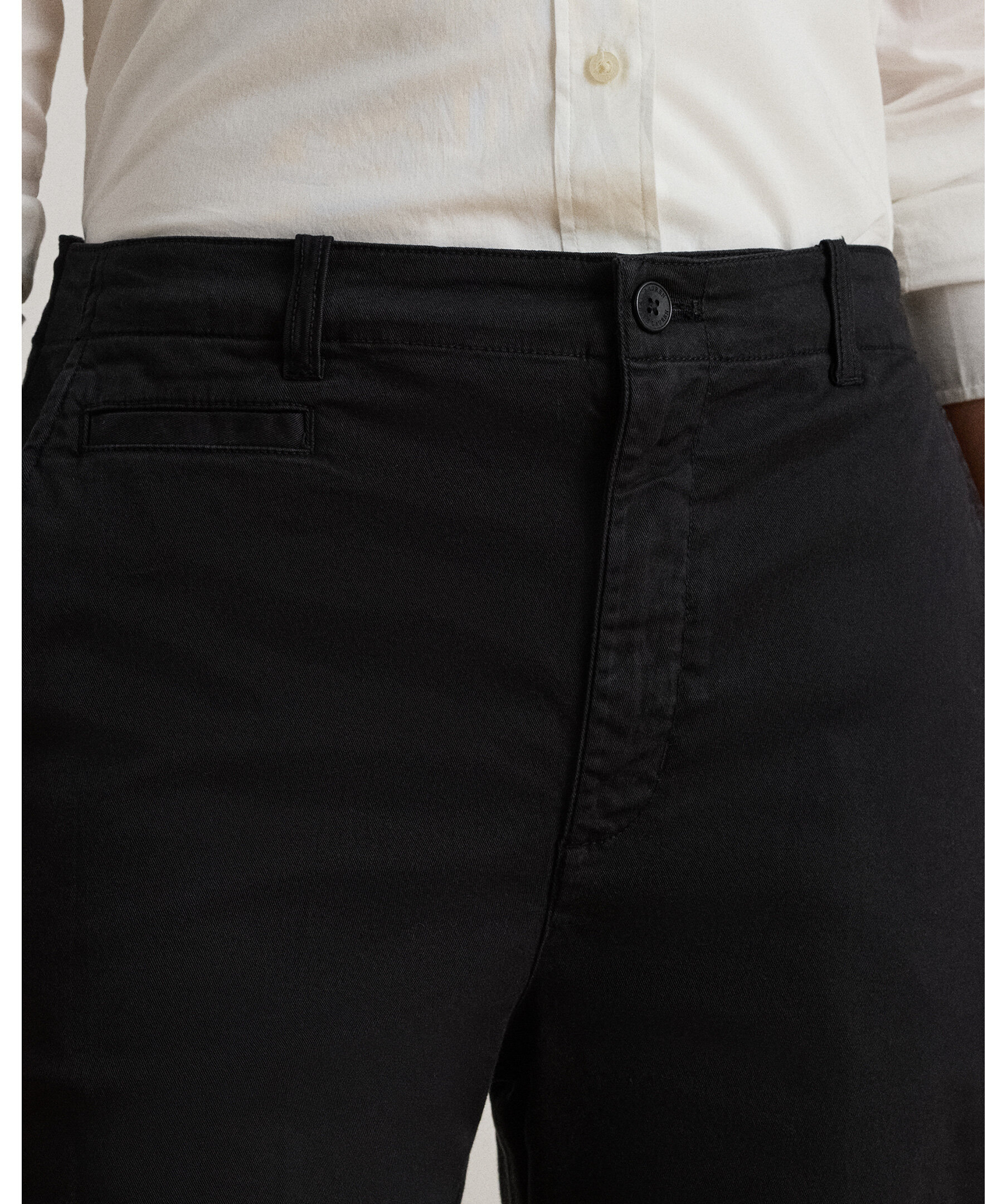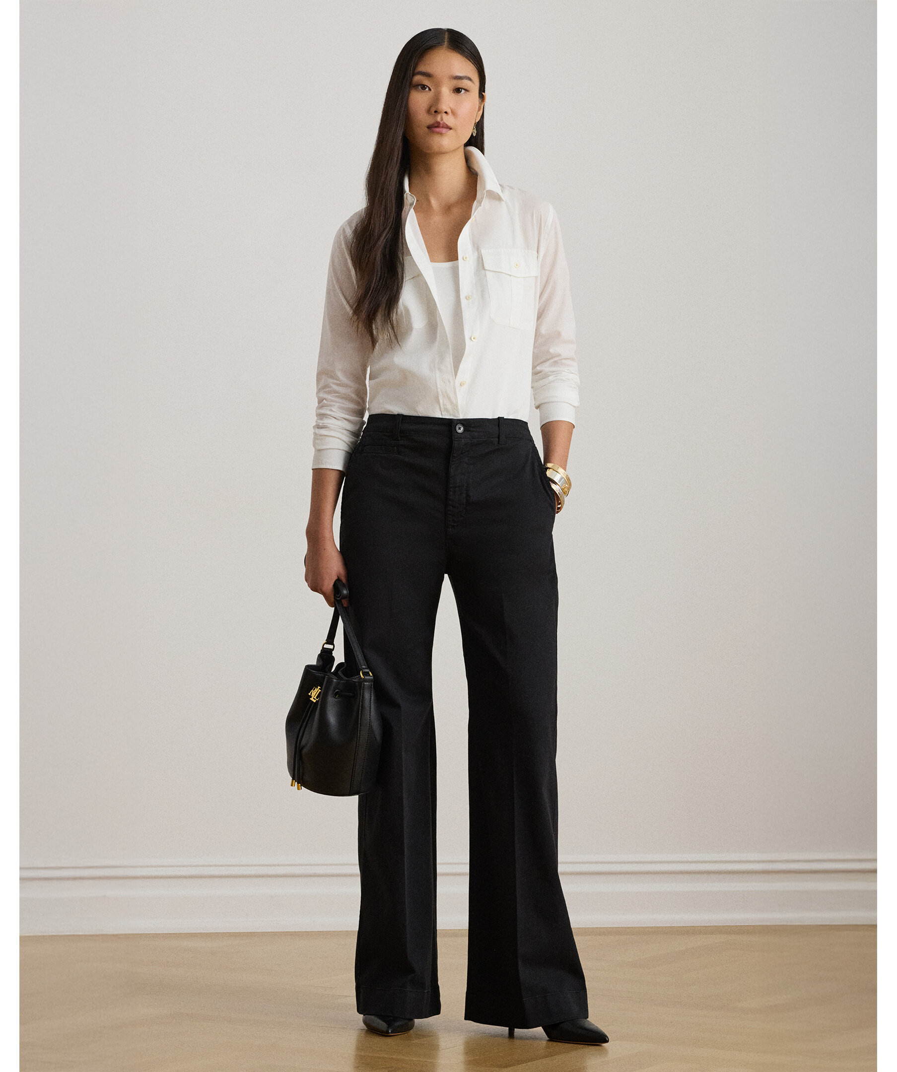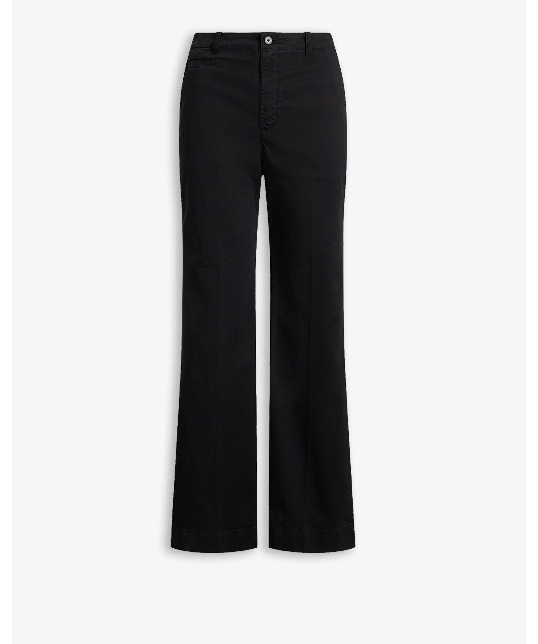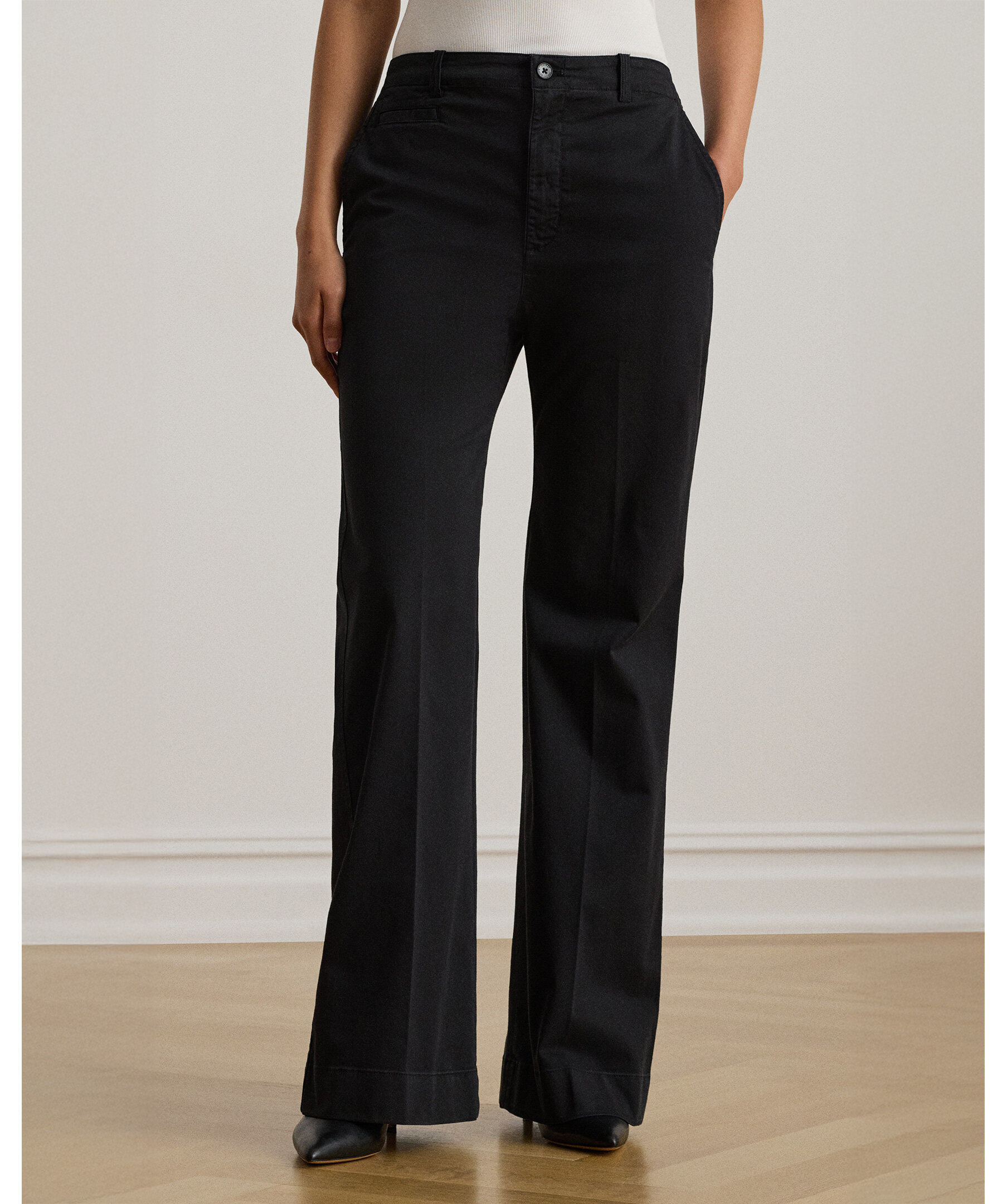 Svarta byxor med utsvängd passform från Polo Ralph Lauren. Byxorna har en high-rise midja och en ben-utvidgande flare-silhuett som förlänger benen och ger en elegant, klassisk look. De är designade i stretchig bomullschino med skarpa pressveck och klassiska detaljer som fickor och bältesöglor - perfekt för både kontors- och vardagsstil där du vill kombinera modern form med tidlös preppy-estetik.