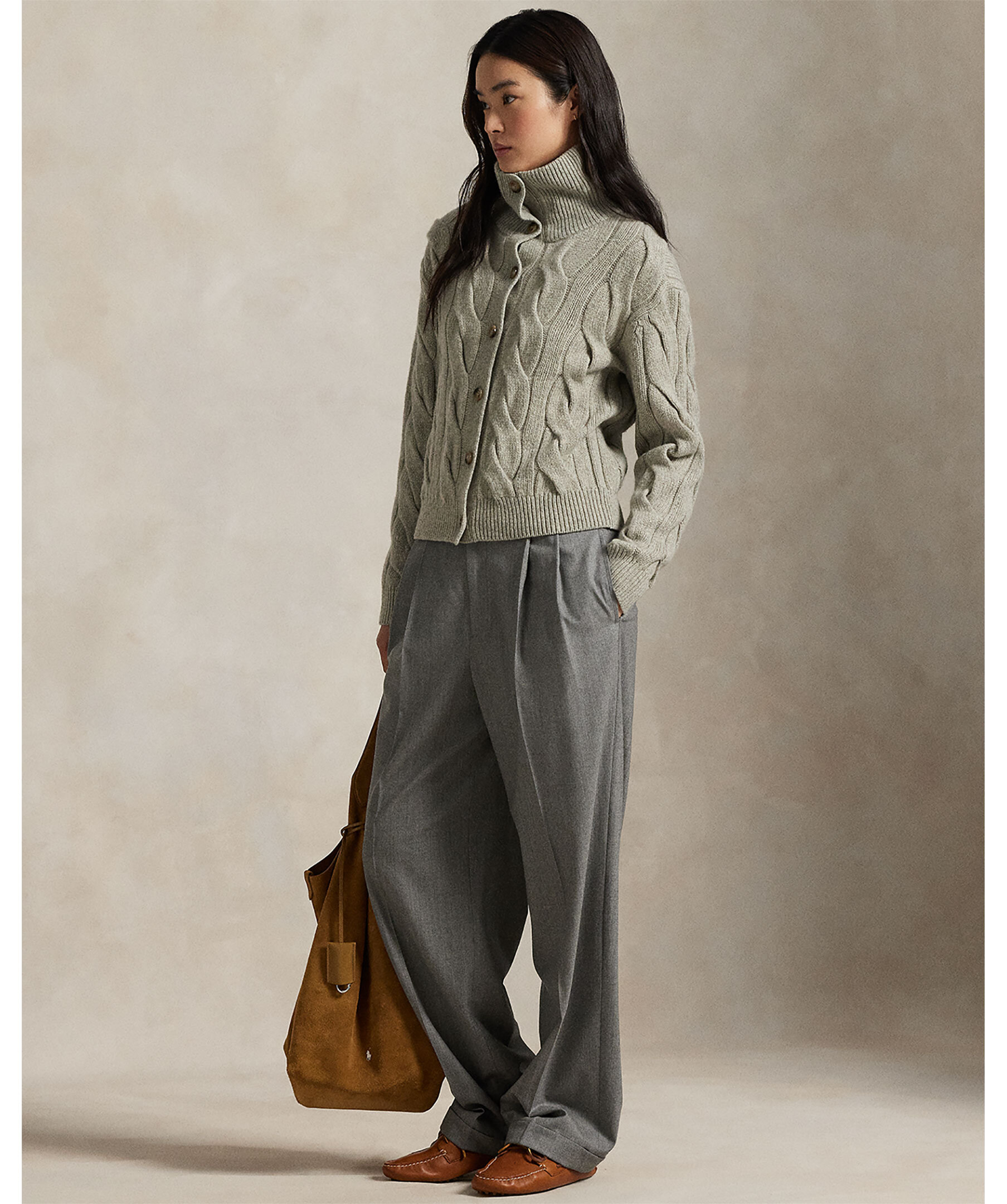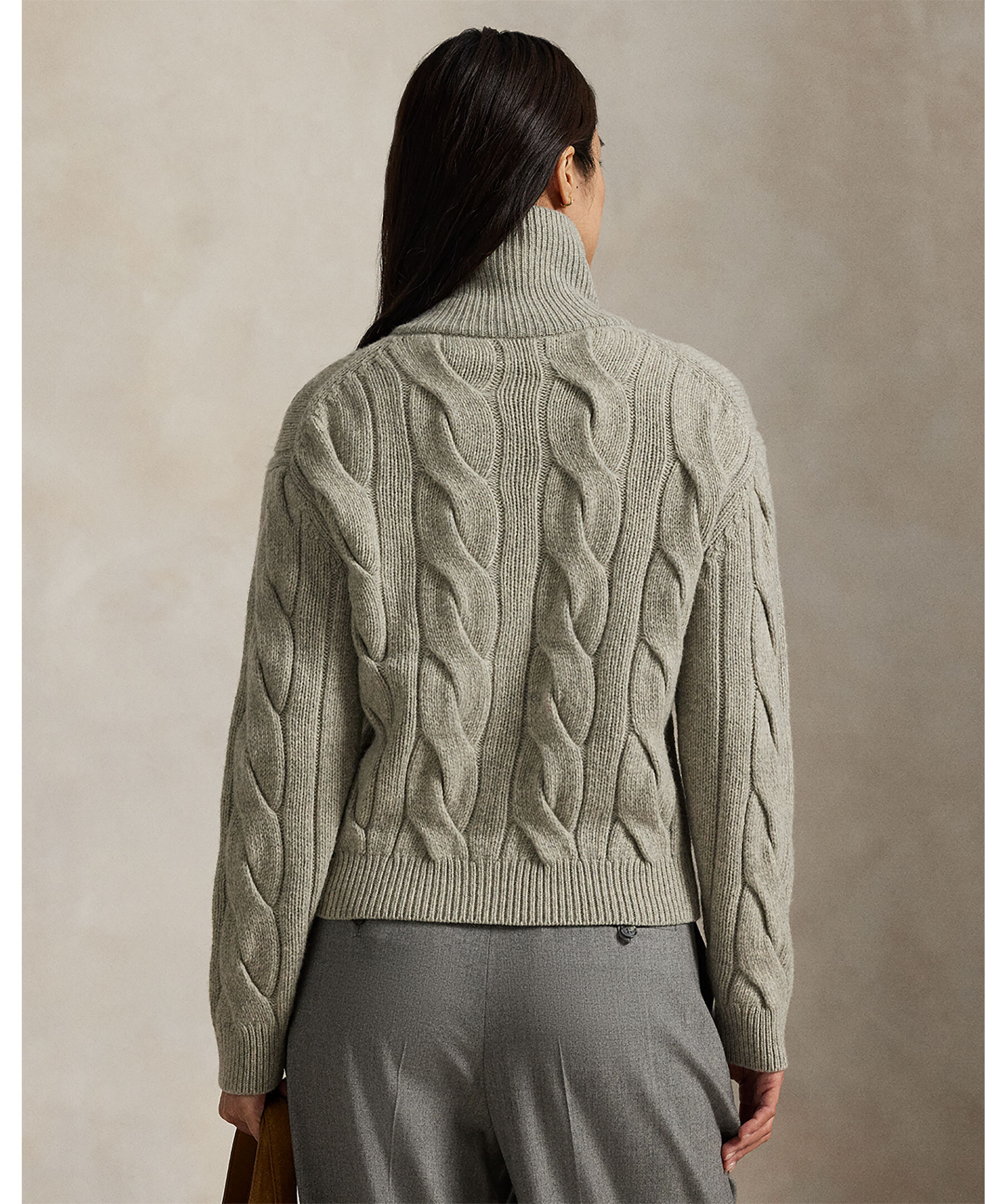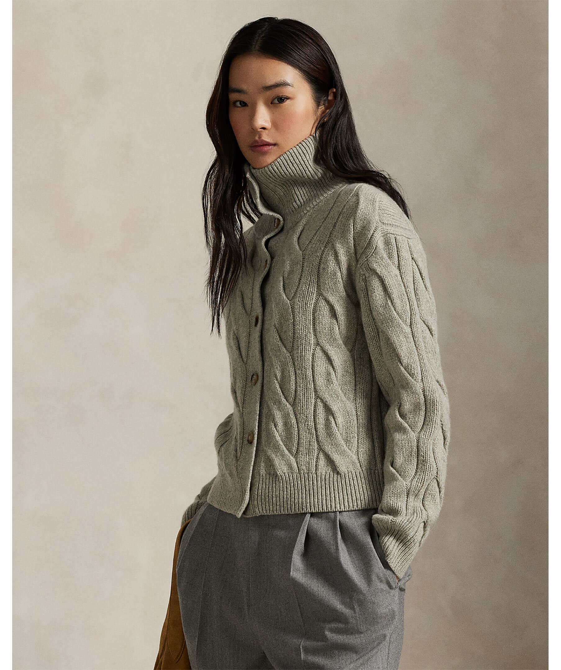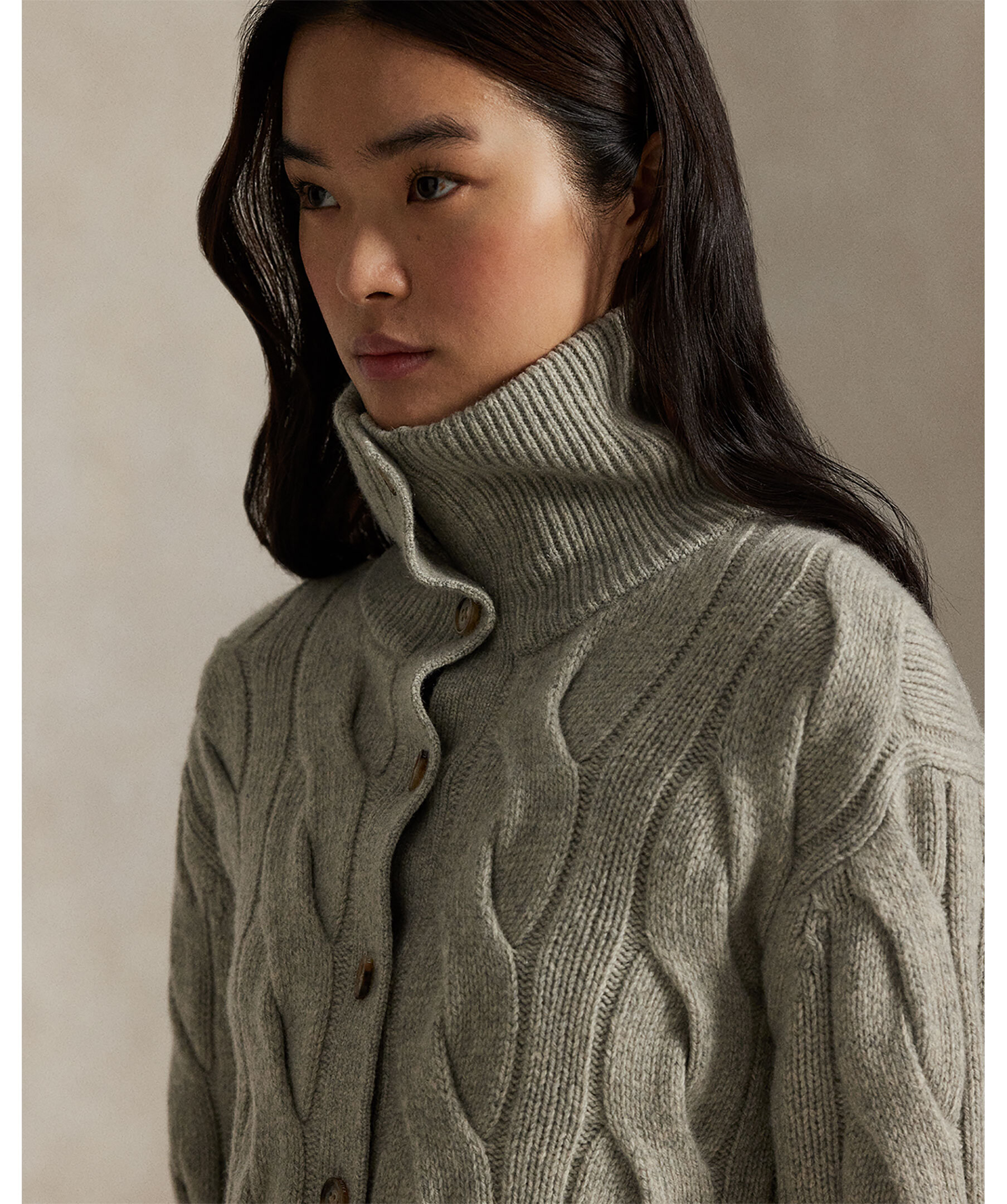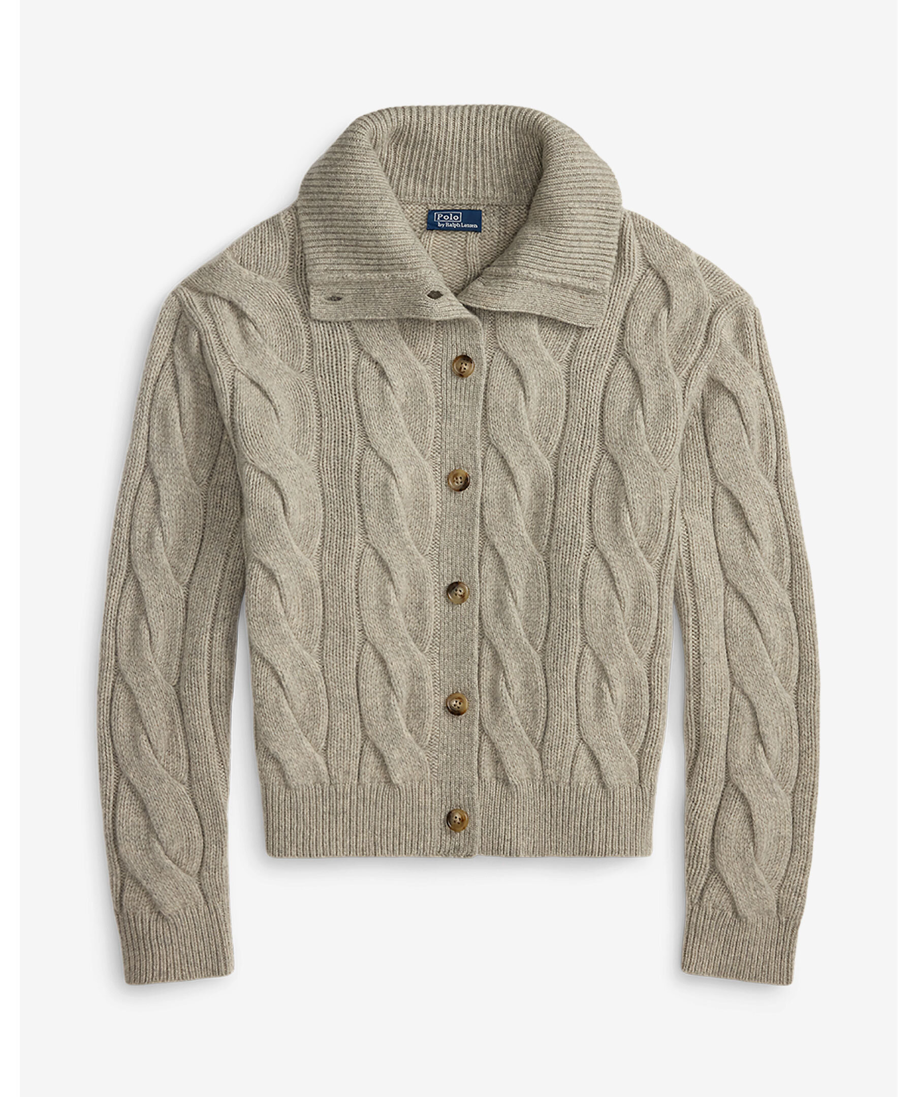 Kabelstickad kofta från Polo Ralph Lauren. Gjord i en mjuk ull och kashmirblandning. Stängs med knappar och har en hög hals.