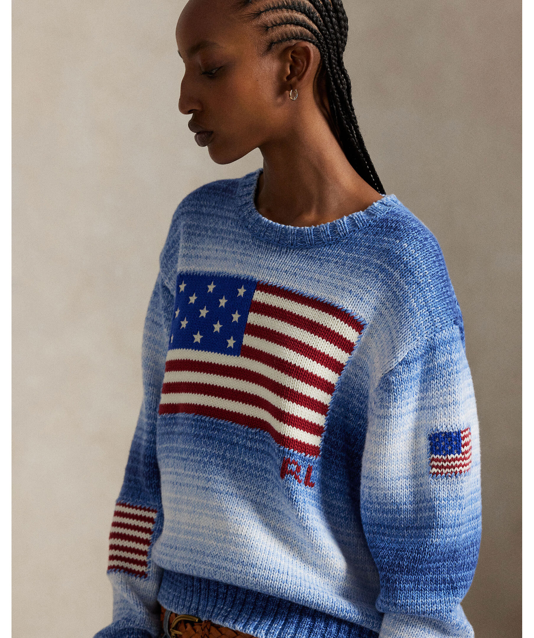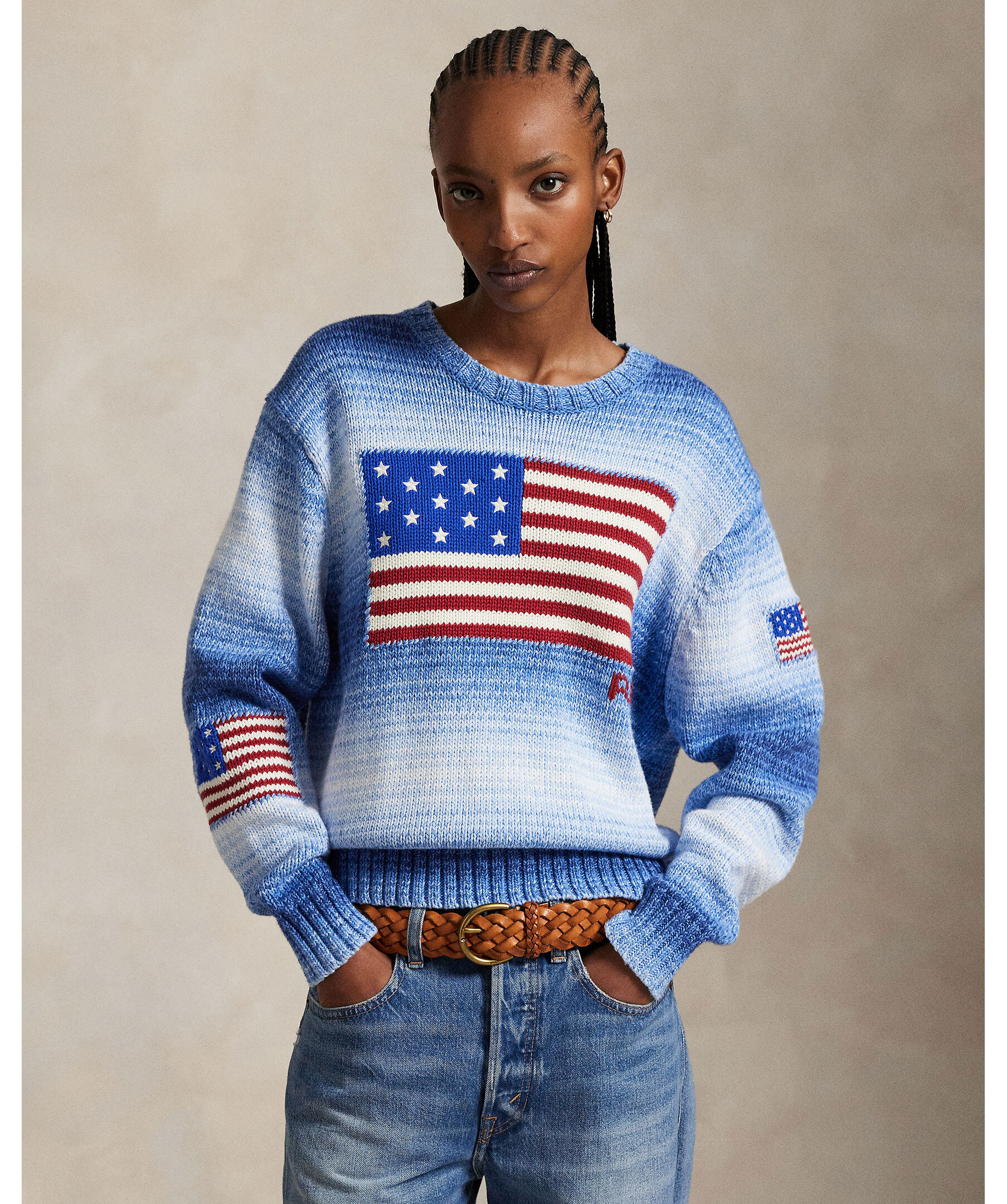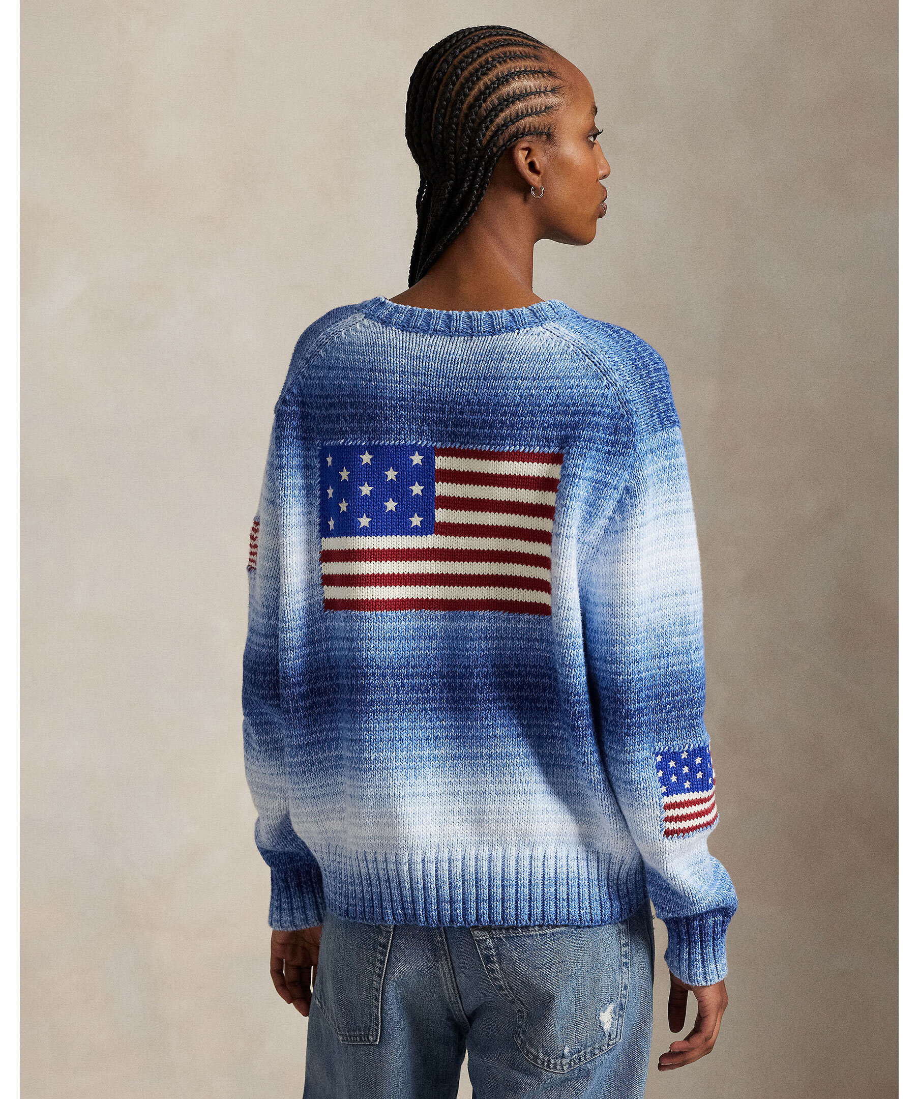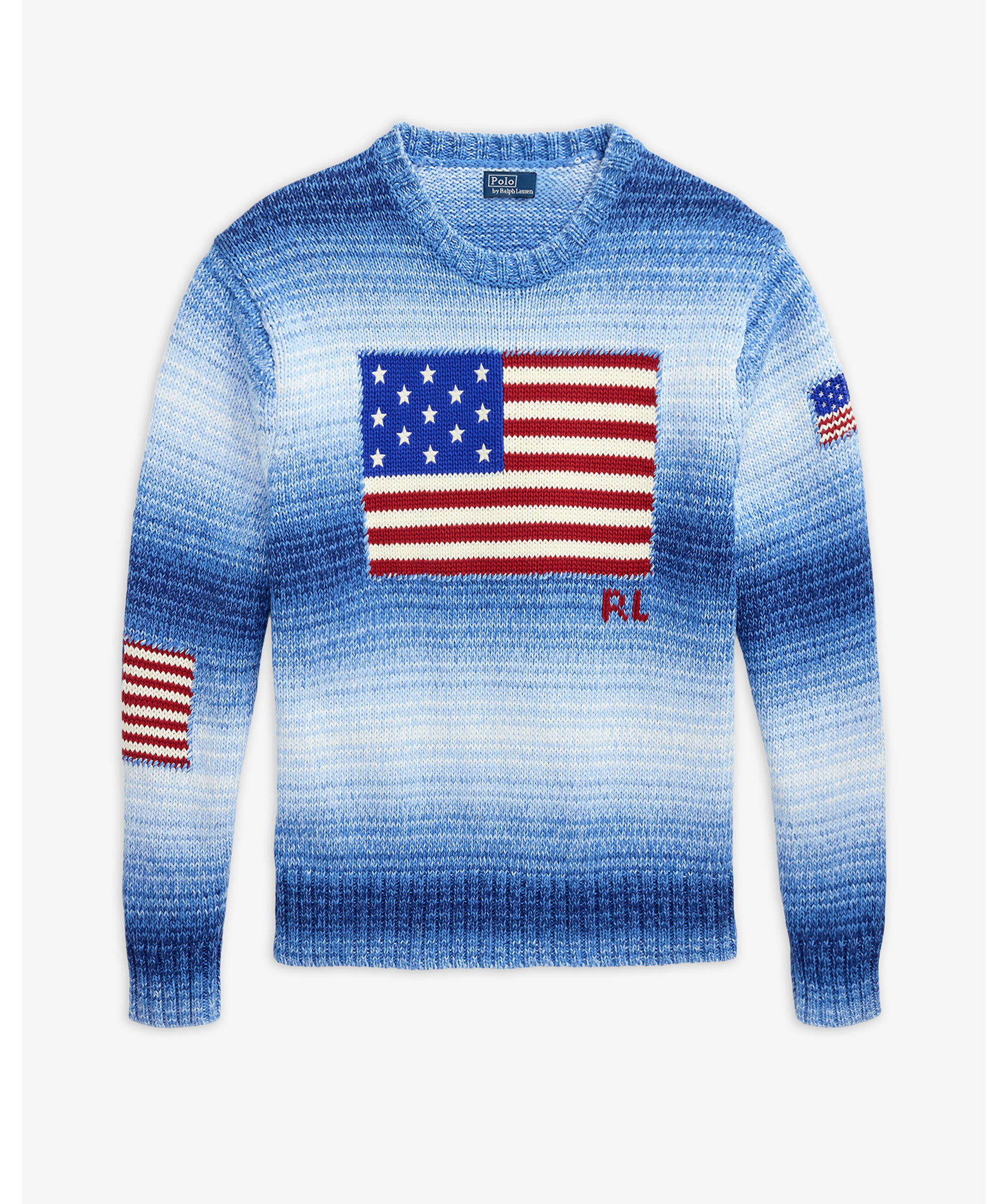 Stickad tröja från Polo Ralph Lauren. Tröjan har olika nyanser av blått som skapar en randig effekt. Amerikansk flagga på bröstet och ärmarna. Ribbstickade muddar och rundad hals.