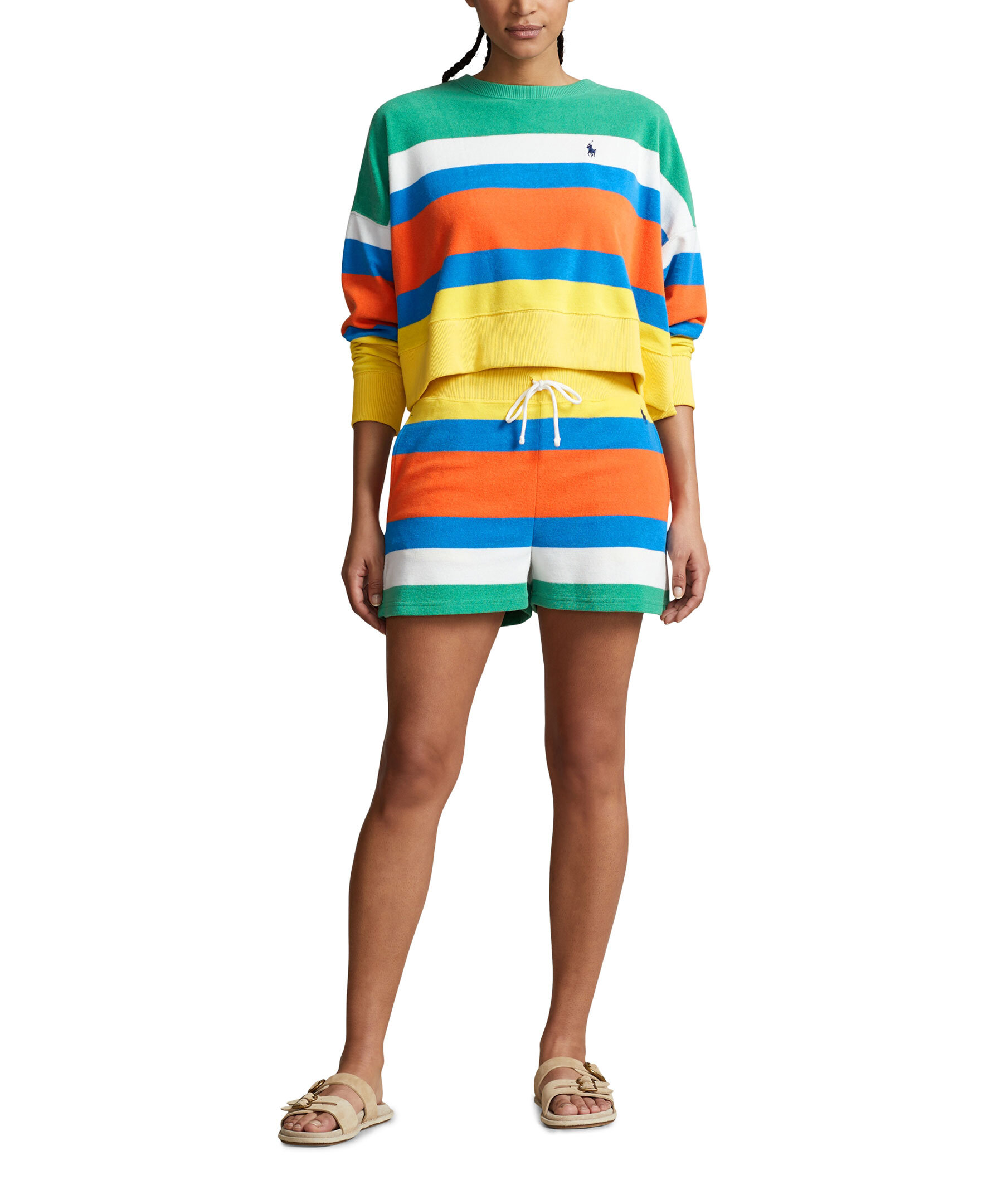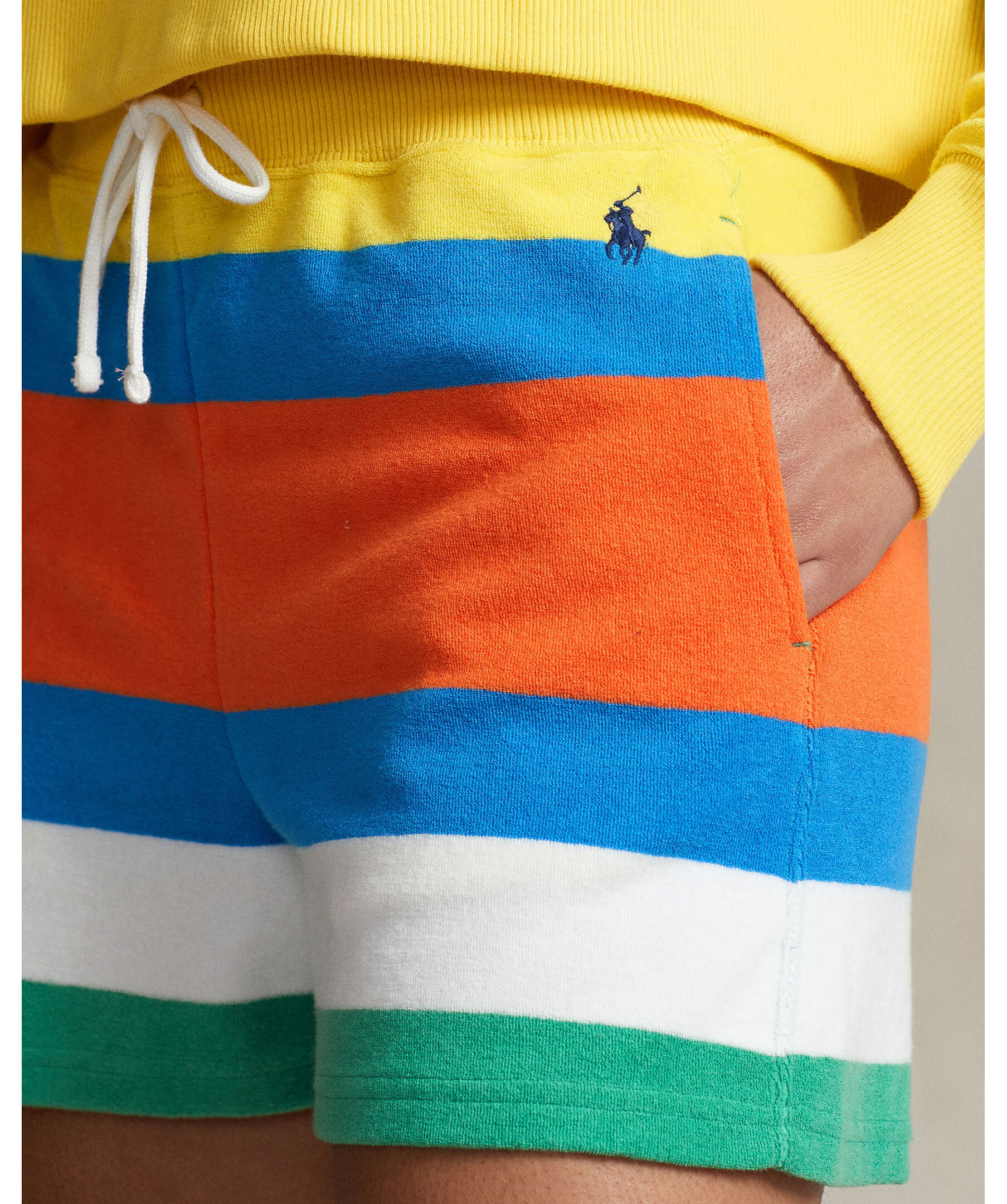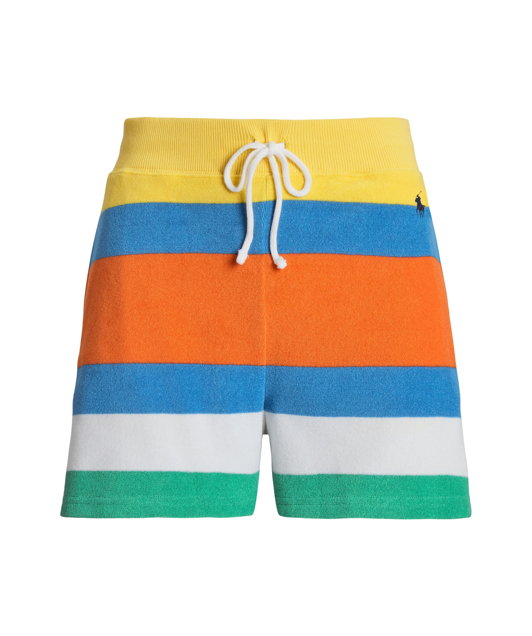Flerfärgade, randiga frottéshorts från Polo Ralph Lauren. Tillverkade i bomullsblandnings och har en broderad signatur ponny vid vänster höft. Avslappnad modell, avsedd att slå i övre låret, har en ribbstickad resår i midjan och sidofickor. Modellen är 178 cm lång och bär en storlek small.
