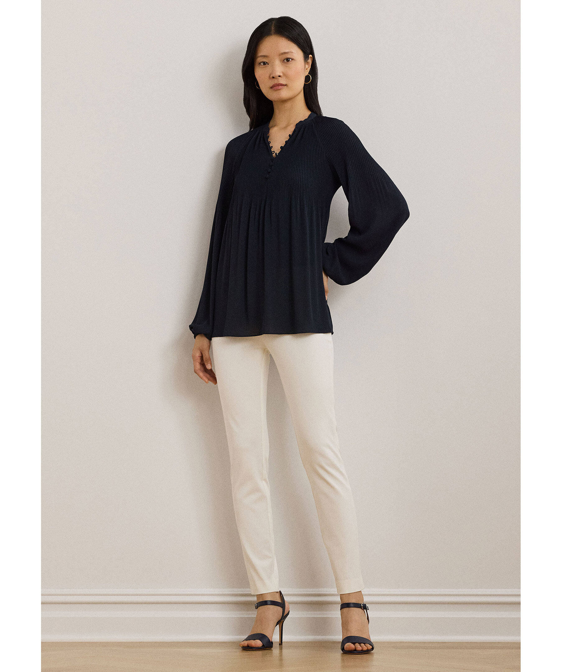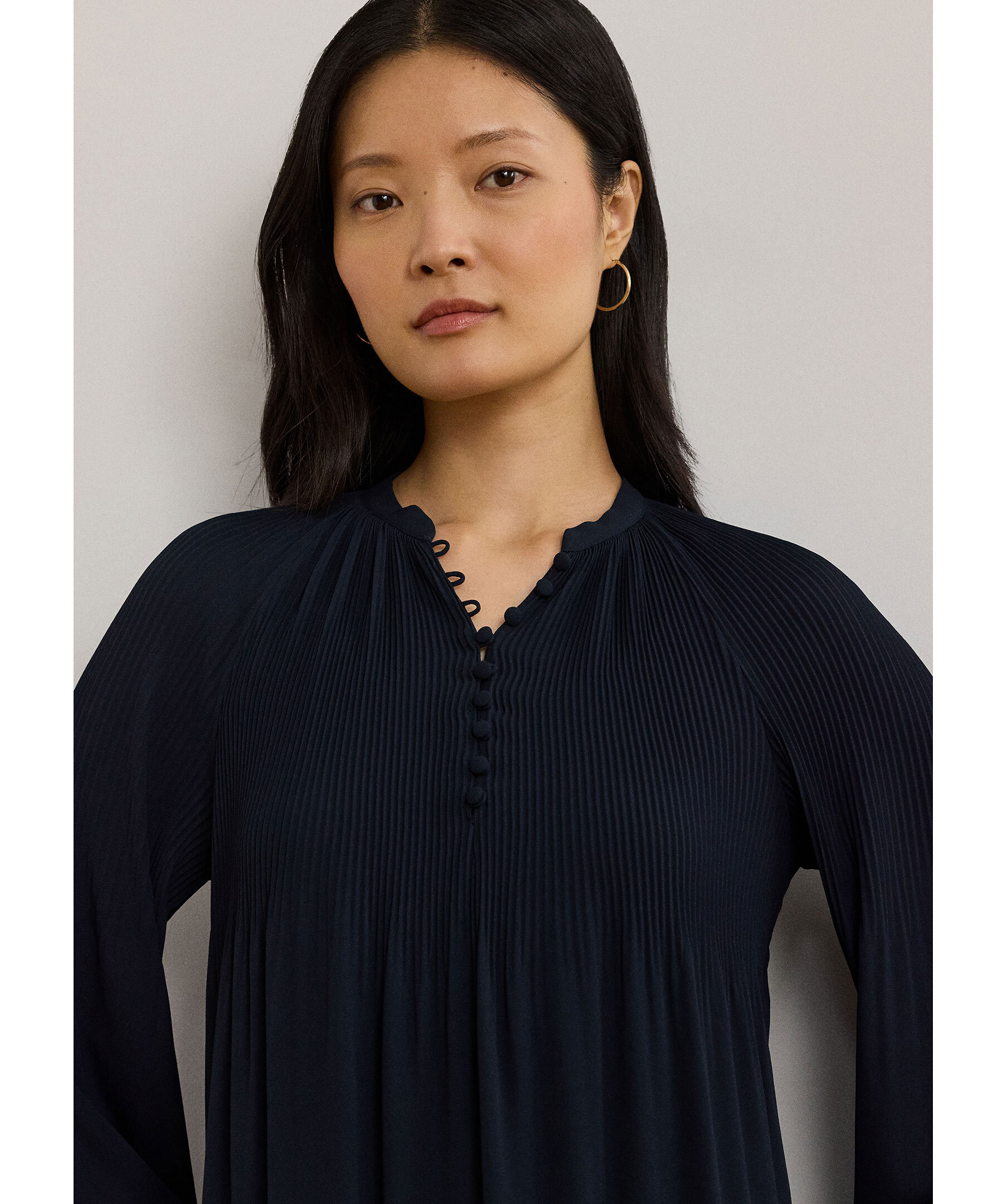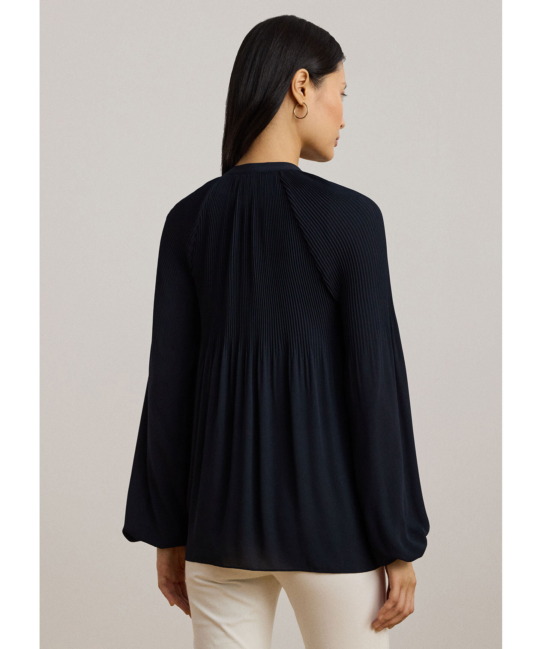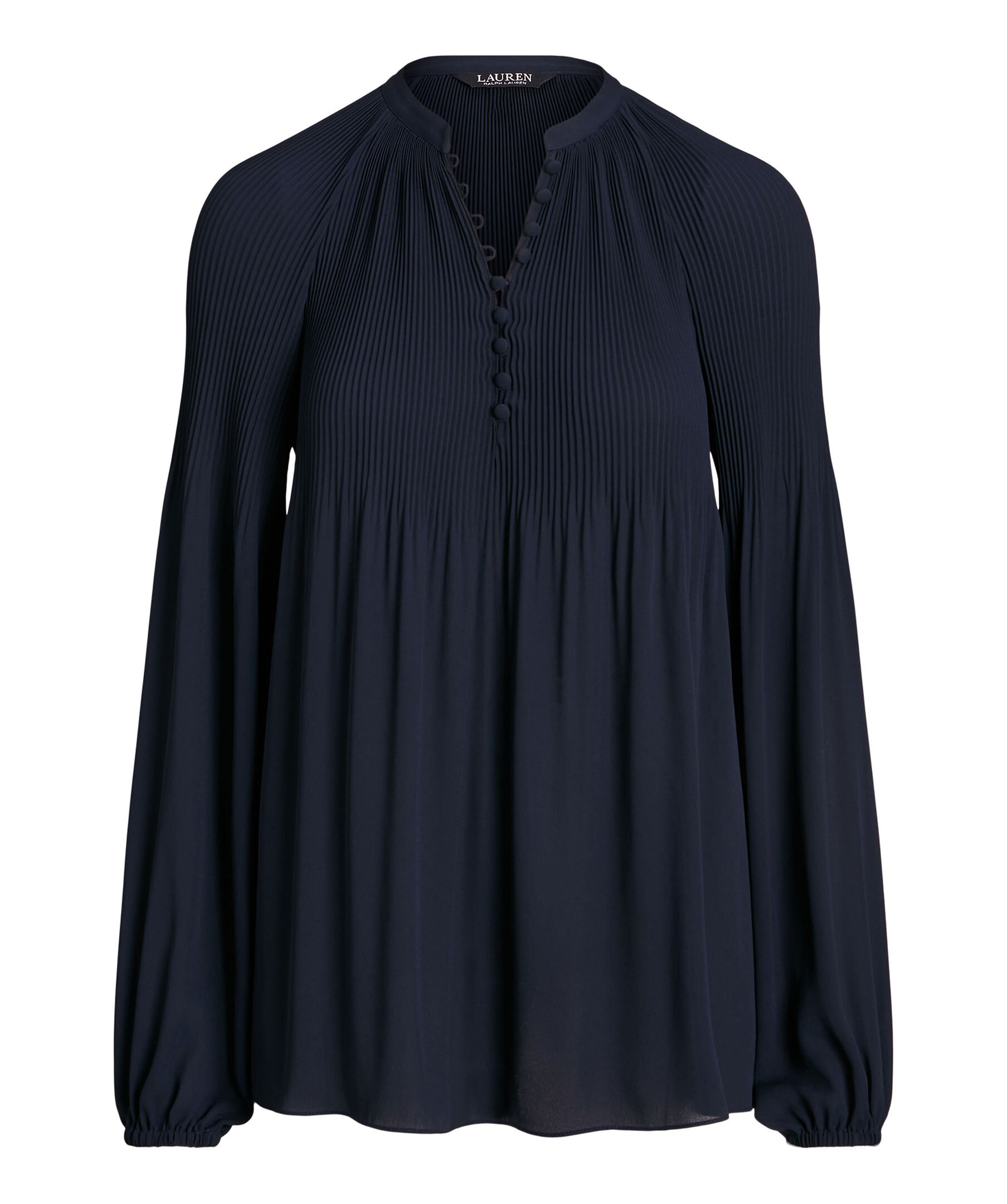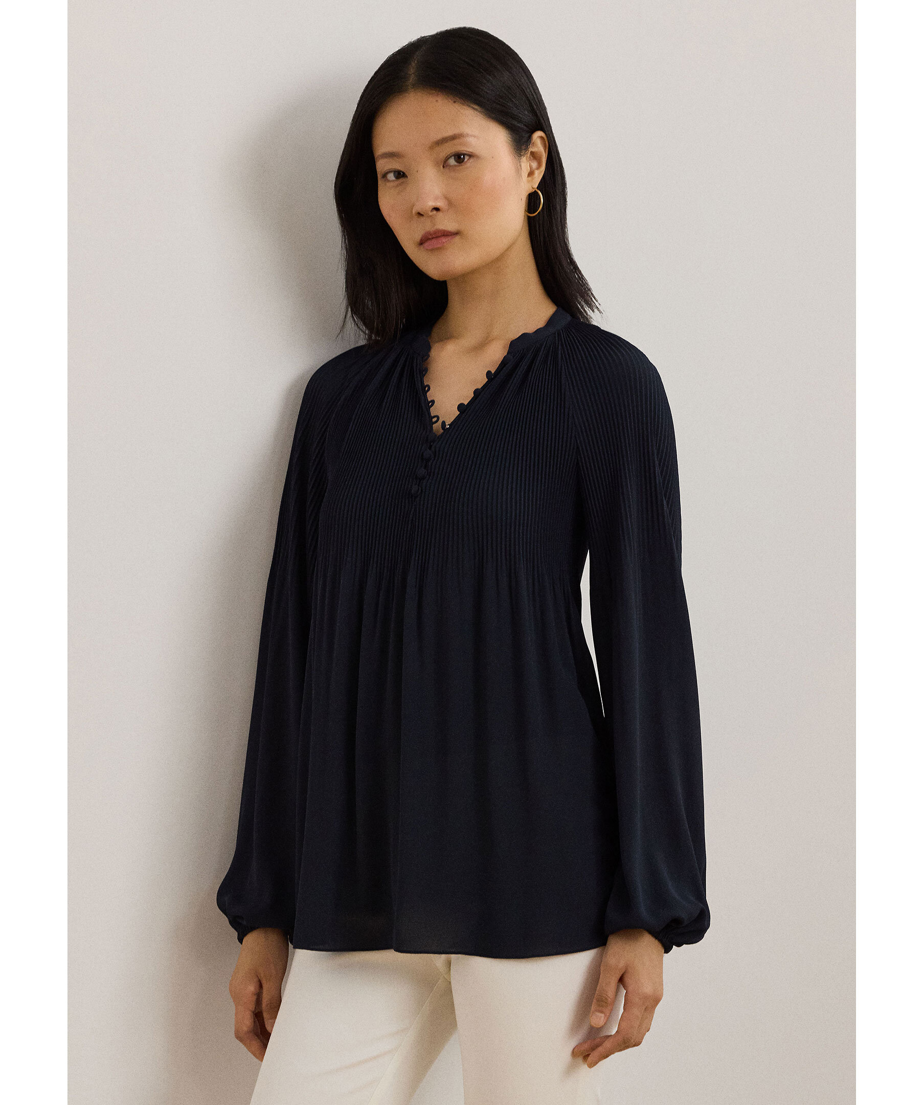 Marinblå blus från Polo Ralph Lauren. Blusen har klädda knappar och veck framtill och långa ballongärmar. Tillverkad i polyester.
