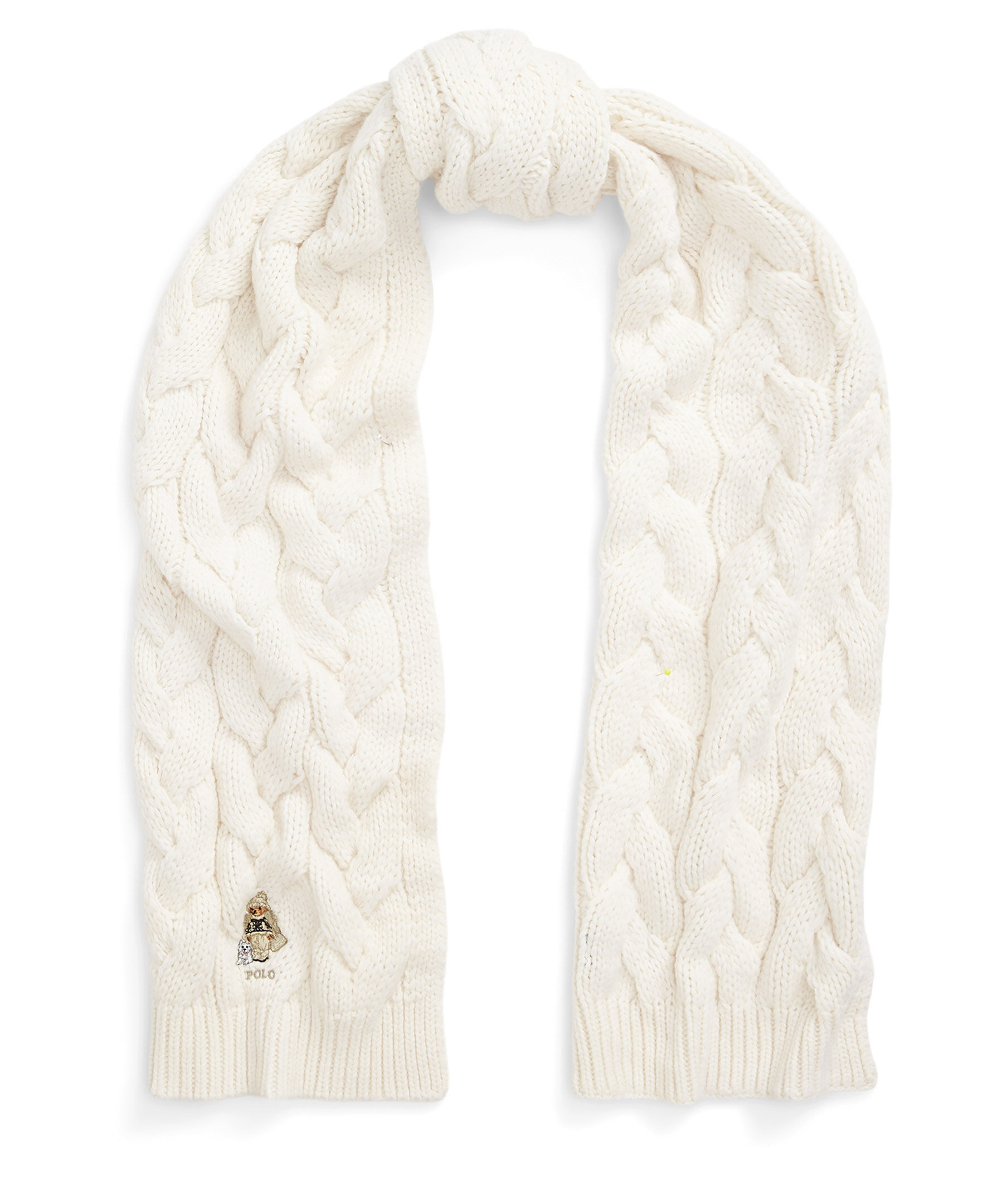 Krämvit, kabelstickad halsduk från Polo Ralph Lauren. Broderad nalle fram och ribbade kanter i ändarna. Tillverkad i ullblandning. Mått: 30 cm x 200 cm.