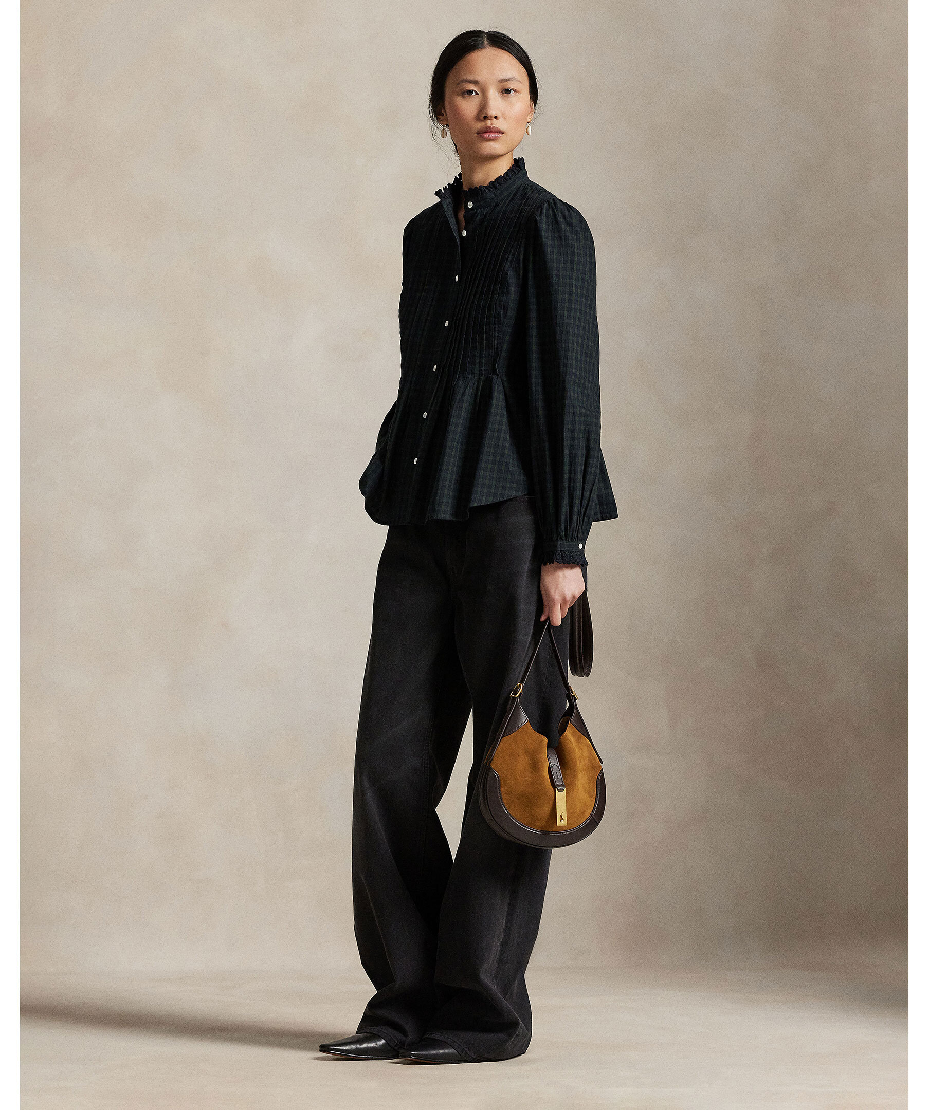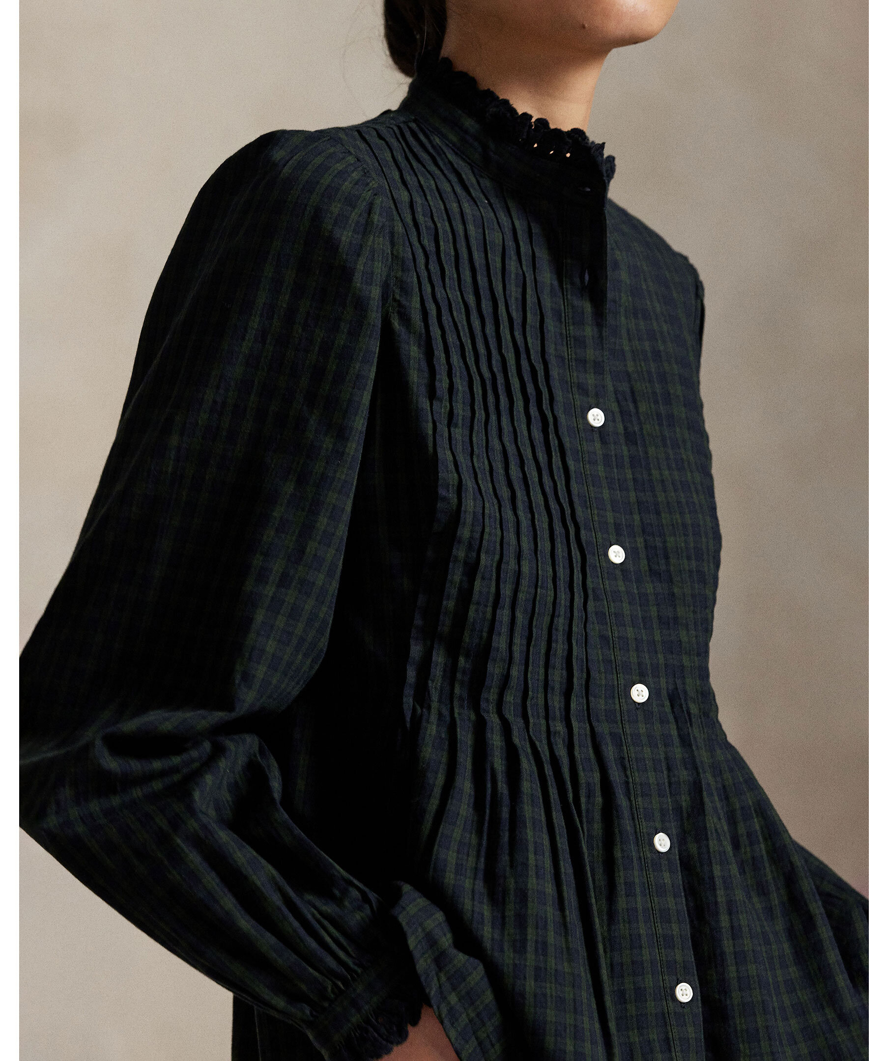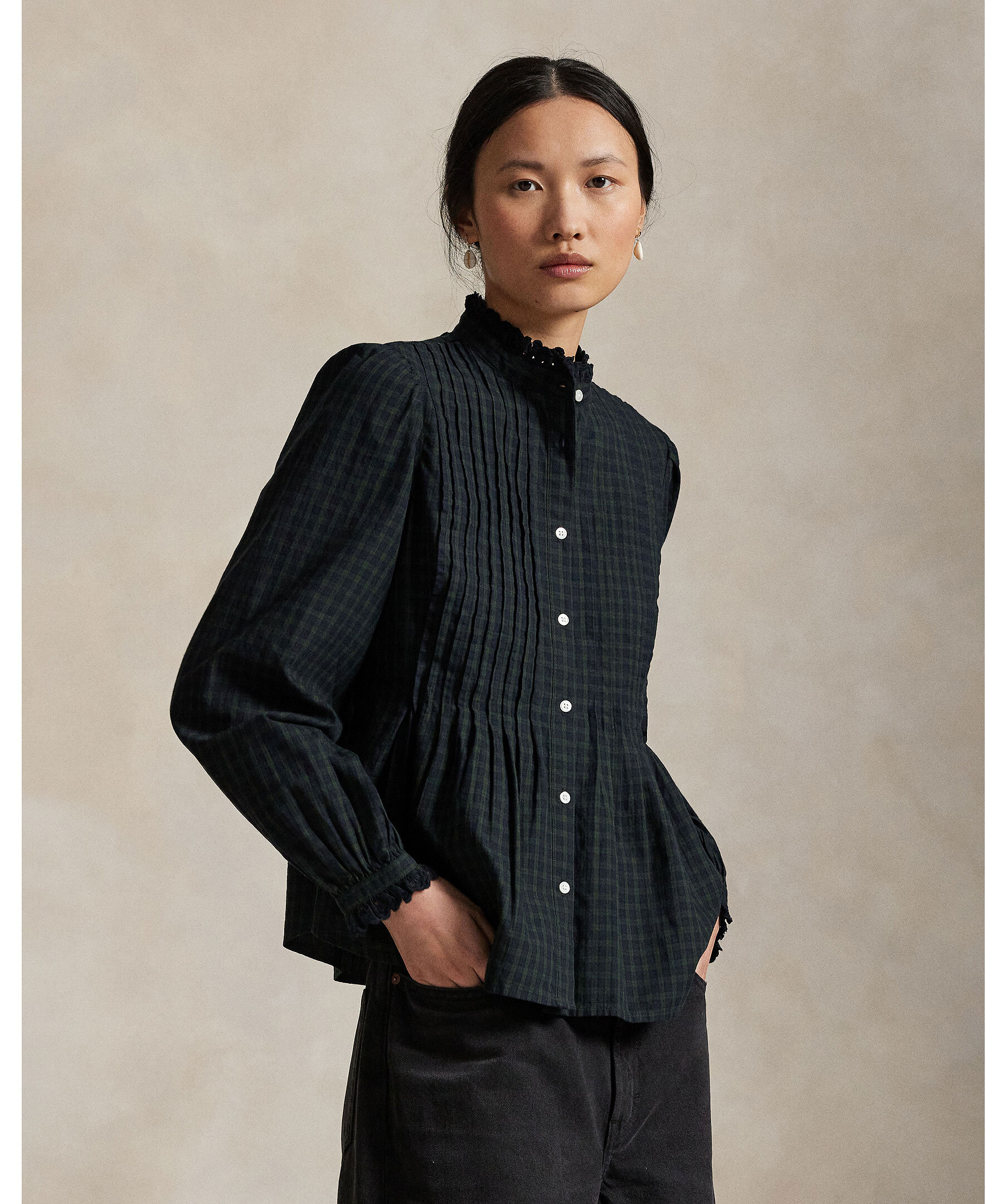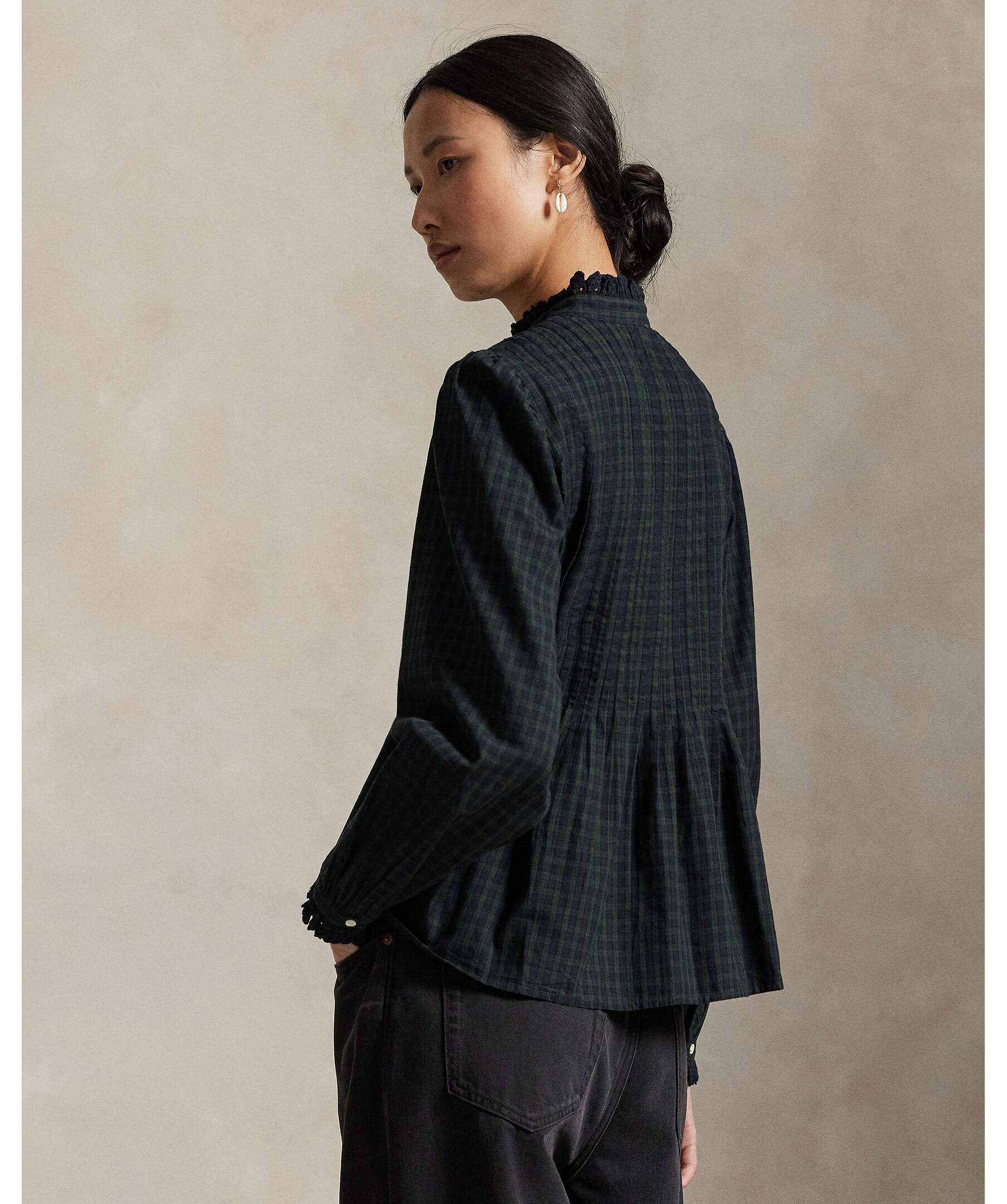 Rutig, långärmad peplum blus från Polo Ralph Lauren. Blusen stängs med knappar och har dekorativa pressveck. Den har en elegant hög krage med eyelet-broderi och matchande broderi på manschetterna.