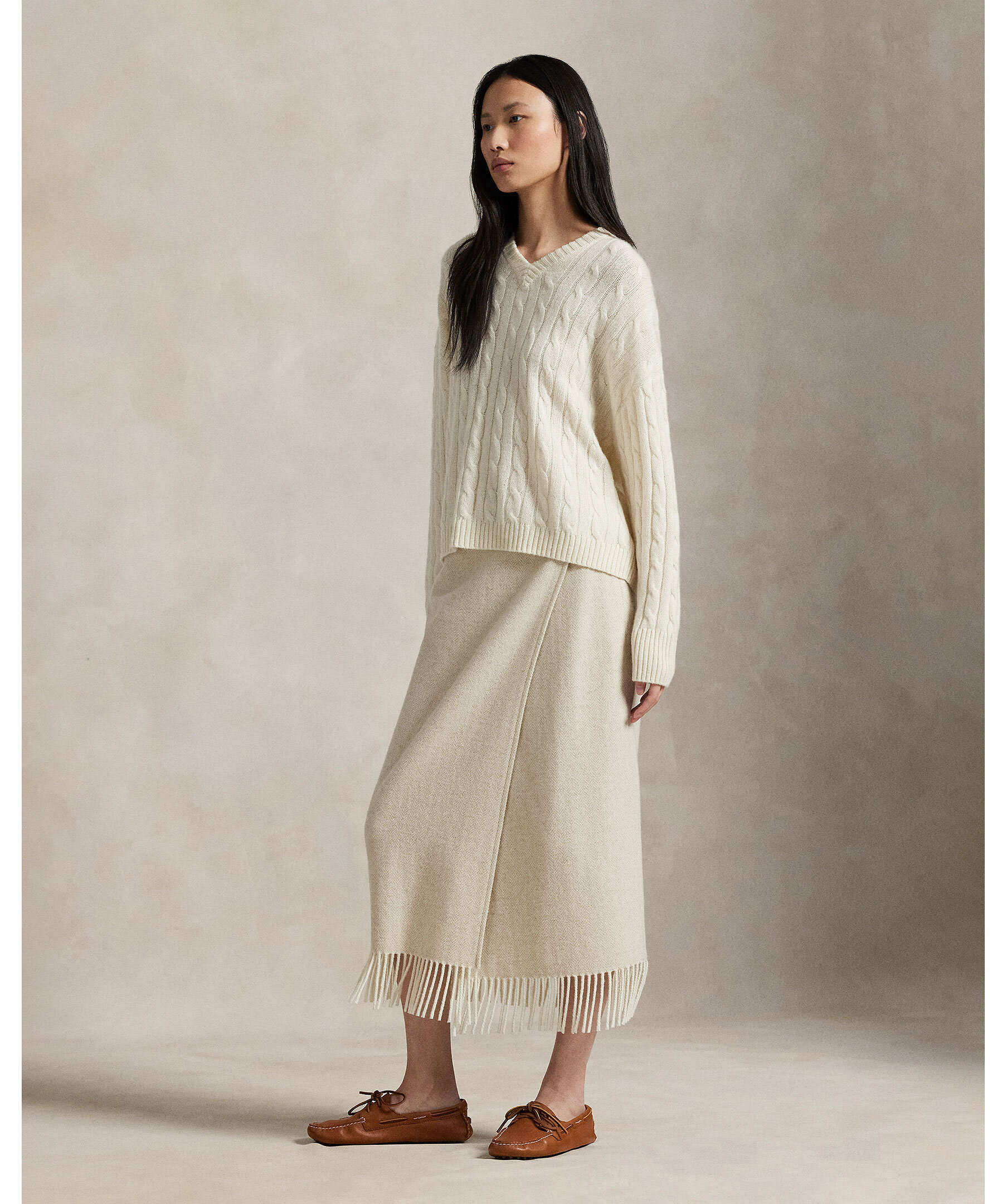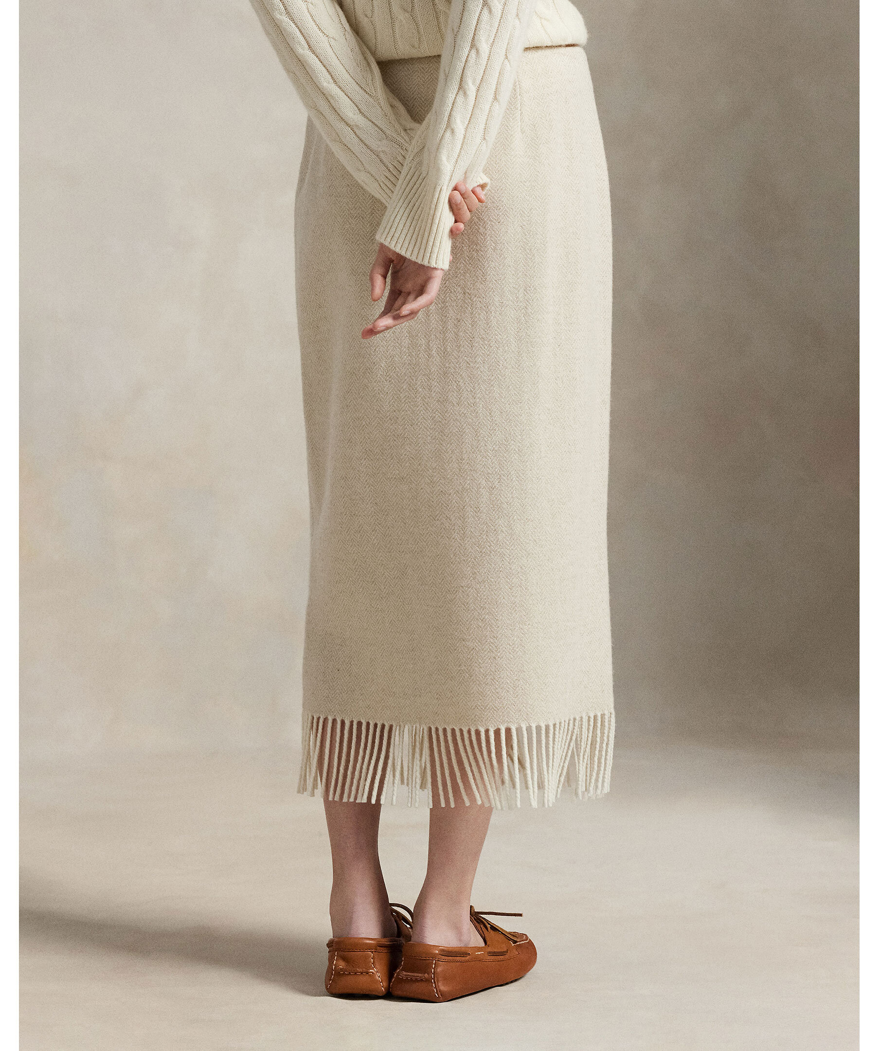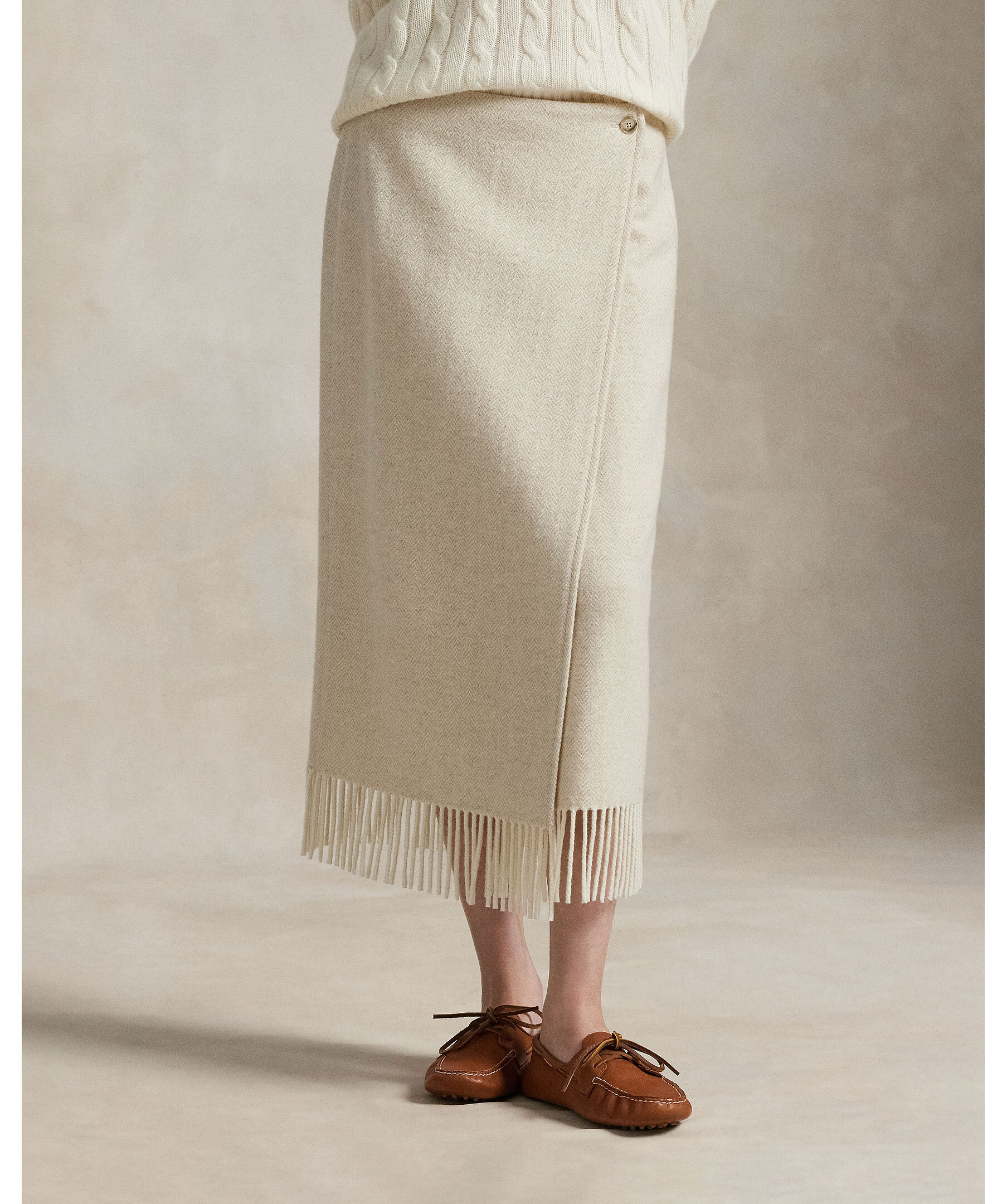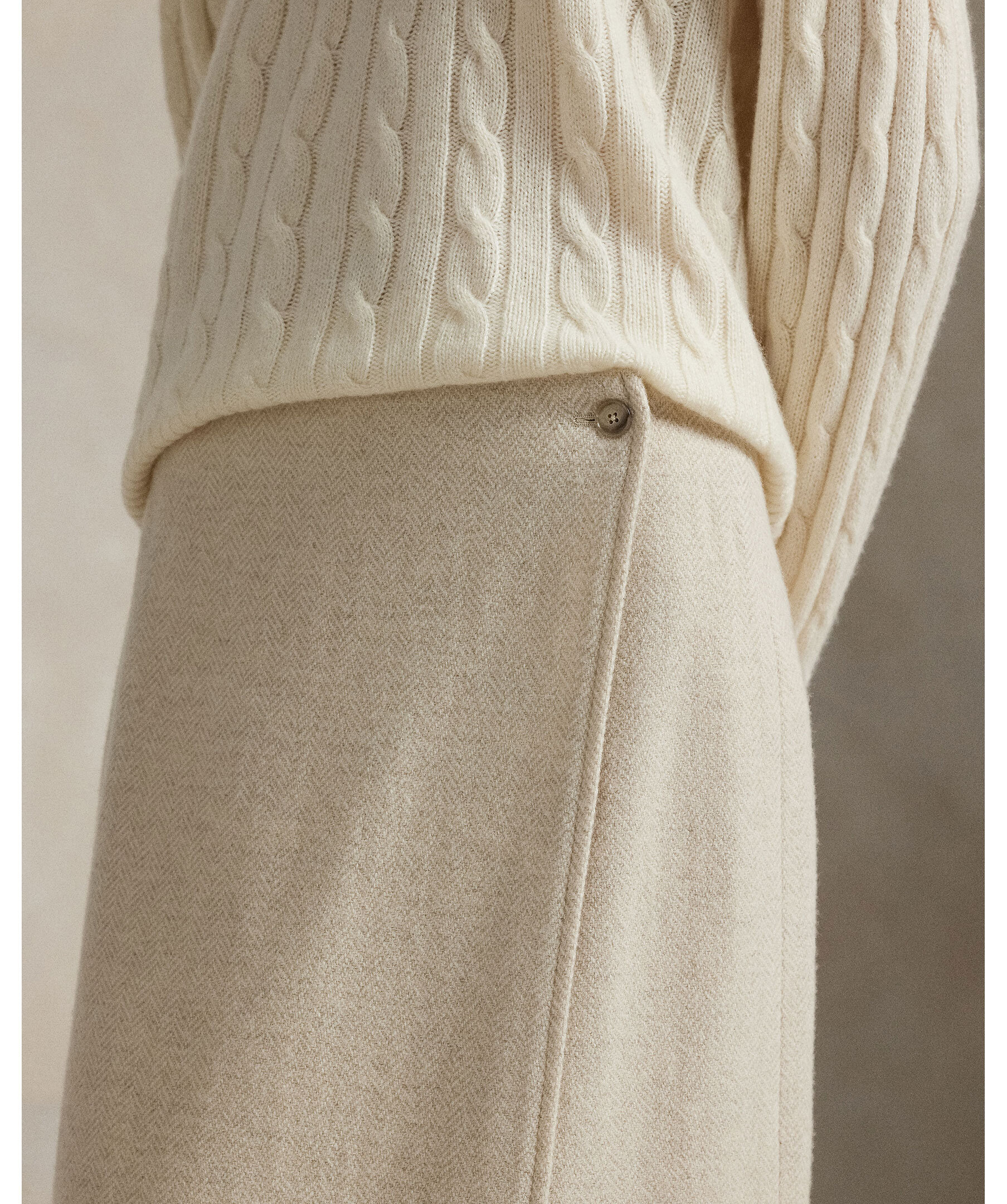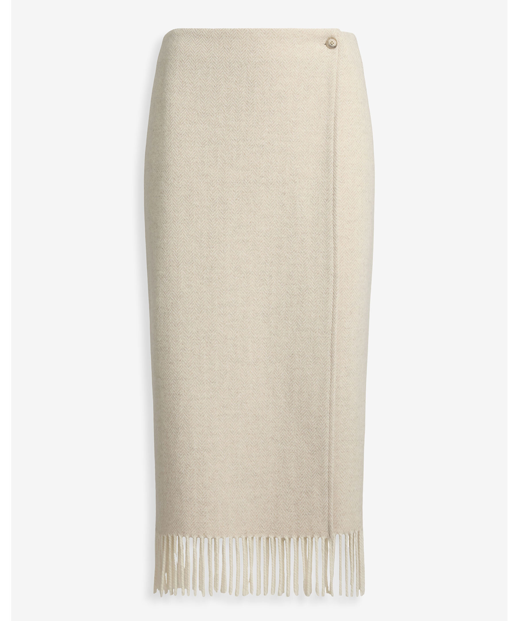 Elegant omlottkjol i beige från Polo Ralph Lauren. Kjolen har ett diskret fiskbensmönster och stängs med knappar. Dekorativa fransar nertill. Gjord i en ullblandning. Modellen är 178 cm lång och har på sig storlek C36.