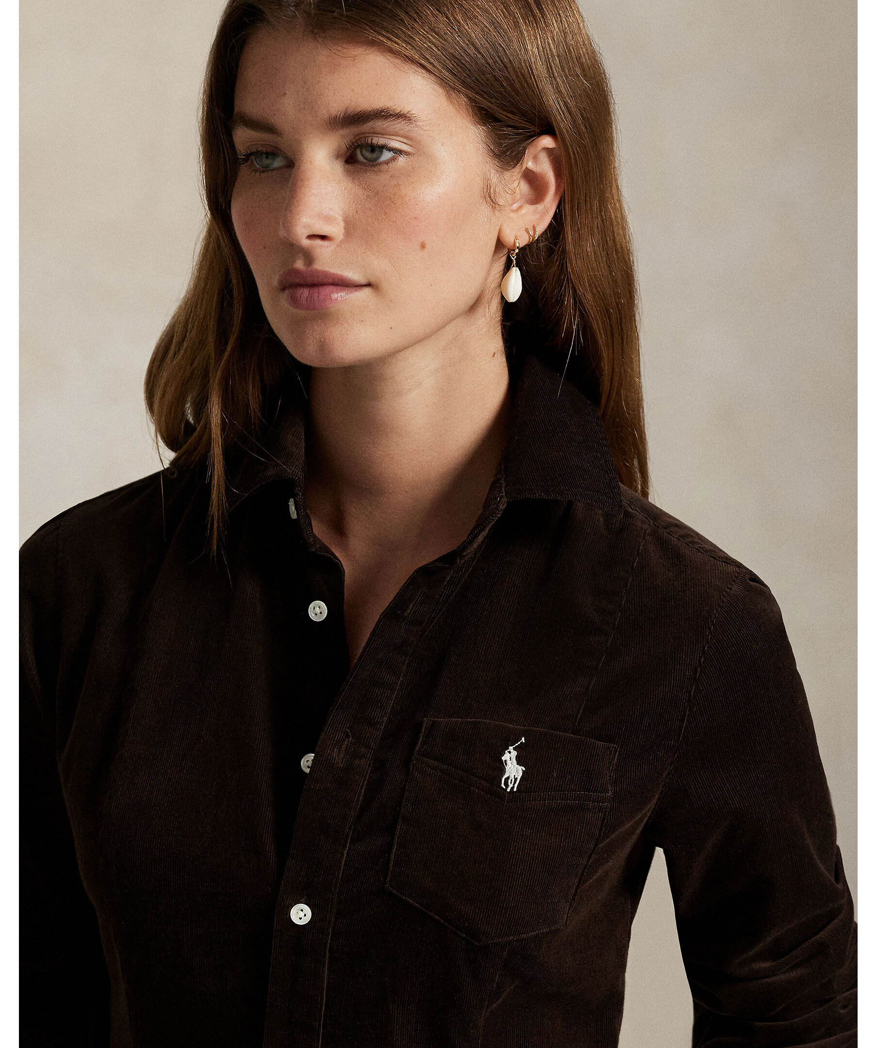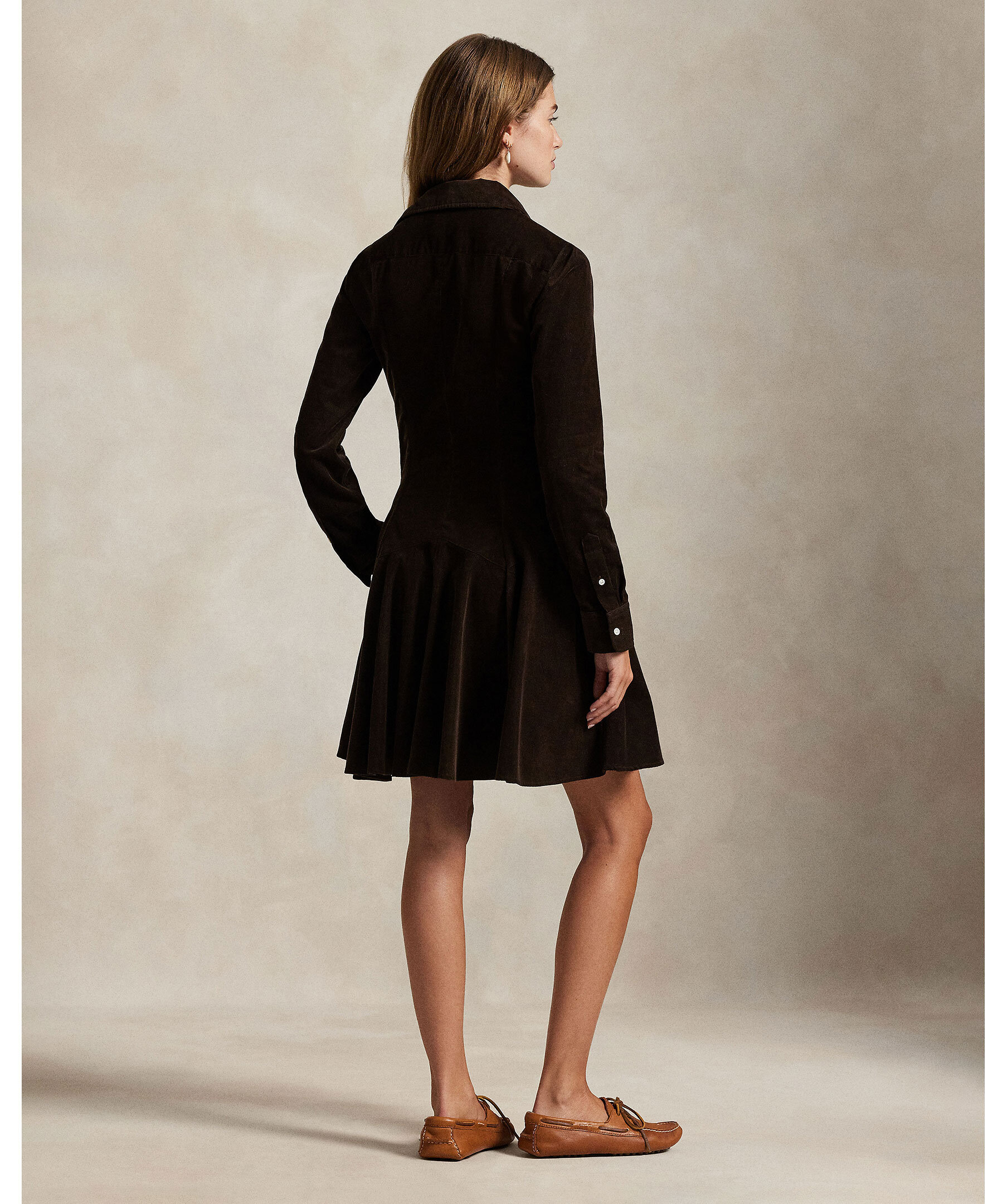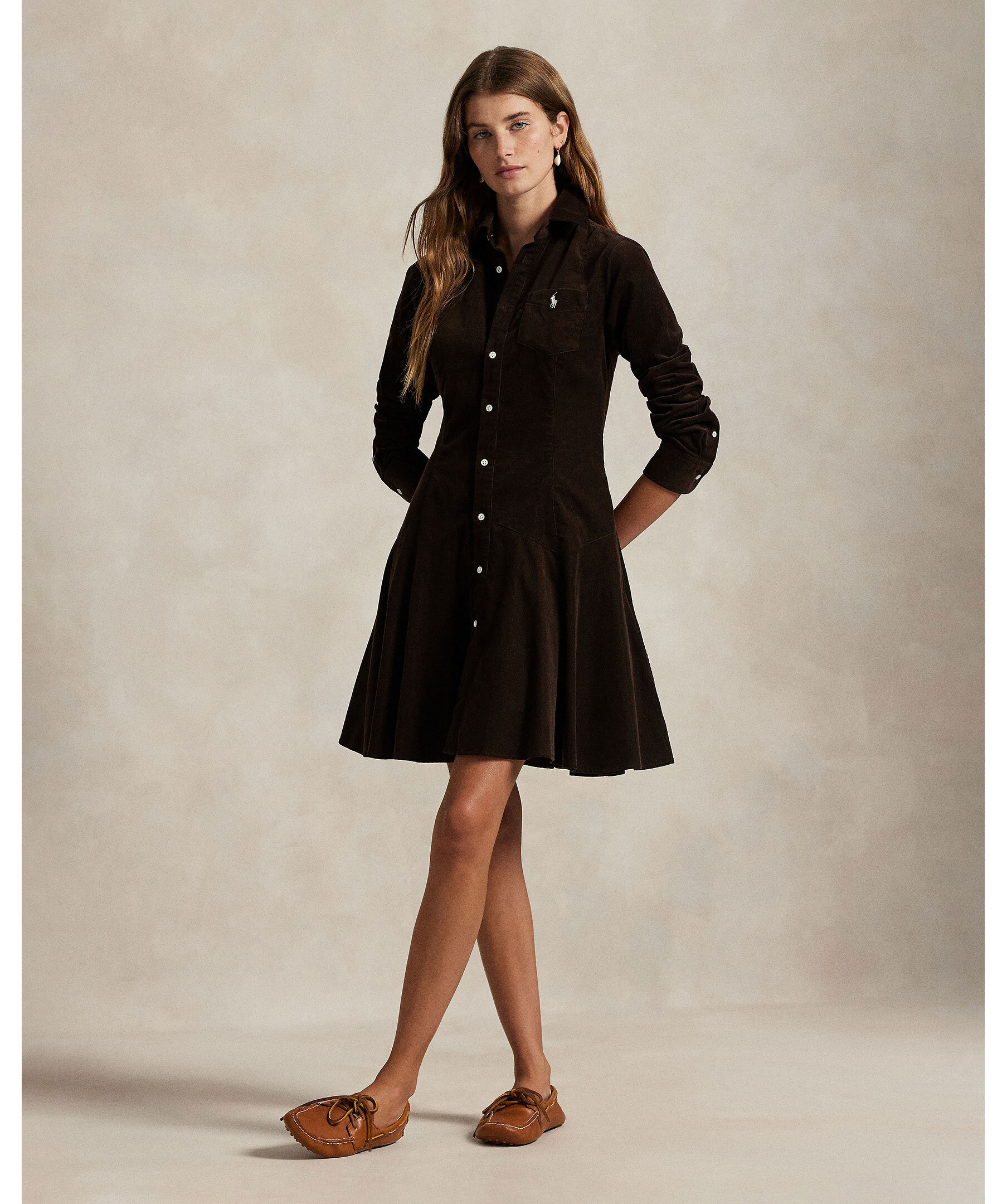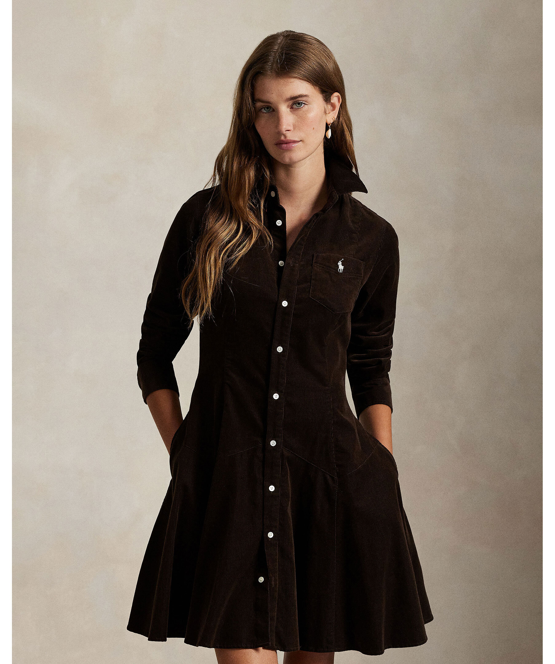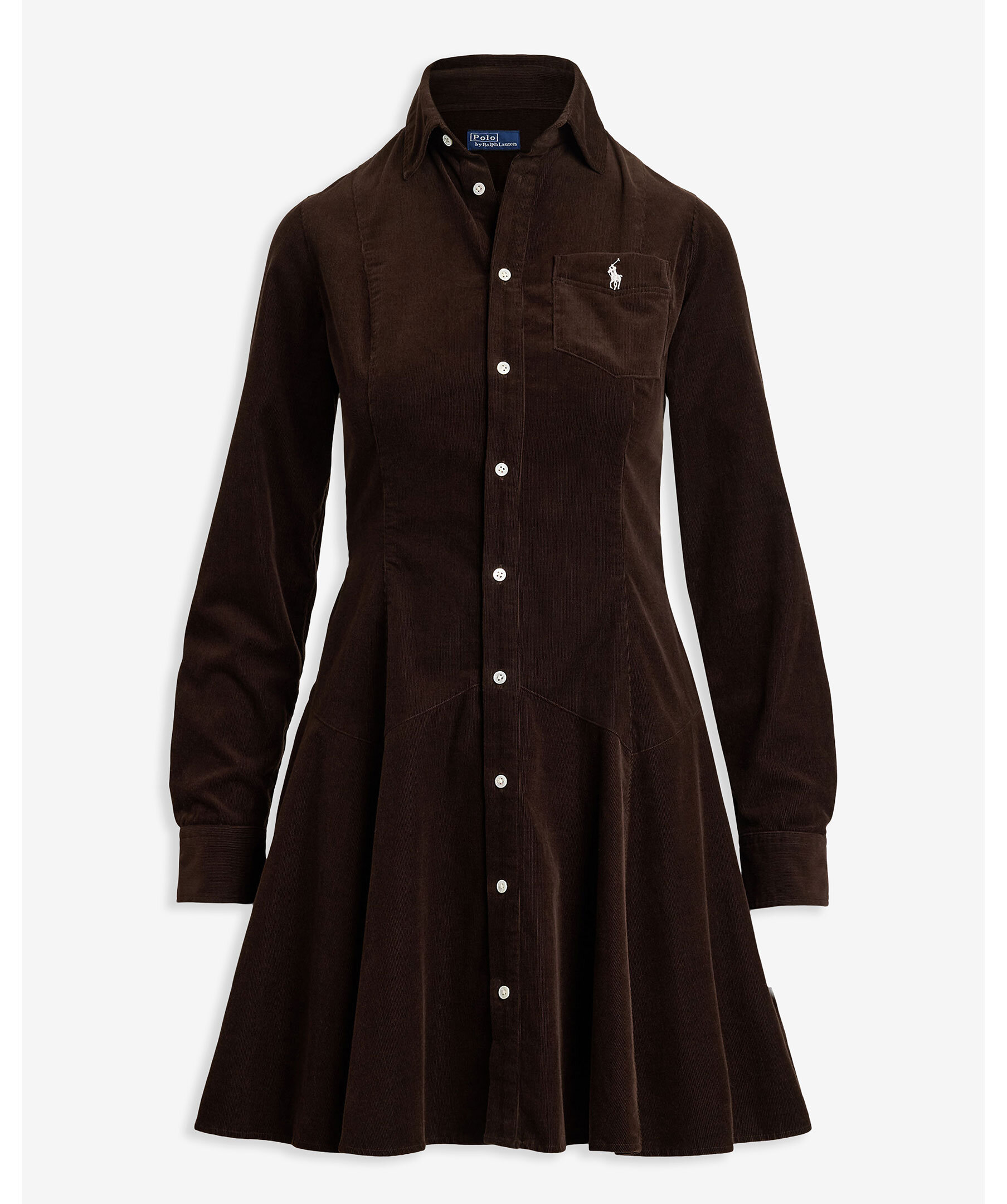 Brun A-linjeformad skjortklänning i manchestertyg från Polo Ralph Lauren. Klänningen har prinsessömmar som ger en smickrande siluett. Designad med knäppning, långa ärmar, fickor och den ikoniska broderade Polohästen på bröstet.