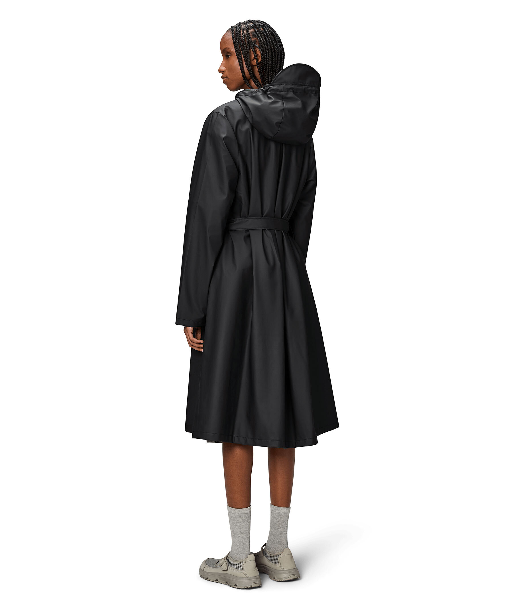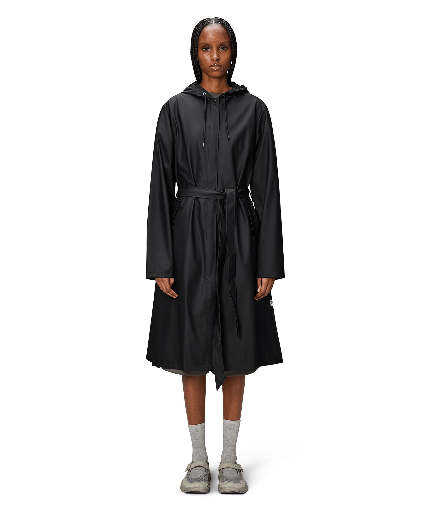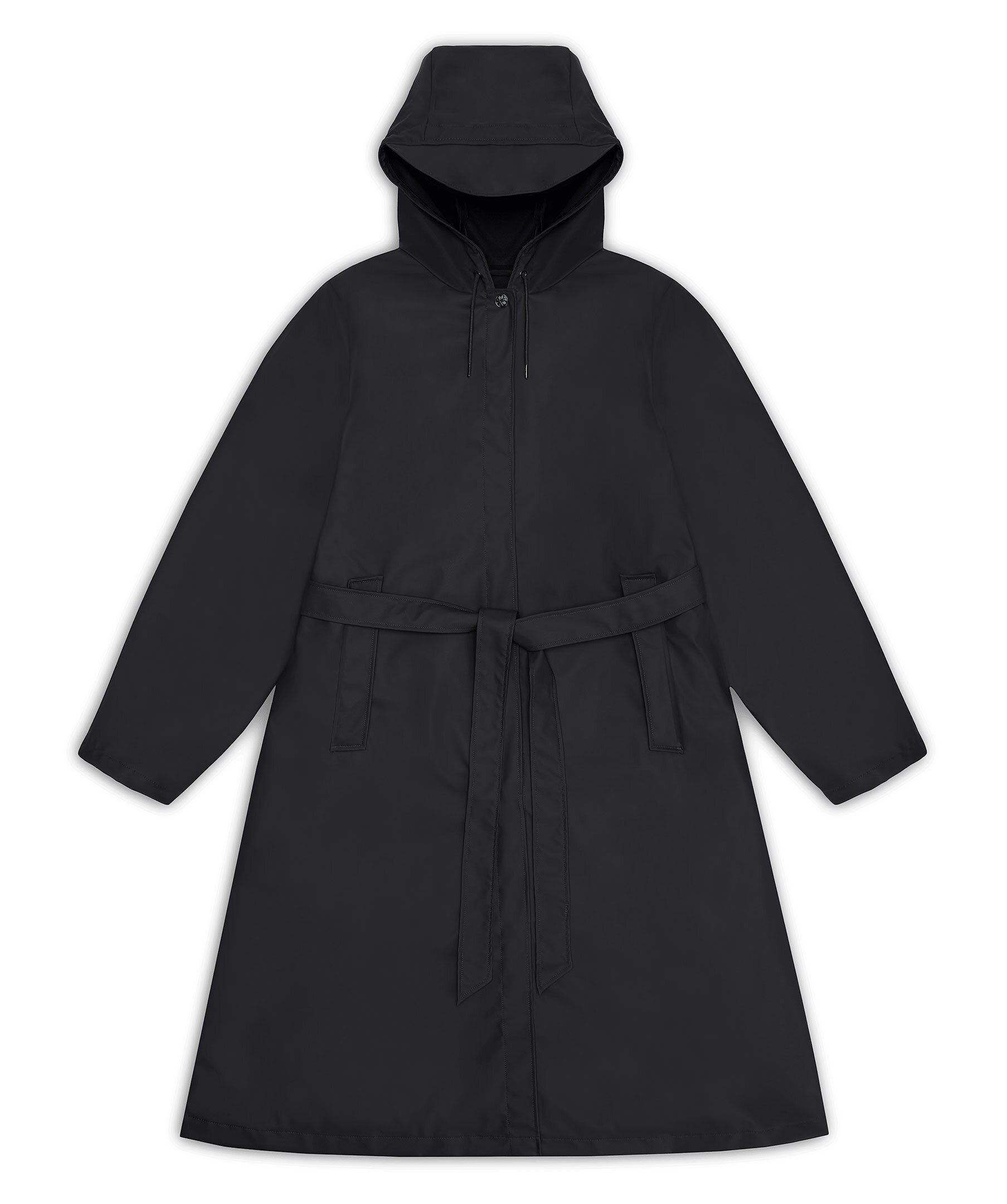 Svart regnjacka från Rains. A-Line Longer W Jacket kännetecknas av sin A-formade siluett och bälte som elegant framhäver midjan. Jackan har huva med dragsko med inbyggd keps, sidfickor, dolda tryckknappar för stängning och justerbara ärmslut. Tillverkad i Rains signaturtyg av PU.