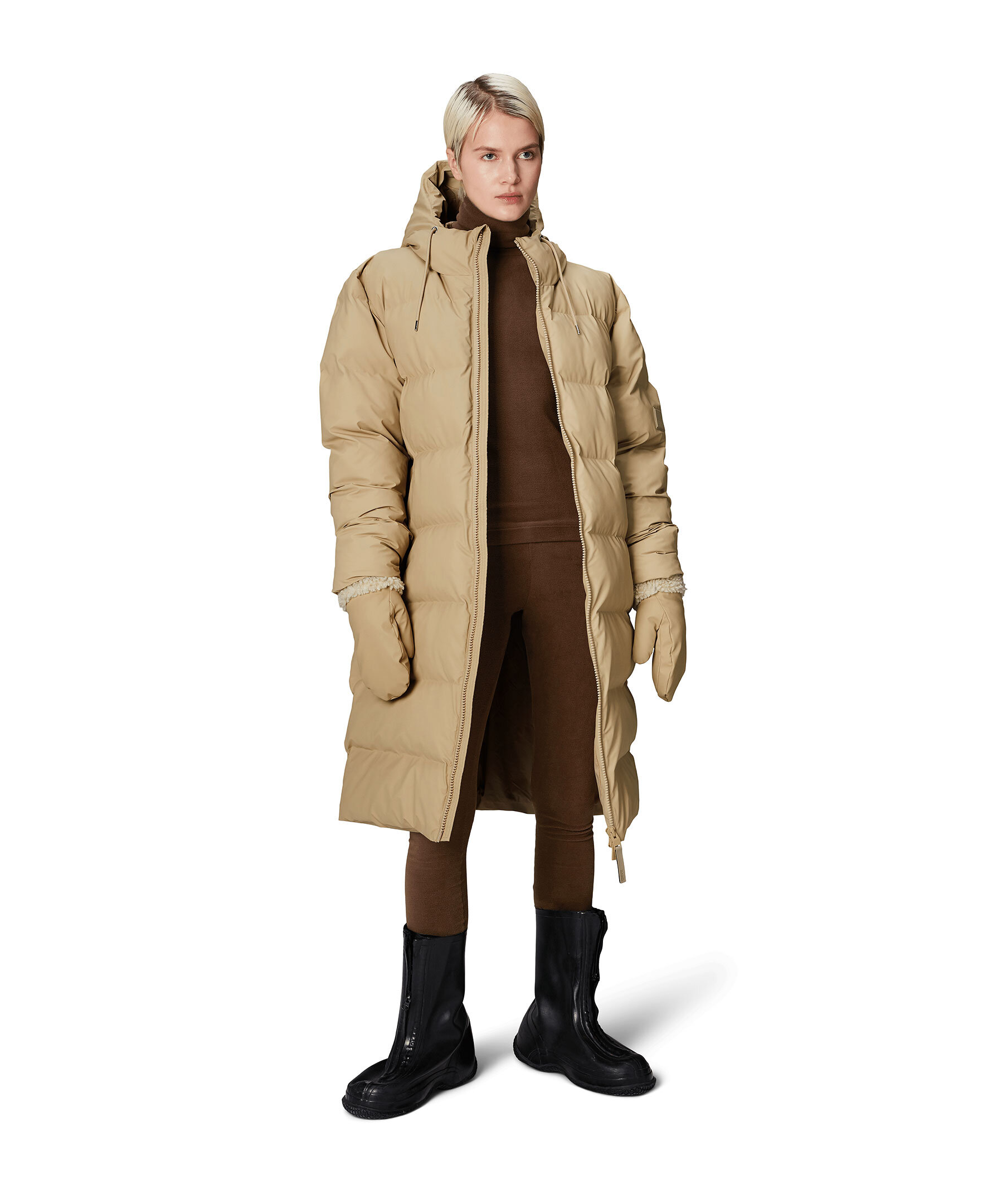Sandfärgad längre pufferjacka från Rains. Jackan stängs med tvåvägs dragkedja framtill och har dragsko i huvan, två fleecefodrade sidfickor, en invändig bröstficka med dragkedja samt är designad i Rains signaturtyg av PU.