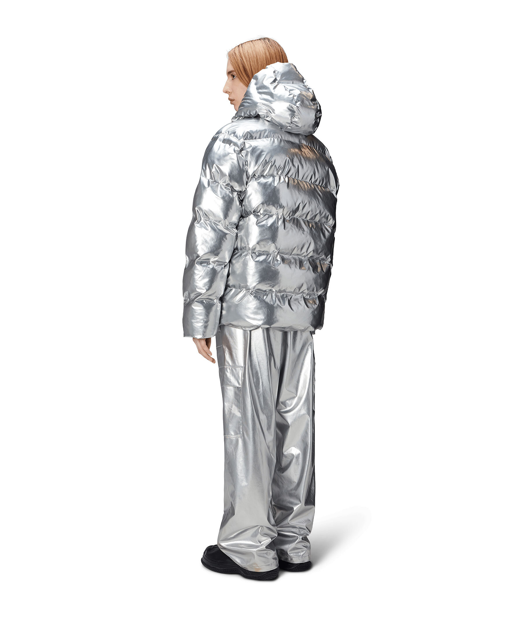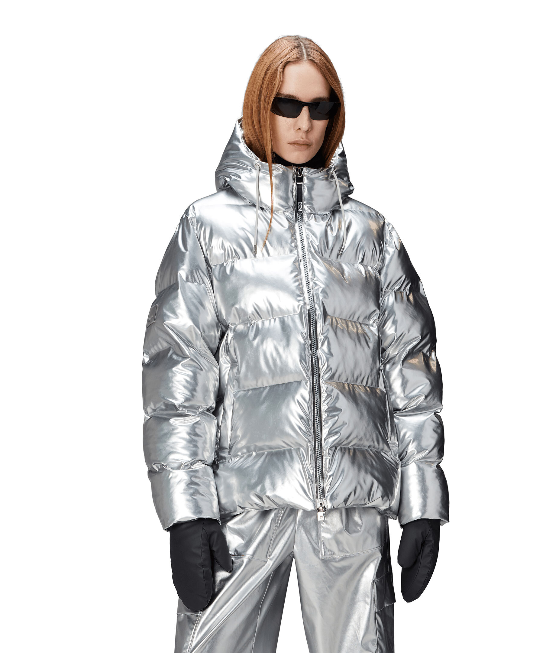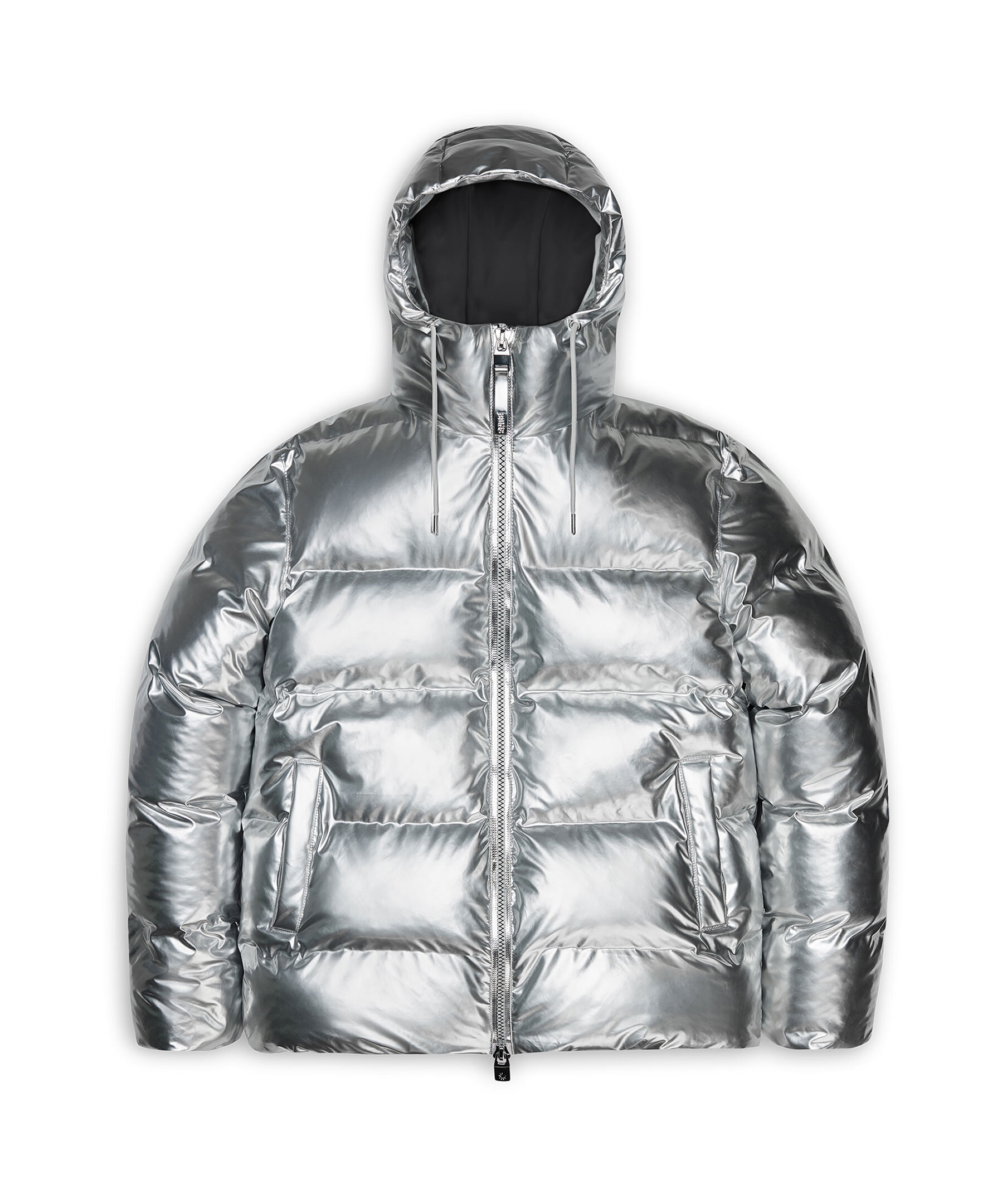 Silverfärgad pufferjacka från Rains. Jackan har en invändig bröstficka med dragkedja och dolda sidofickor med fleecefoder. Jackan har en huva med dragsko, dubbla svetsade sömmar, stängs med dragkedja och har dragsko i midjan. Jackan är tillverkad i Rains signaturtyg av PU.