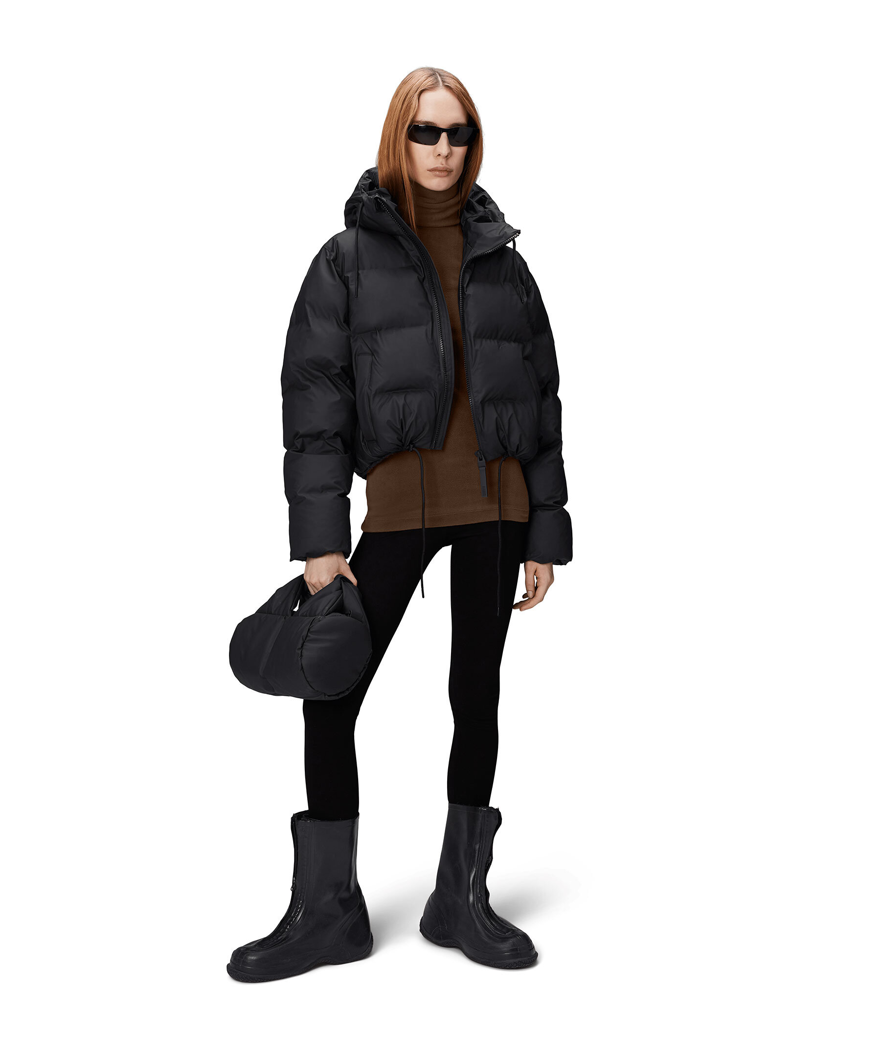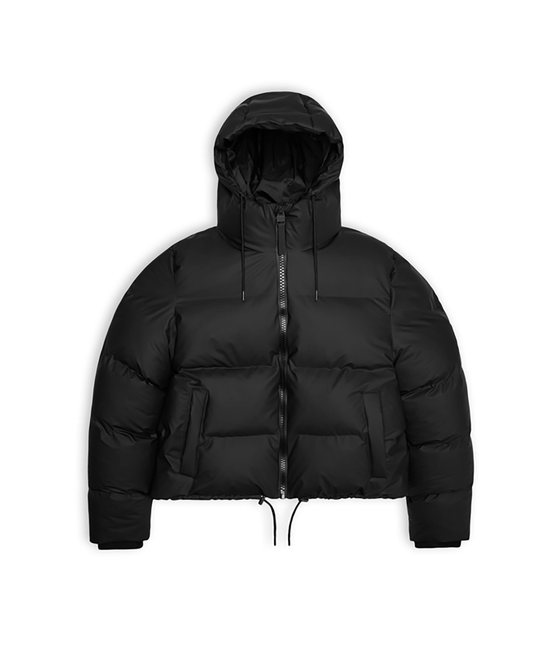 Svart puffer jacka från Rains. Jackan har en invändig bröstficka med dragkedja och dolda sidofickor med fleecefoder. Jackan har en huva med dragsko, dubbla svetsade sömmar, stängs med dragkedja och har dragsko i midjan. Jackan är tillverkad i Rains signaturtyg av PU.