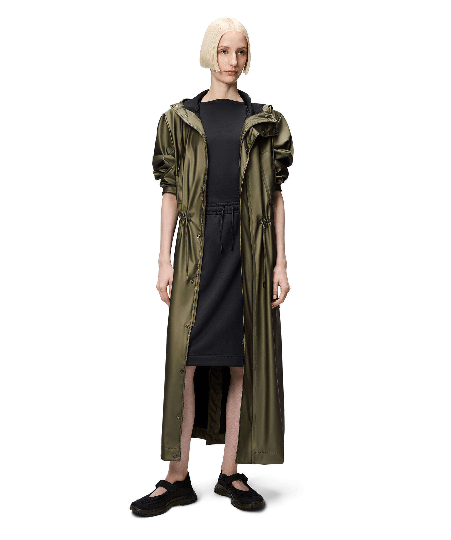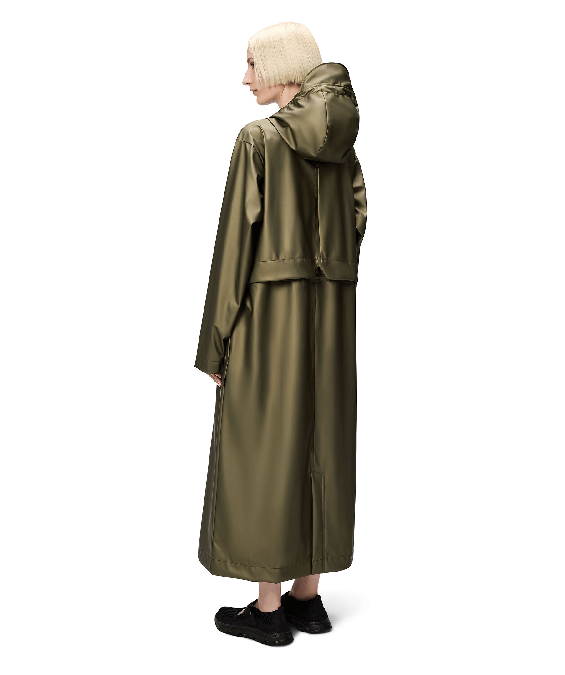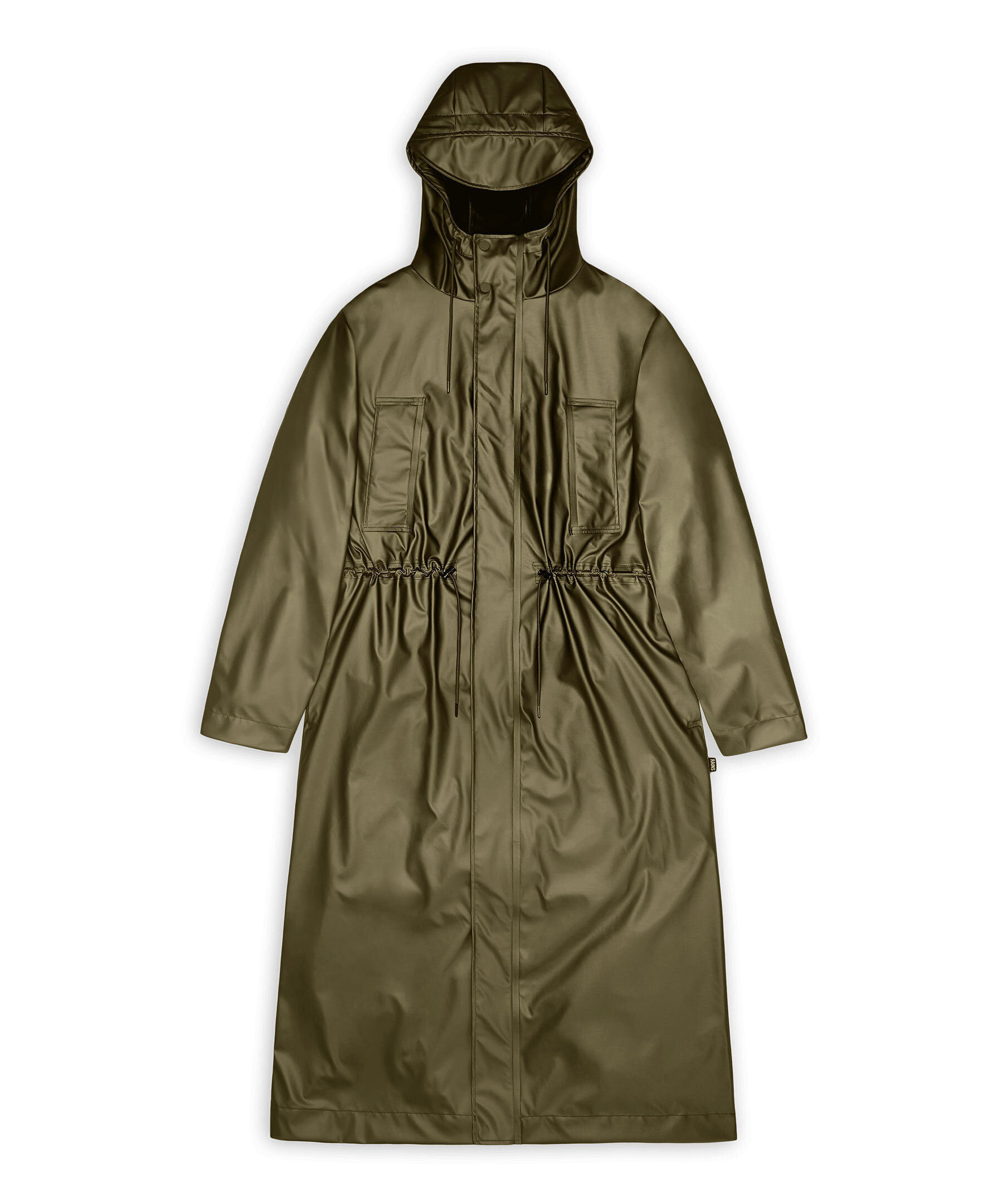 Mörkgrön, glansig regnjacka med en längre och mer överdriven passform från Rains. Jackan stängs med dold dragkedja och tryckknappar och har en huva med knytsnören, dragkedja under en bred stormklaff. Ryggen har ett överdrivet ok med meshfoder undertill för ventilerande komfort. Kompletteras med snörjustering i midjan och två breda passpoalfickor för säker och torr transport av dina värdesaker. Tillverkad i polyester.