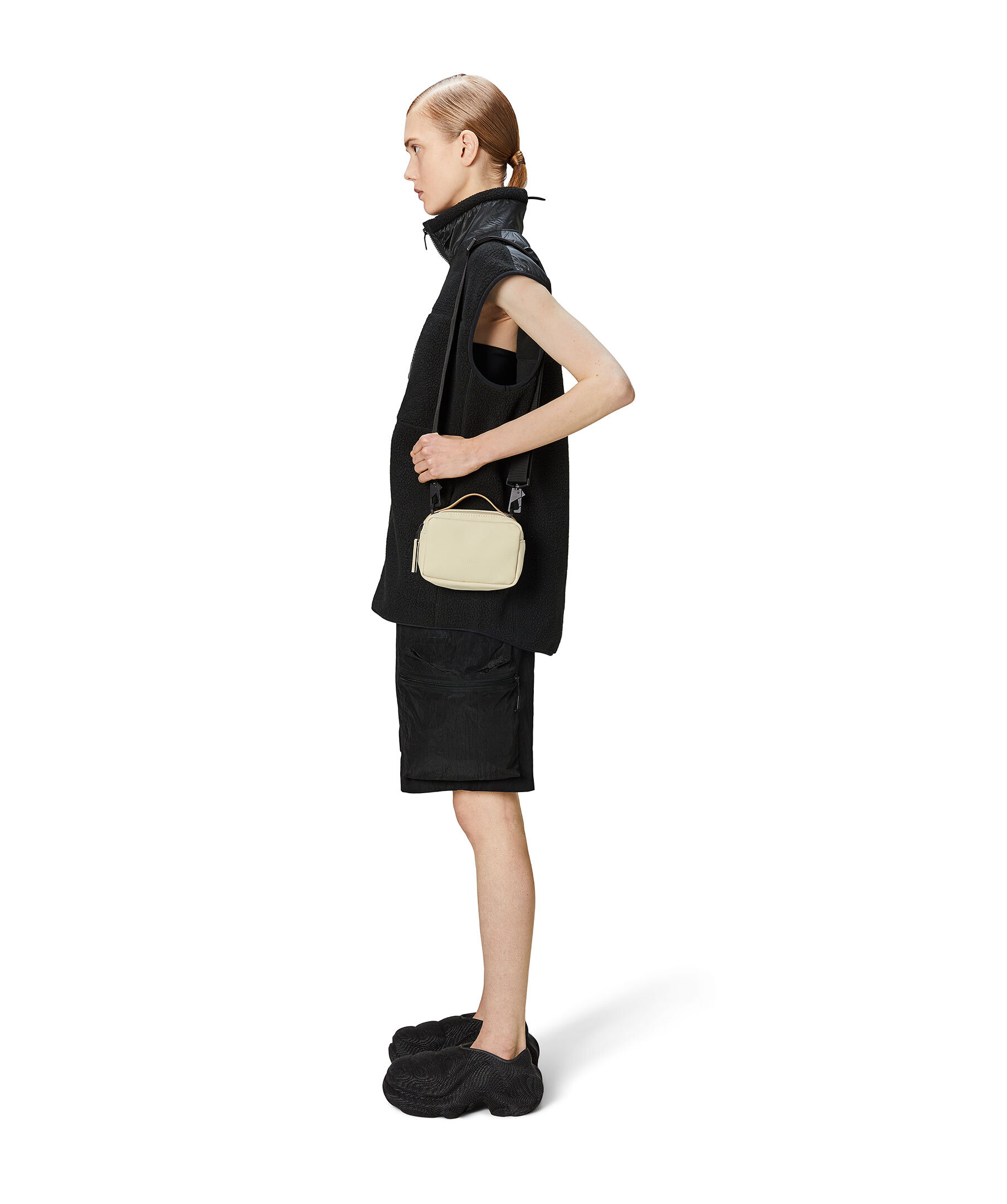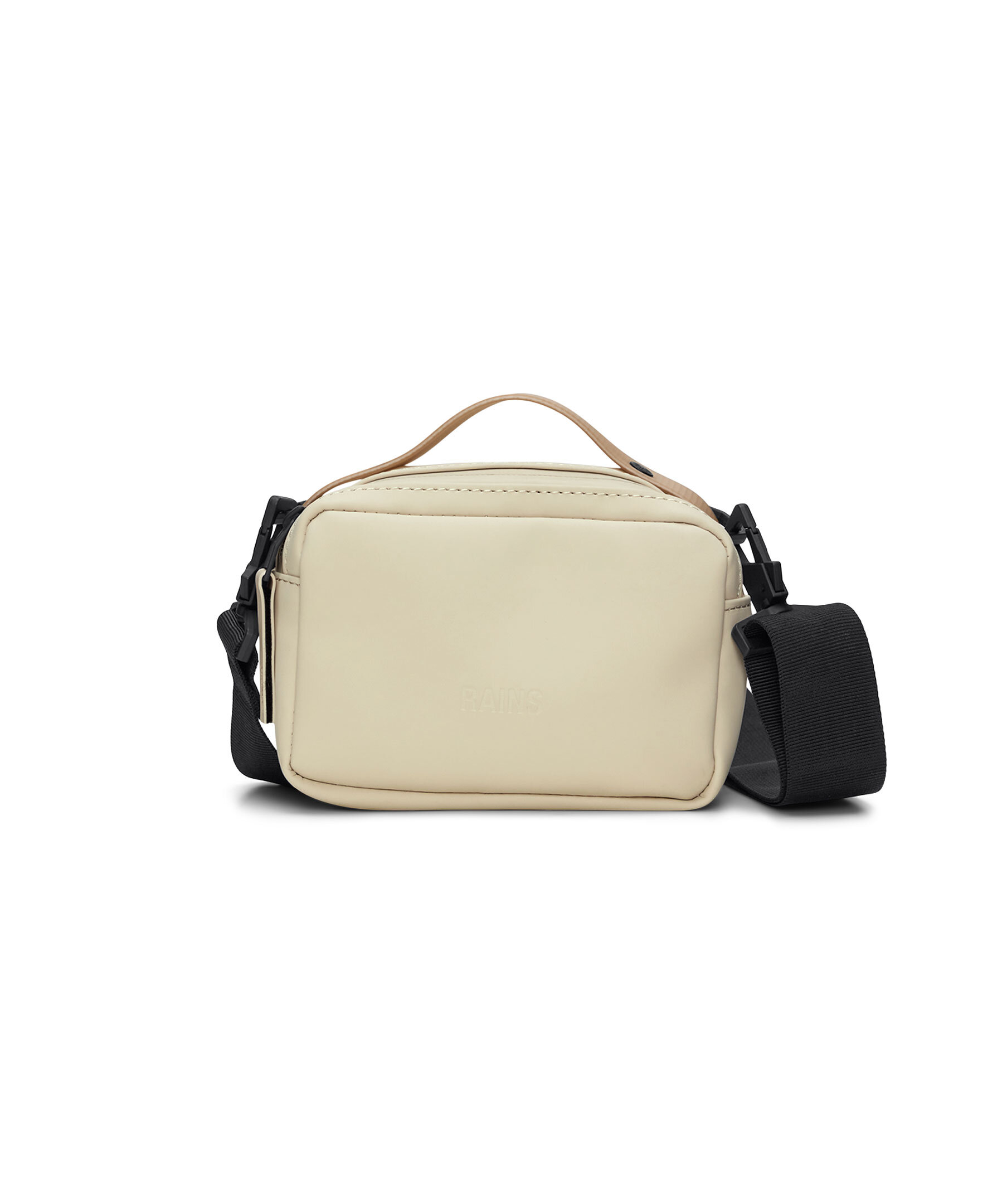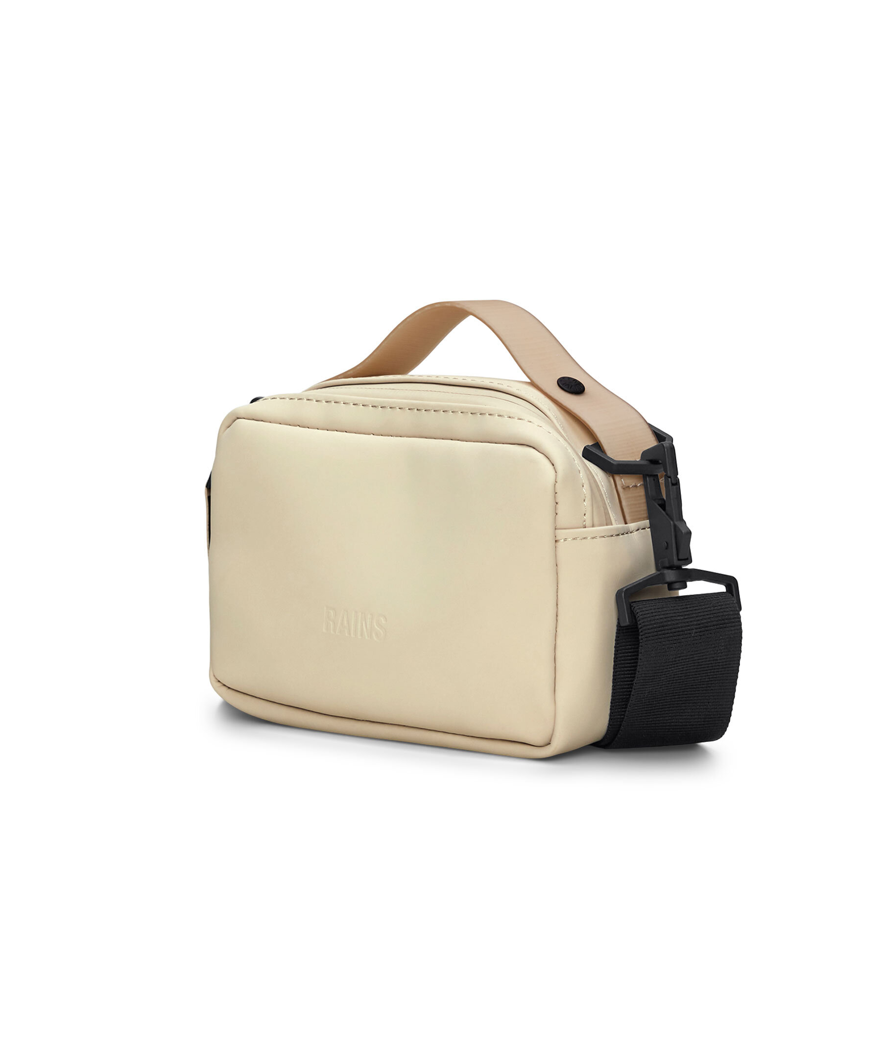 Sandfärgad liten vattentät väska från Rains. Kan bäras över axeln eller tvärs över kroppen. Huvudfacket stängs med dragkedja. Justerbar vävd axelrem med karbinhakar. Handtag i gummi. Embossad logotyp på väskans framsida. Väskans mått: H 11 x B 16 x D 7,5 cm. Väskan rymmer 1L.